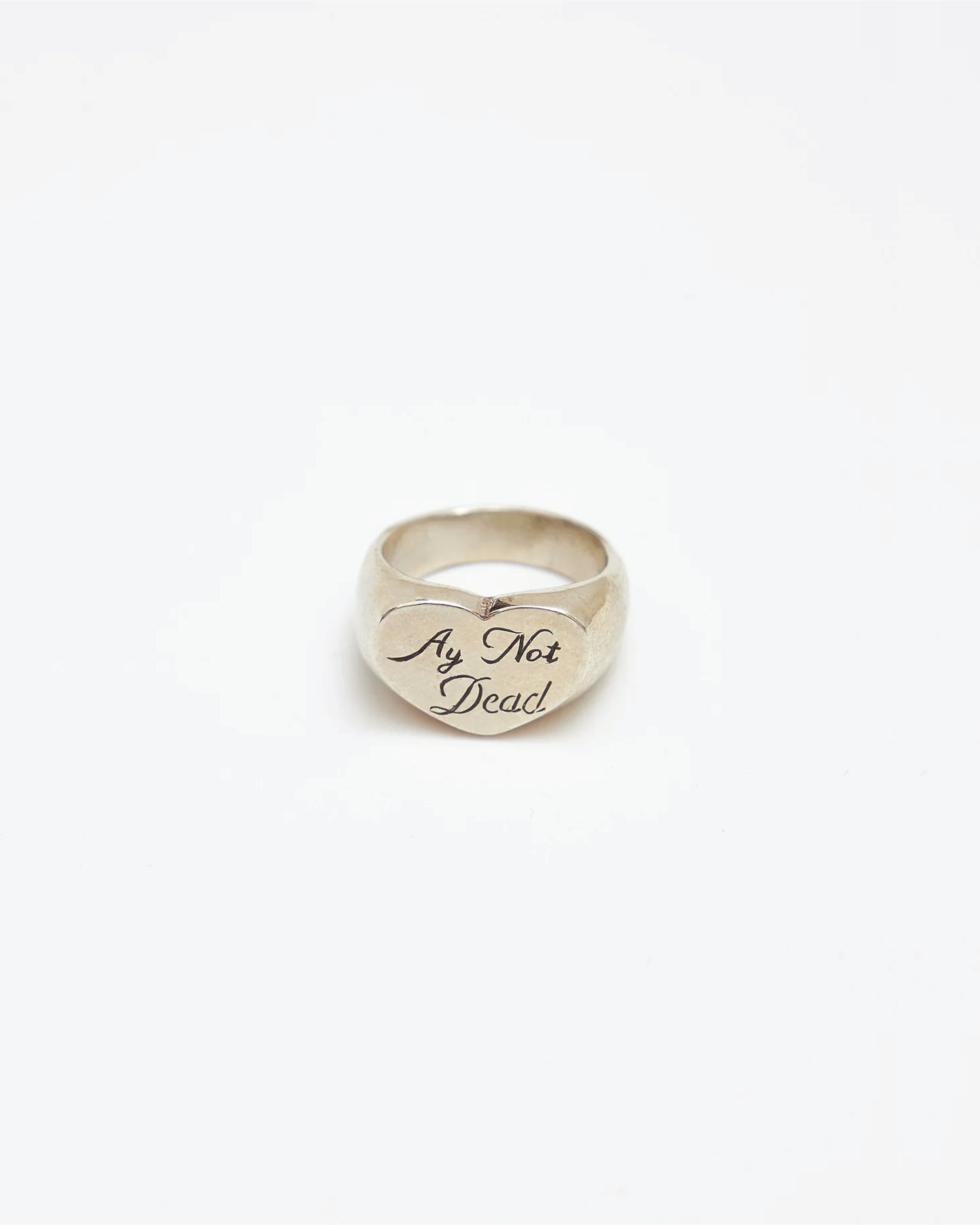 Anillo macizo de alpaca en forma de corazon, con logo de marca grabado en bajo relieve. Trabajo artesanal, hecho a mano.