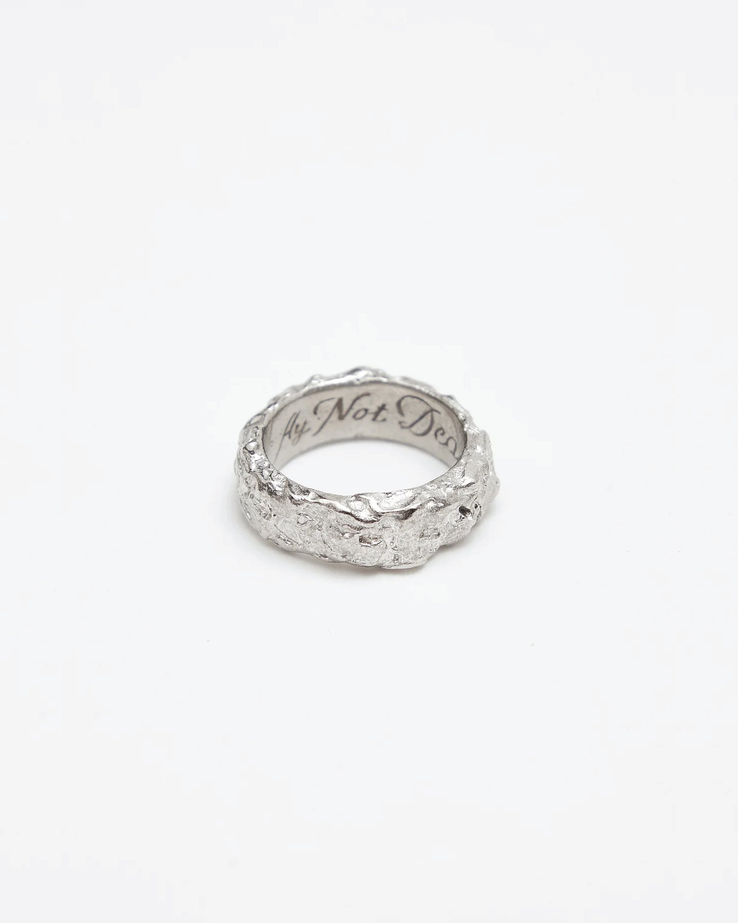 Anillo macizo de alpaca con textura, bañado en plata 925. Su cara interna lleva logo AYND grabado en bajo relieve. Pieza artesanal, trabajada mano.