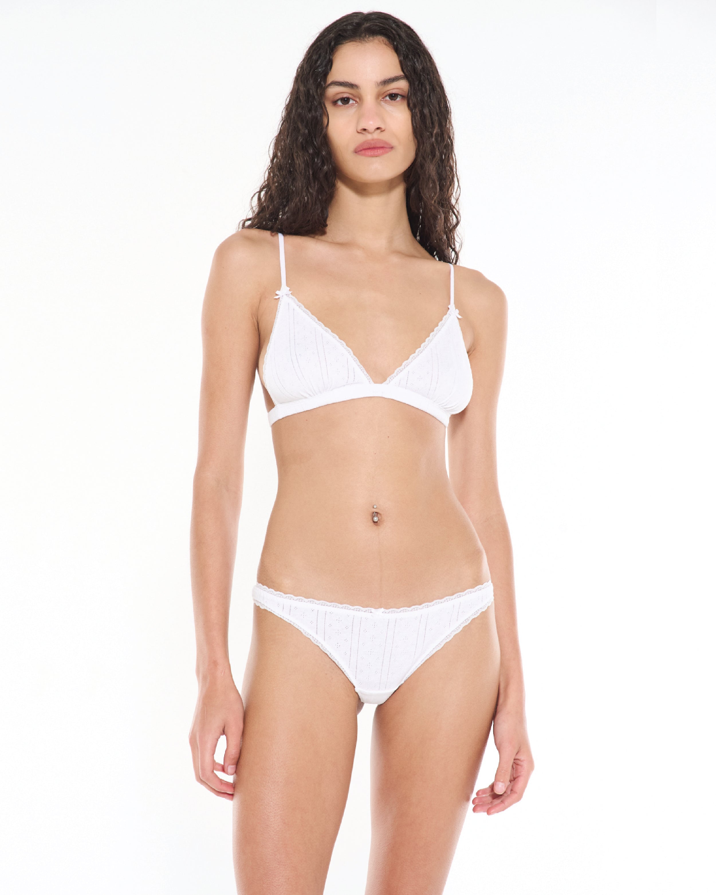 Bombacha colaless de jersey desagujado tipo 'pointelle'. Detalle de puntilla de encaje y moño en el centro.