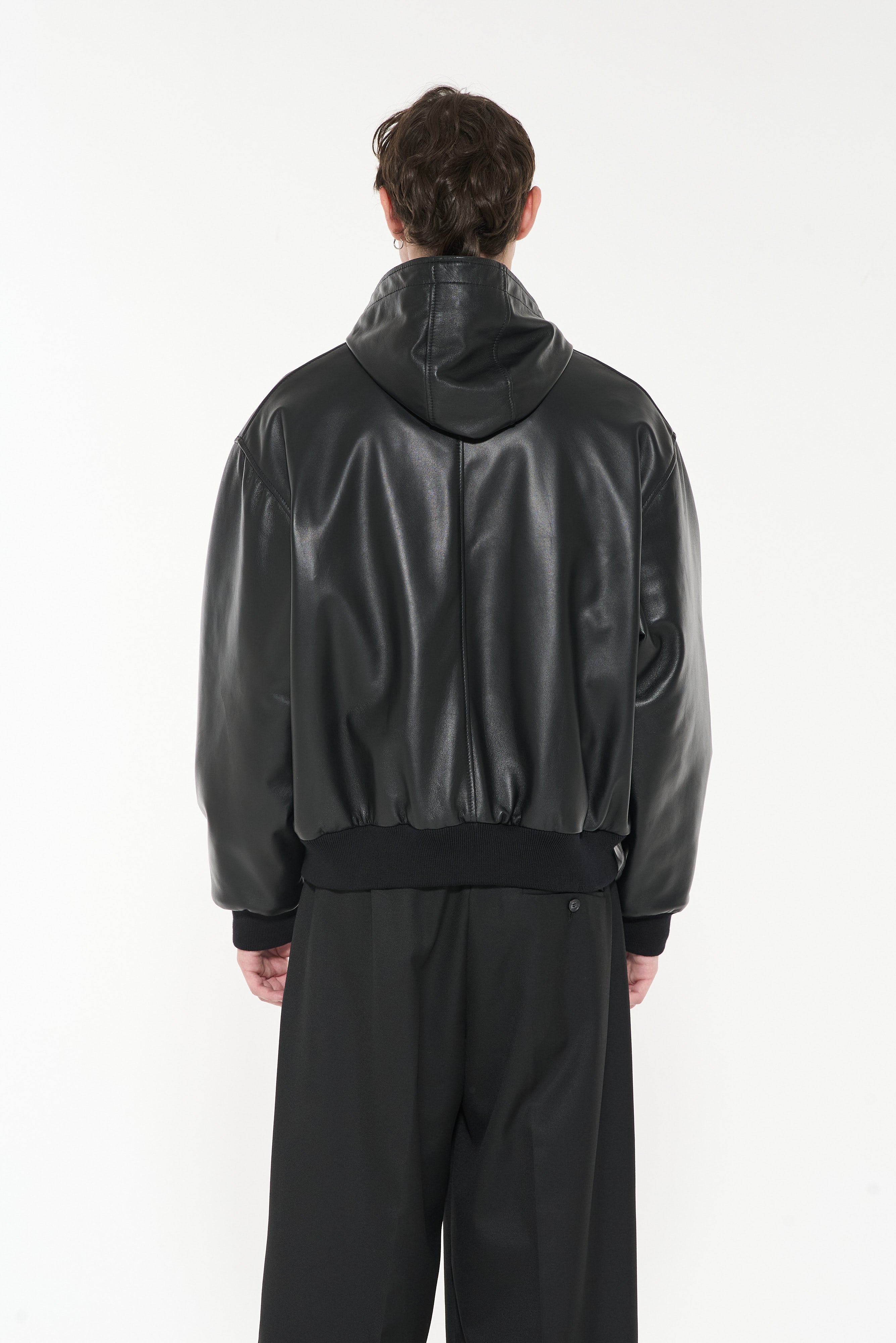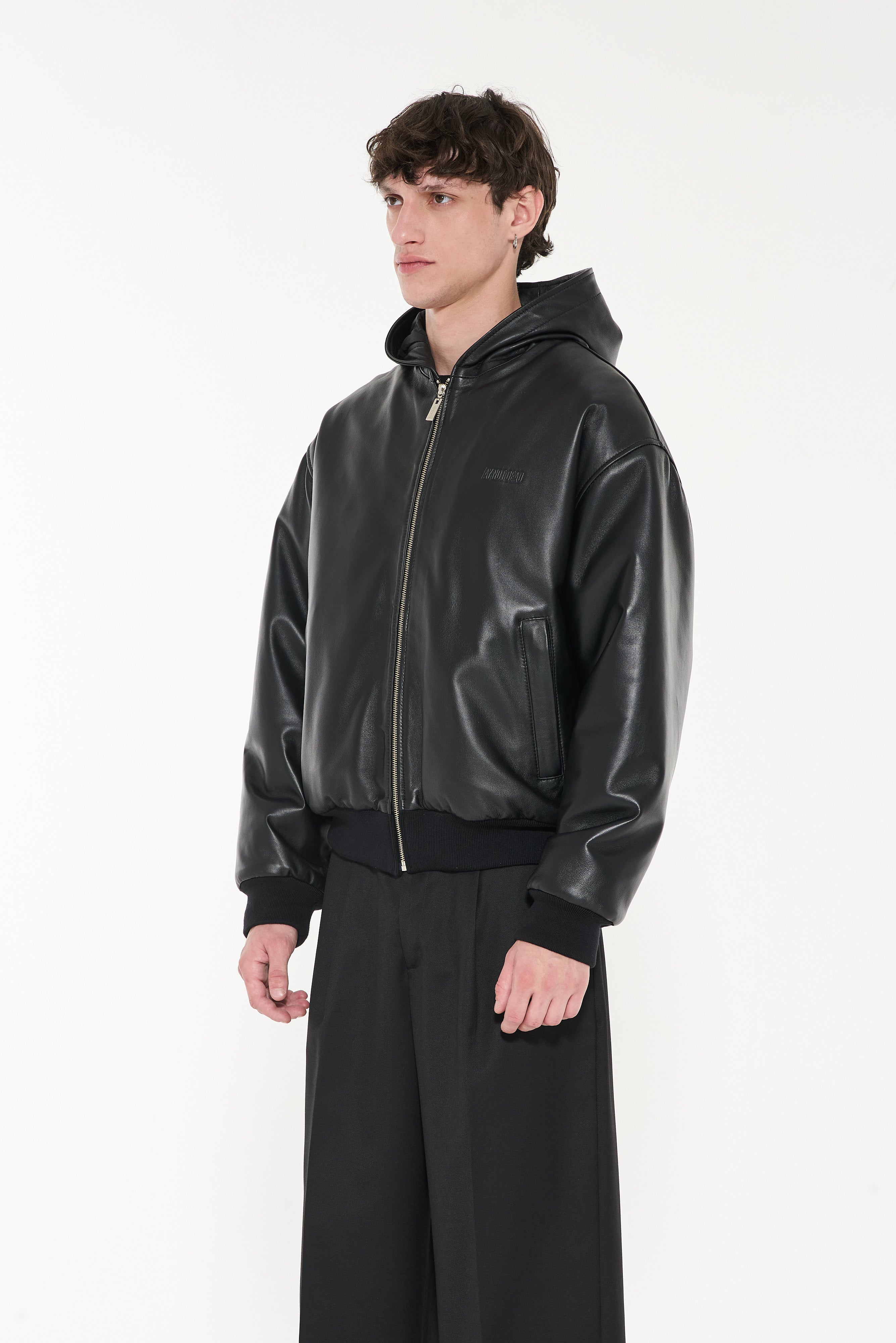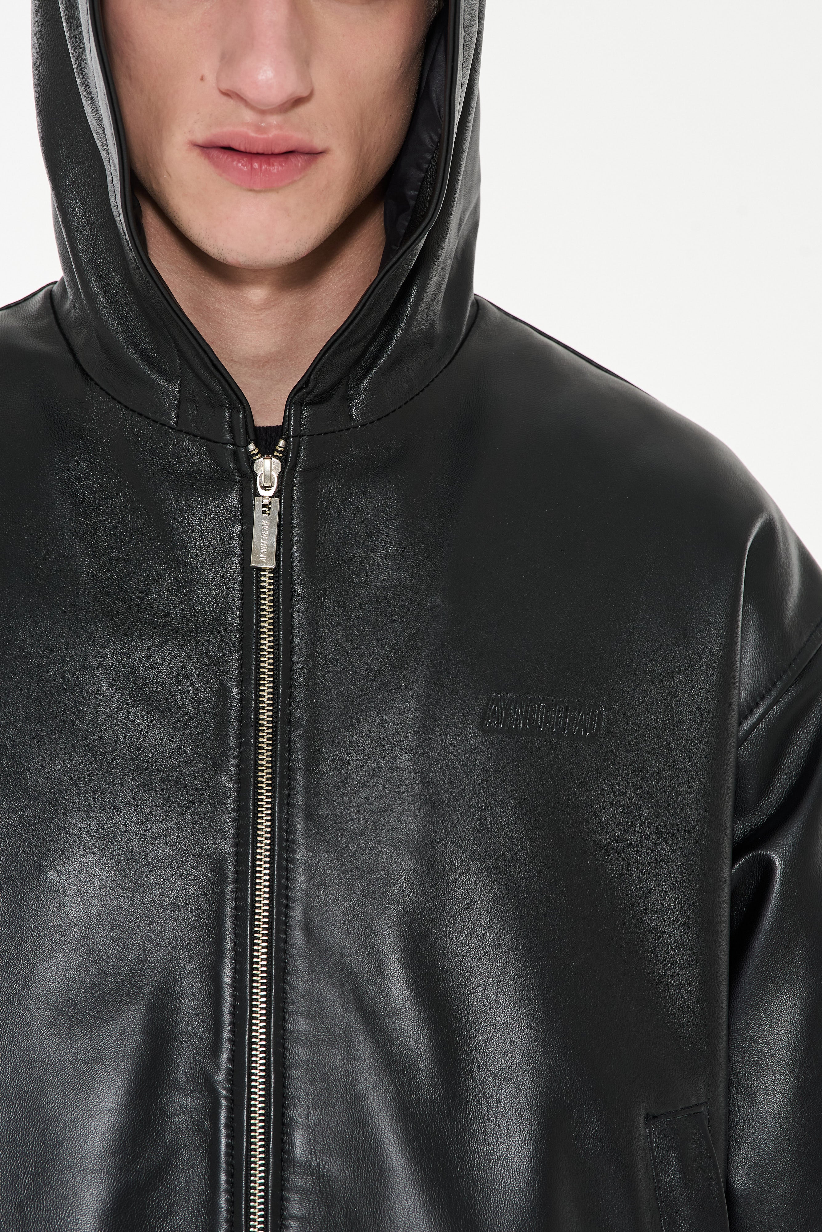 Campera bomber unisex de cuero con capucha desmontable. De calce relajado, con tejido ribb en puño de mangas y cintura. Lleva bolsillos con cierre en parte delantera. Interior forrado y matelaseado, con detalle de bolsillos ojales.