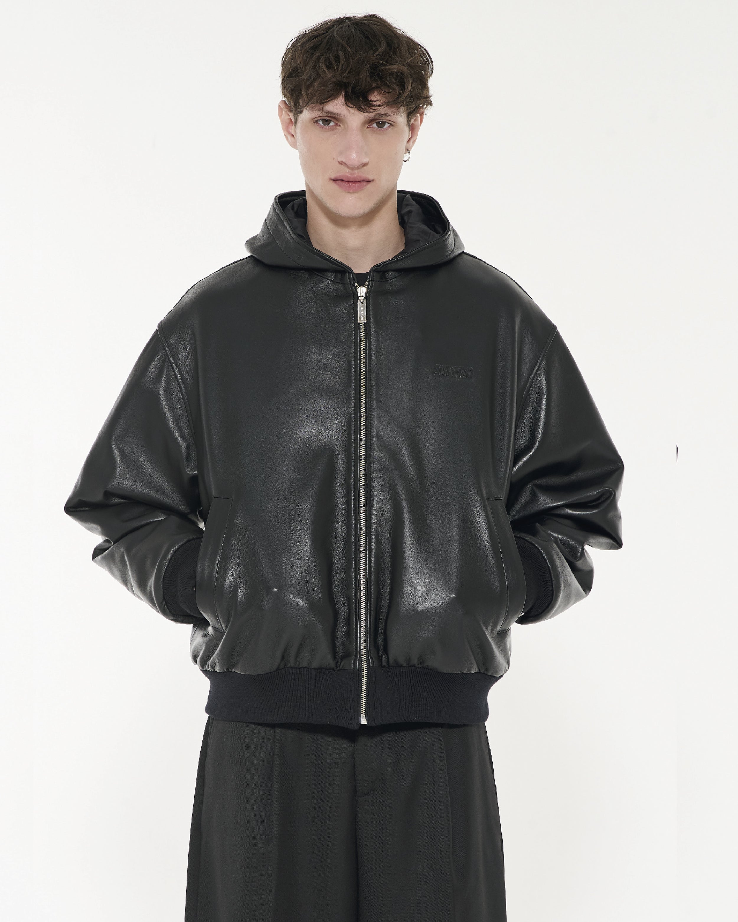 Campera bomber unisex de cuero con capucha desmontable. De calce relajado, con tejido ribb en puño de mangas y cintura. Lleva bolsillos con cierre en parte delantera. Interior forrado y matelaseado, con detalle de bolsillos ojales.