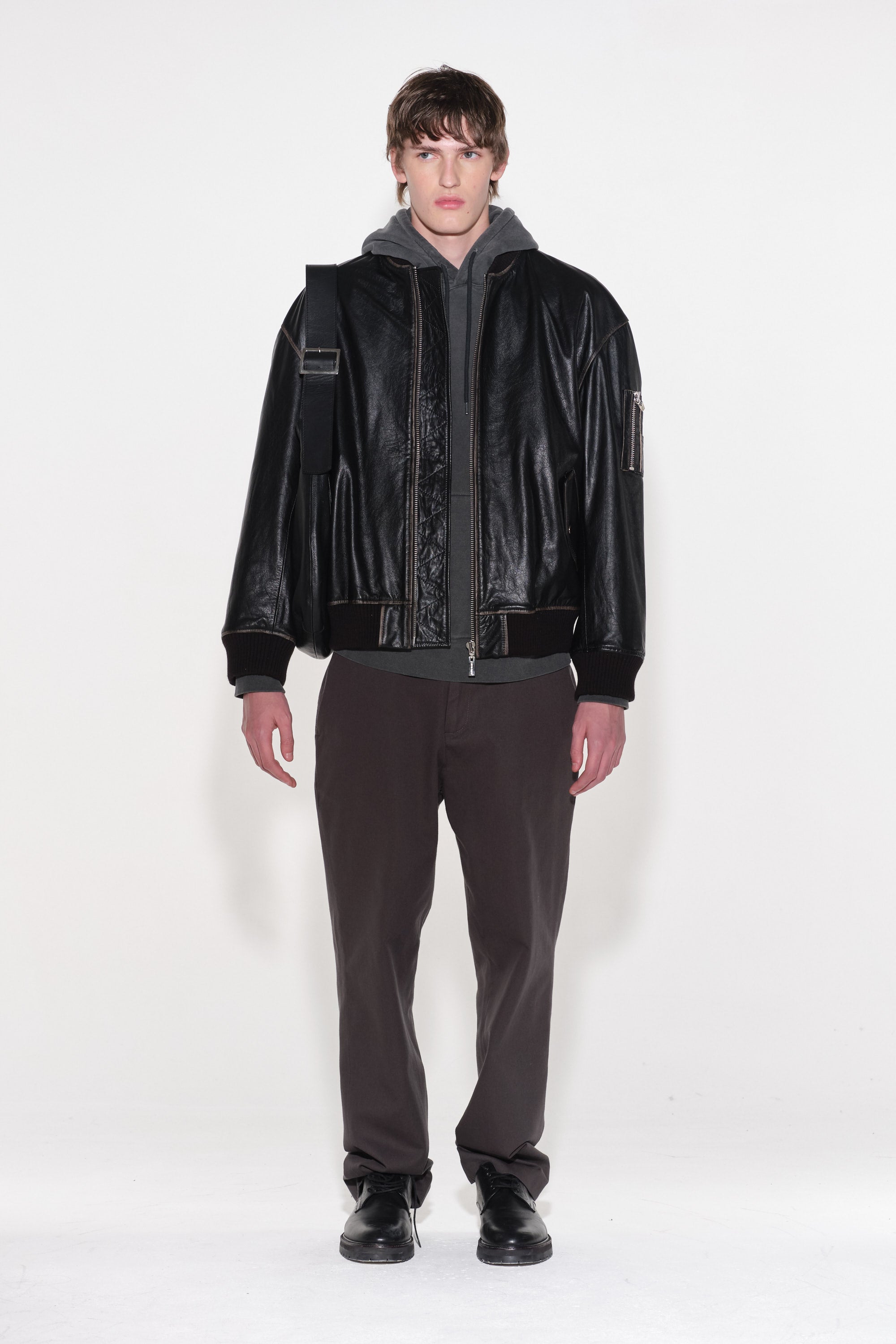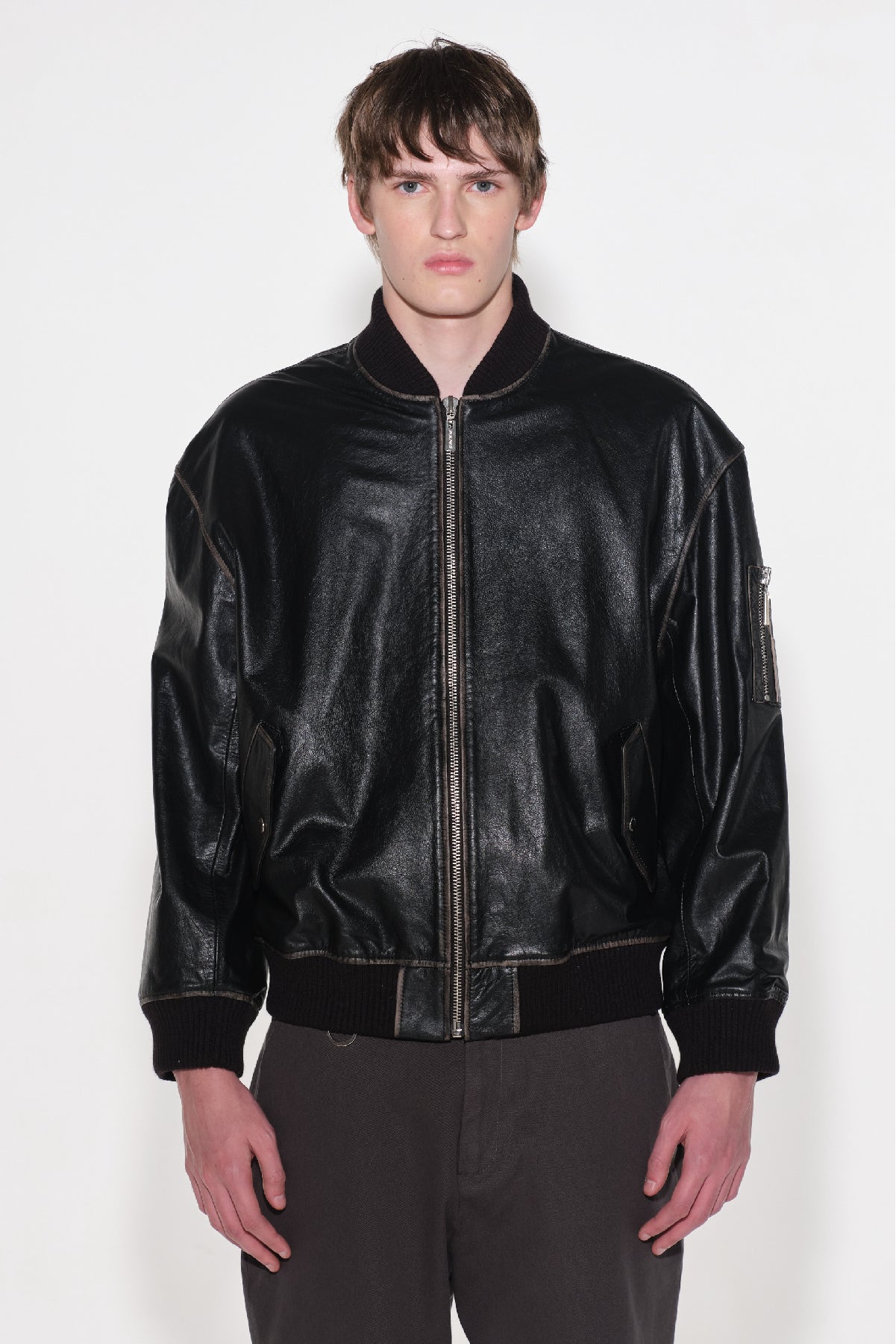 La Bomber Iggy Cuero está confeccionada en cuero vacuno con efecto gastado en costura, de silueta redondeada, largo a a primera cadera y presenta bolsillos delanteros con tapa, snaps personalizados a la vista, bolsillo plaque en manga con cierre metálico, posee puños, cintura y cuello tejidos en ribb a tono, acceso mediante cierre metálico central y está forrada con tafeta personalizada AYND.