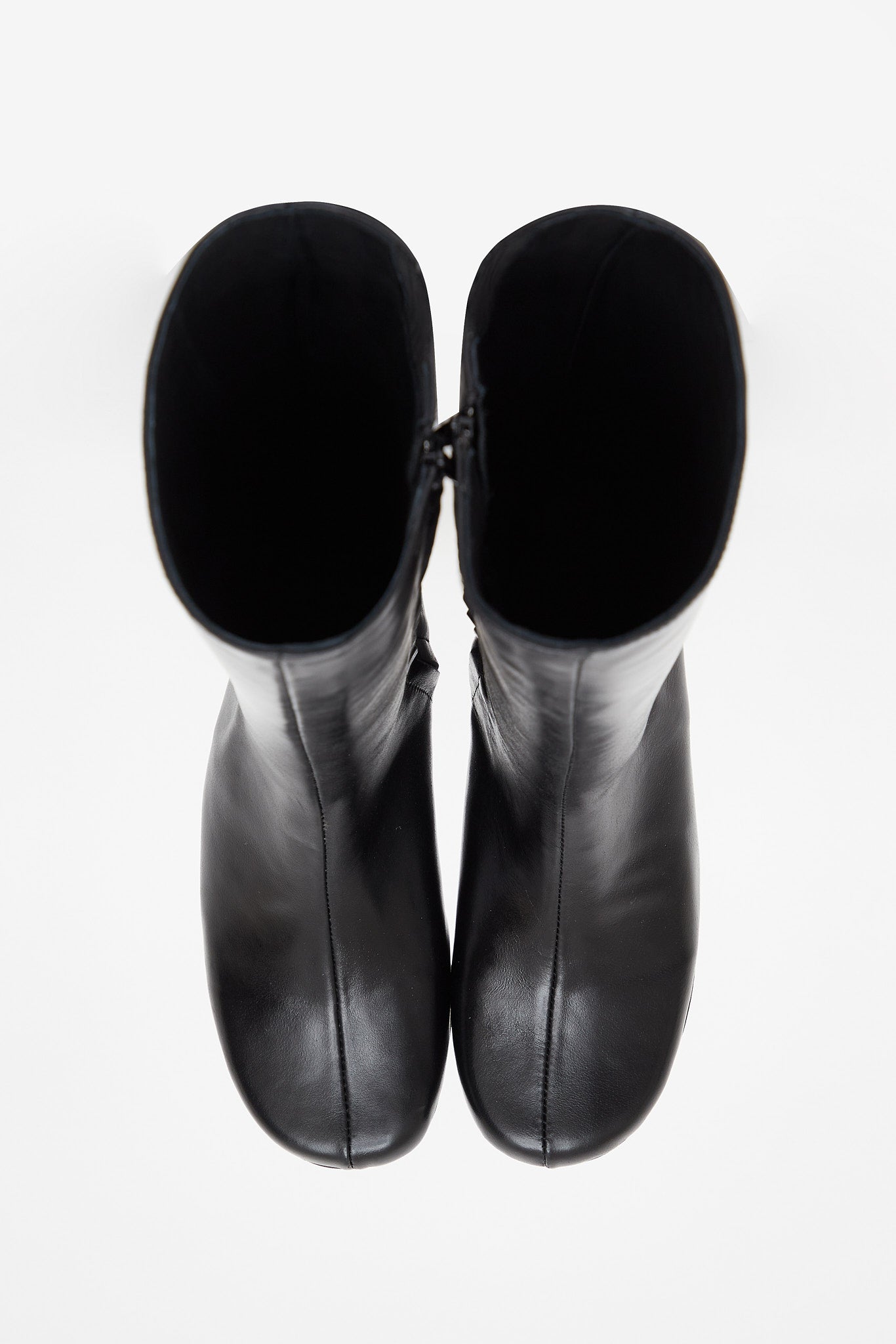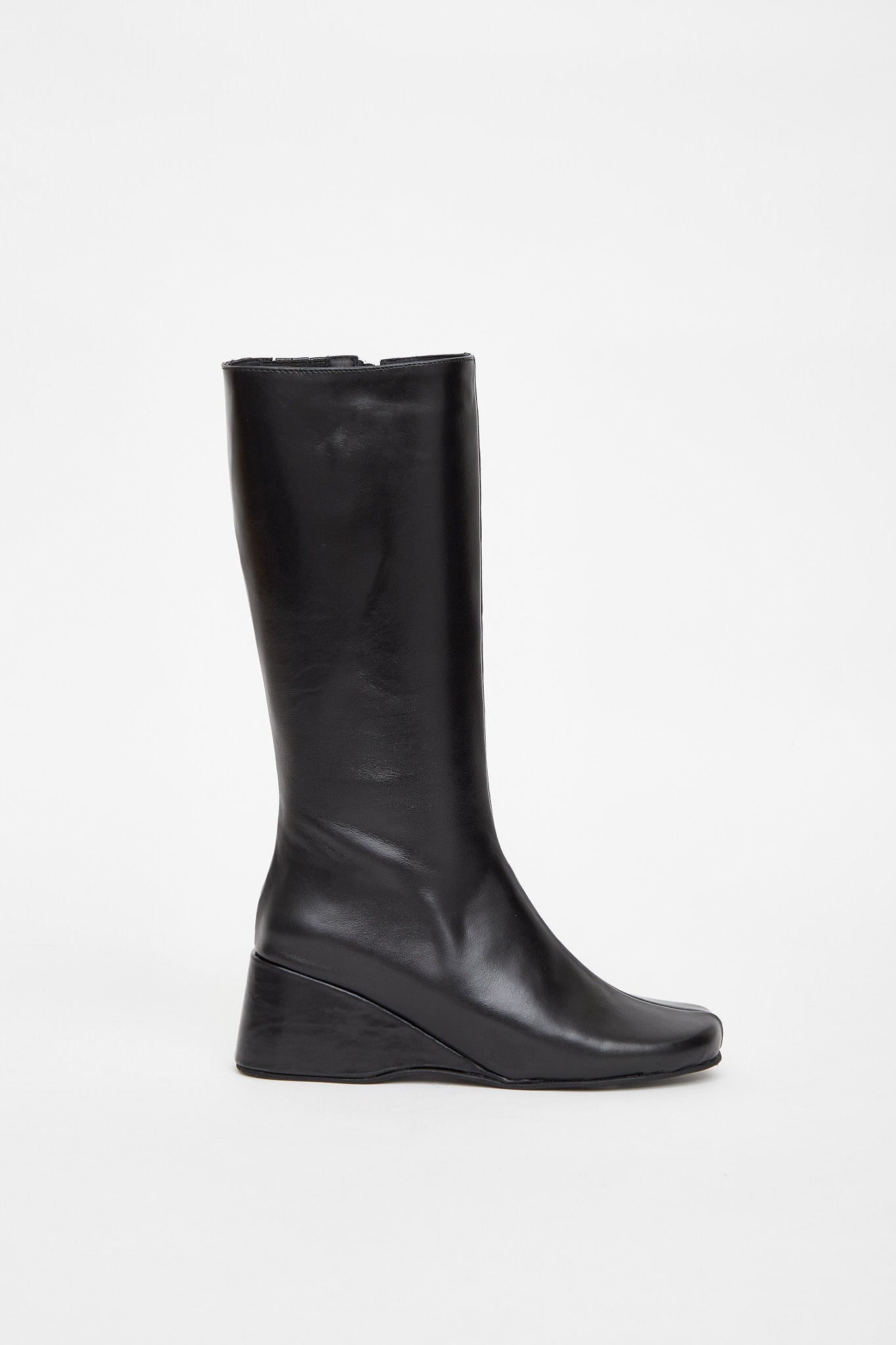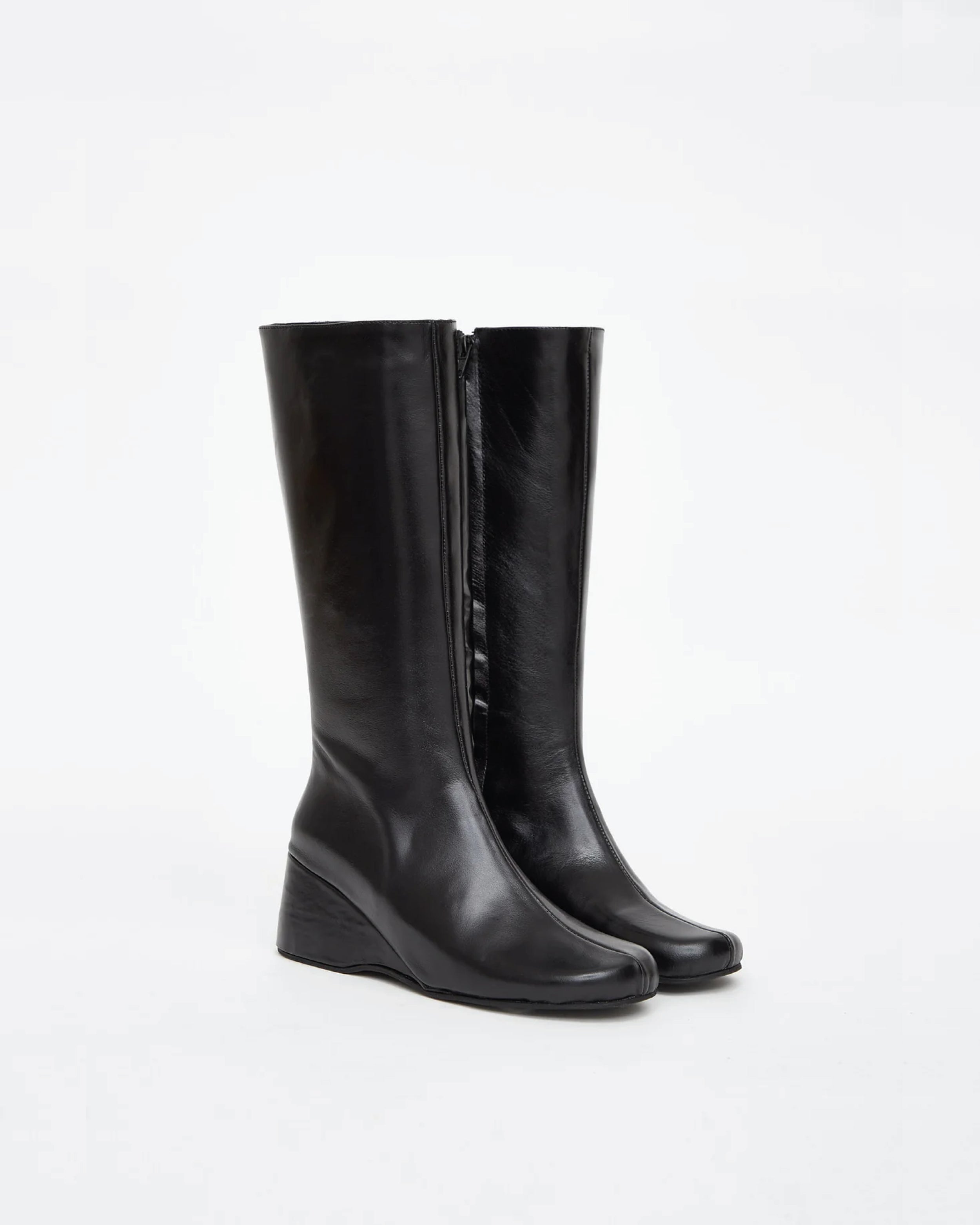 Bota de cuero con acabado brilloso y taco chino forrado. Lleva cierre a tono en cara interna, por debajo de las rodillas, y costura central. Forrada en cuero vacuno.