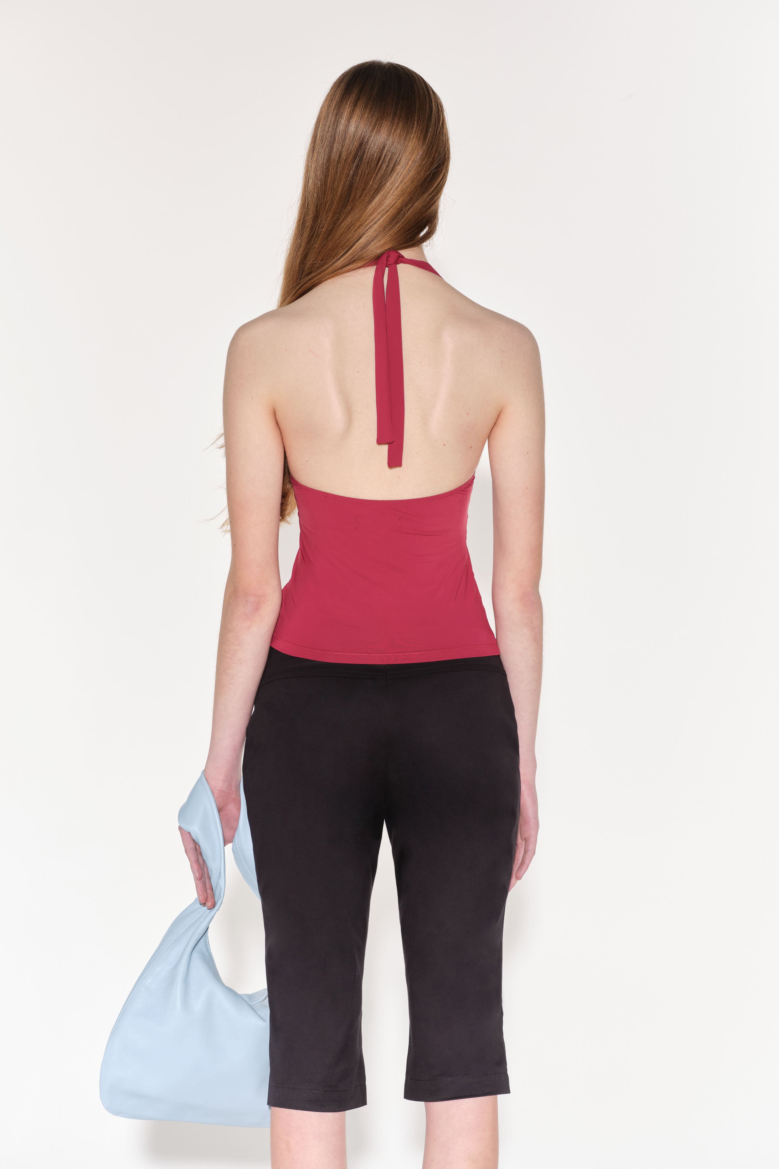 Capri de gabardina tiro bajo, de largo por debajo de la rodilla. Tiene detalle de canesú en dorso, falsos bolsillos ojal en delantero y cierre a tono con dos ganchos.