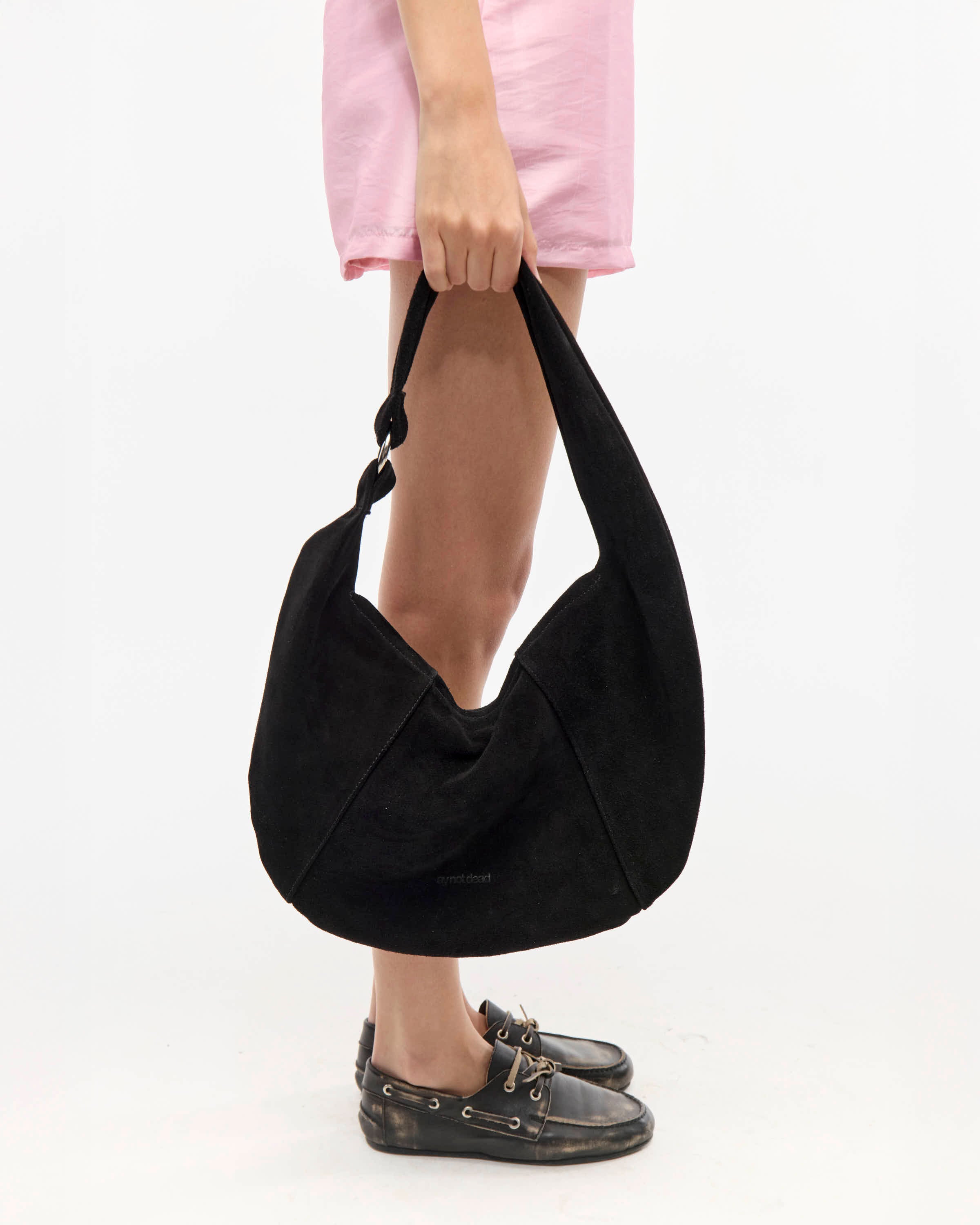 Cartera realizada en gamuza vacuna. De forma redondeada con recortes en diagonal en ambas caras y manija continua fija con arandela metálica, para colgar en hombro. Acceso mediante cierre metálico a tono con deslizador personalizado. Posee bolsillo interno con cierre y lleva logo Ay not dead grabado en bajo relieve en el delantero.