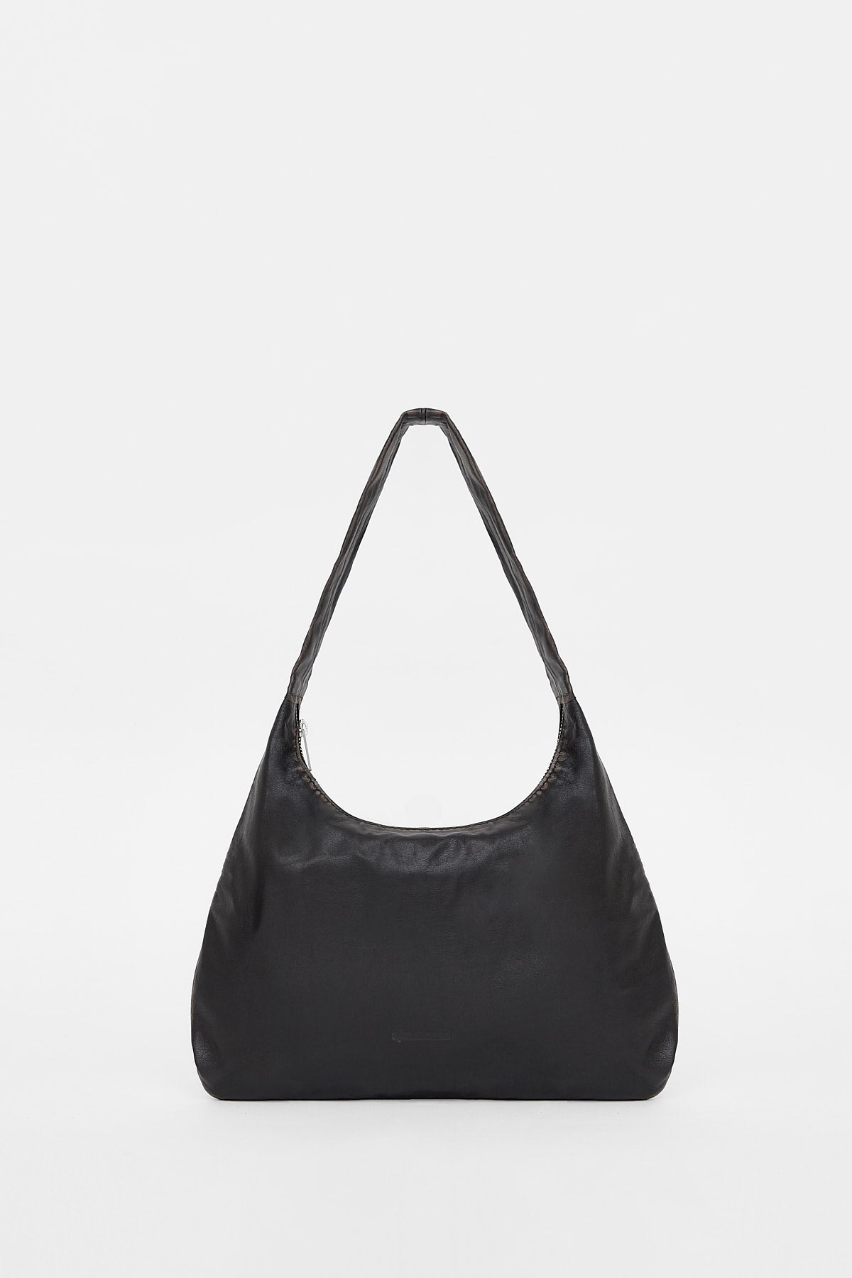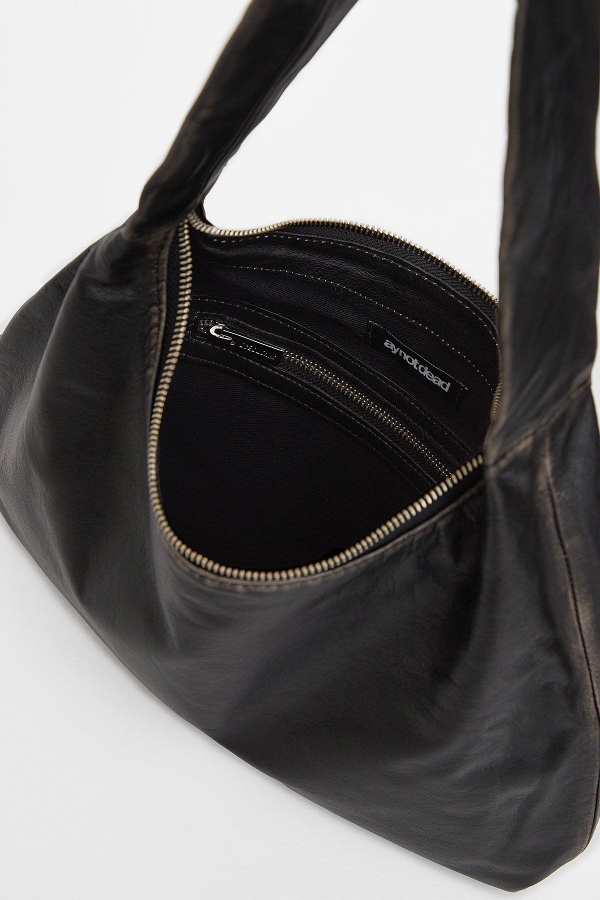 Cartera de cuero con efecto gastado en costuras. De forma redondeada, con logo AYND grabado en cara frontal y bolsillo con cierre interno. Lleva correa ancha de cuero para colgar al hombro, y cierre metálico a tono con deslizador personalizado.