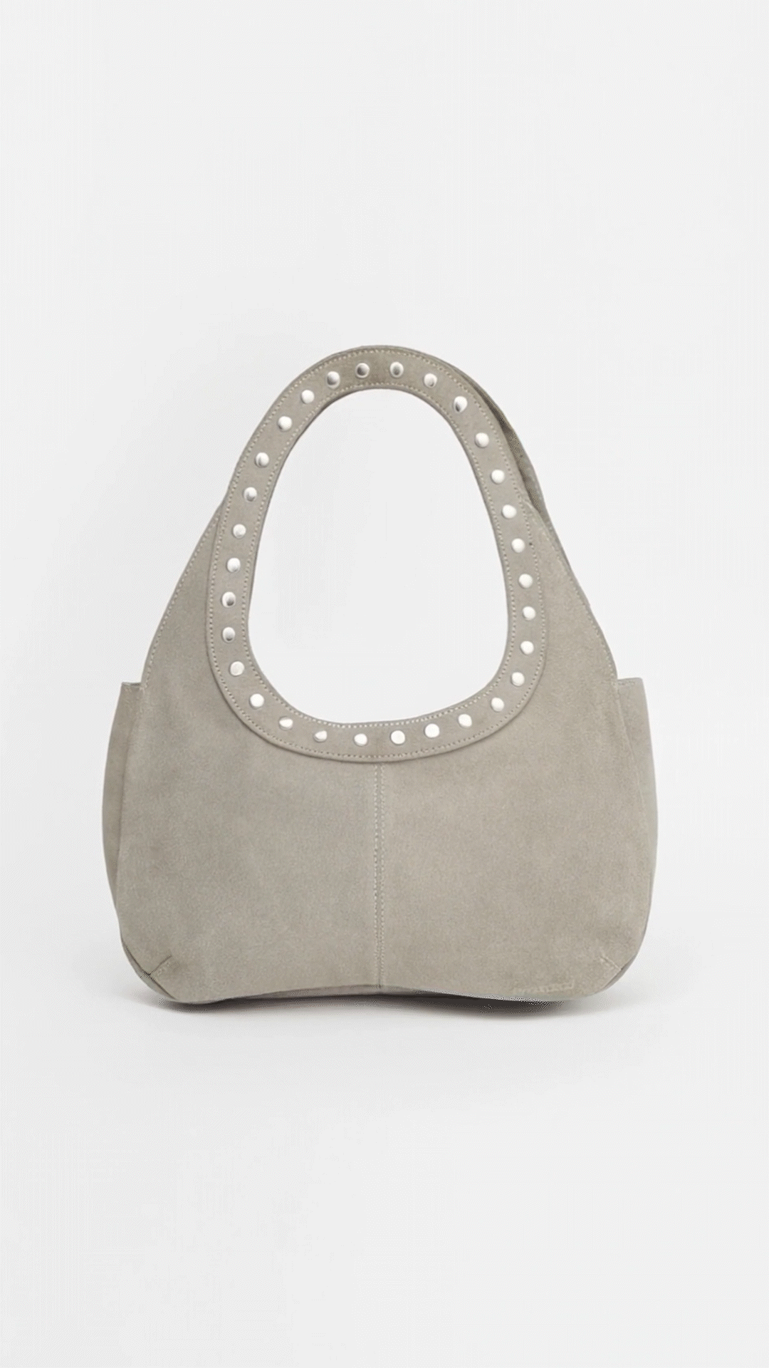 Cartera realizada en gamuza vacuna. De forma redondeada y manijas de cuero base con remaches metalicos decorativos, para colgar en hombro. Posee un recorte central en ambas caras y logo Ay not dead grabado en bajo relieve en el delantero. Lleva bolsillo interno y su acceso es mediante broche iman ubicado en boca de cartera.