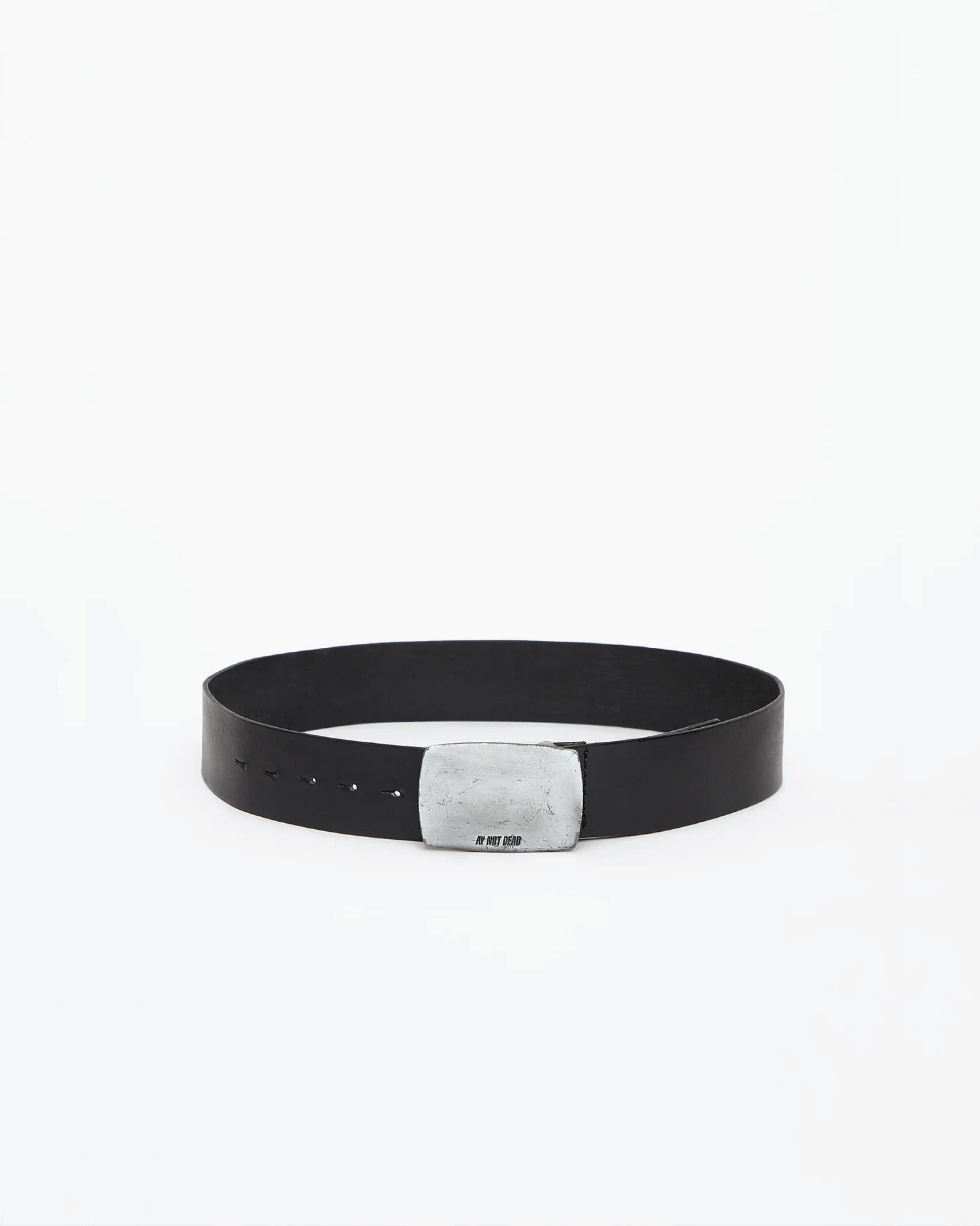 Cinturón negro de cuero, con hebilla metálica AYND personalizada color plata gastado.