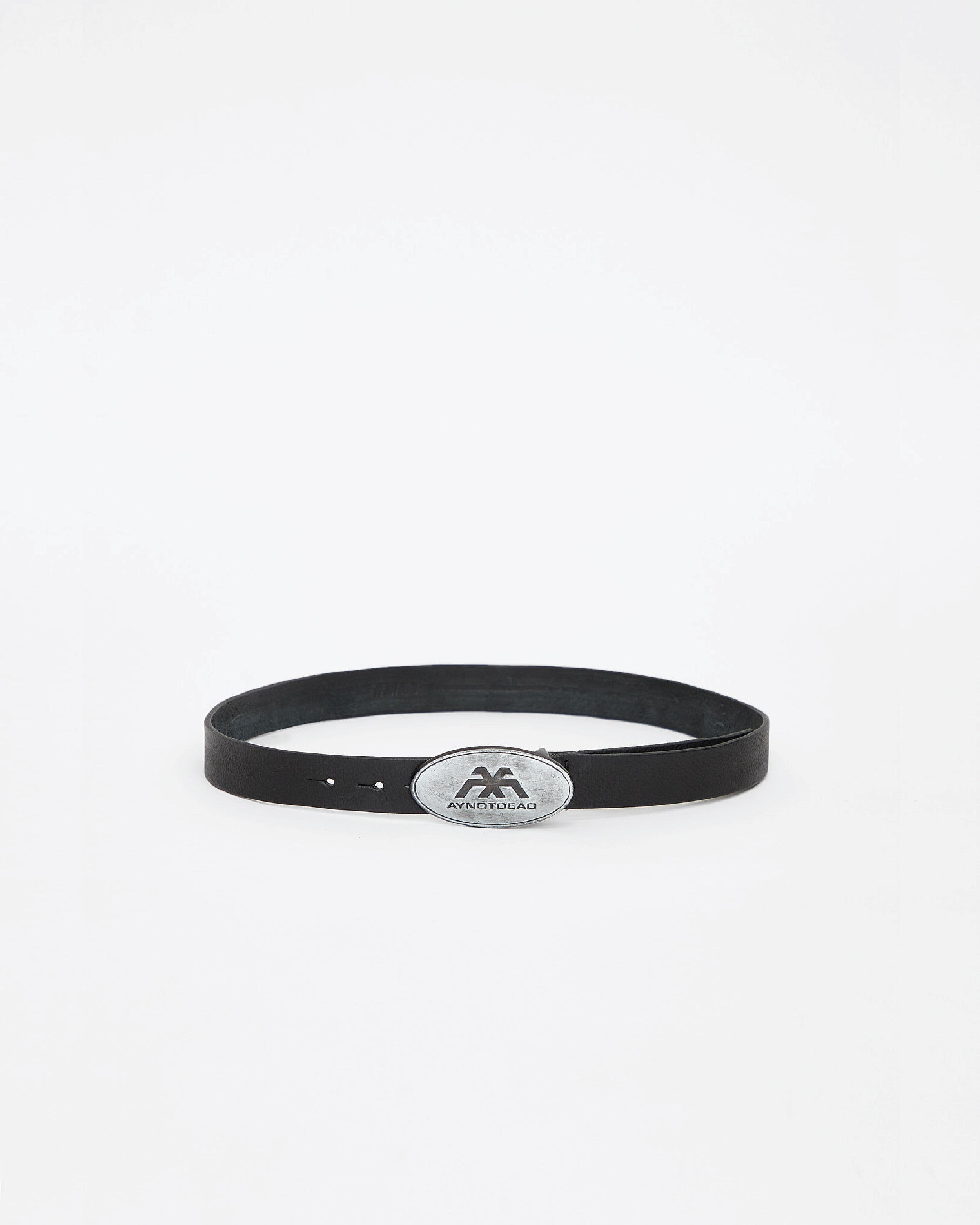 Cinturón de cuero vacuno negro liso, de 3 cm de ancho, posee hebilla Ay not dead personalizada, metálica color plata gastado, con forma ovalada. Lleva 8 orificios para regular su largo.