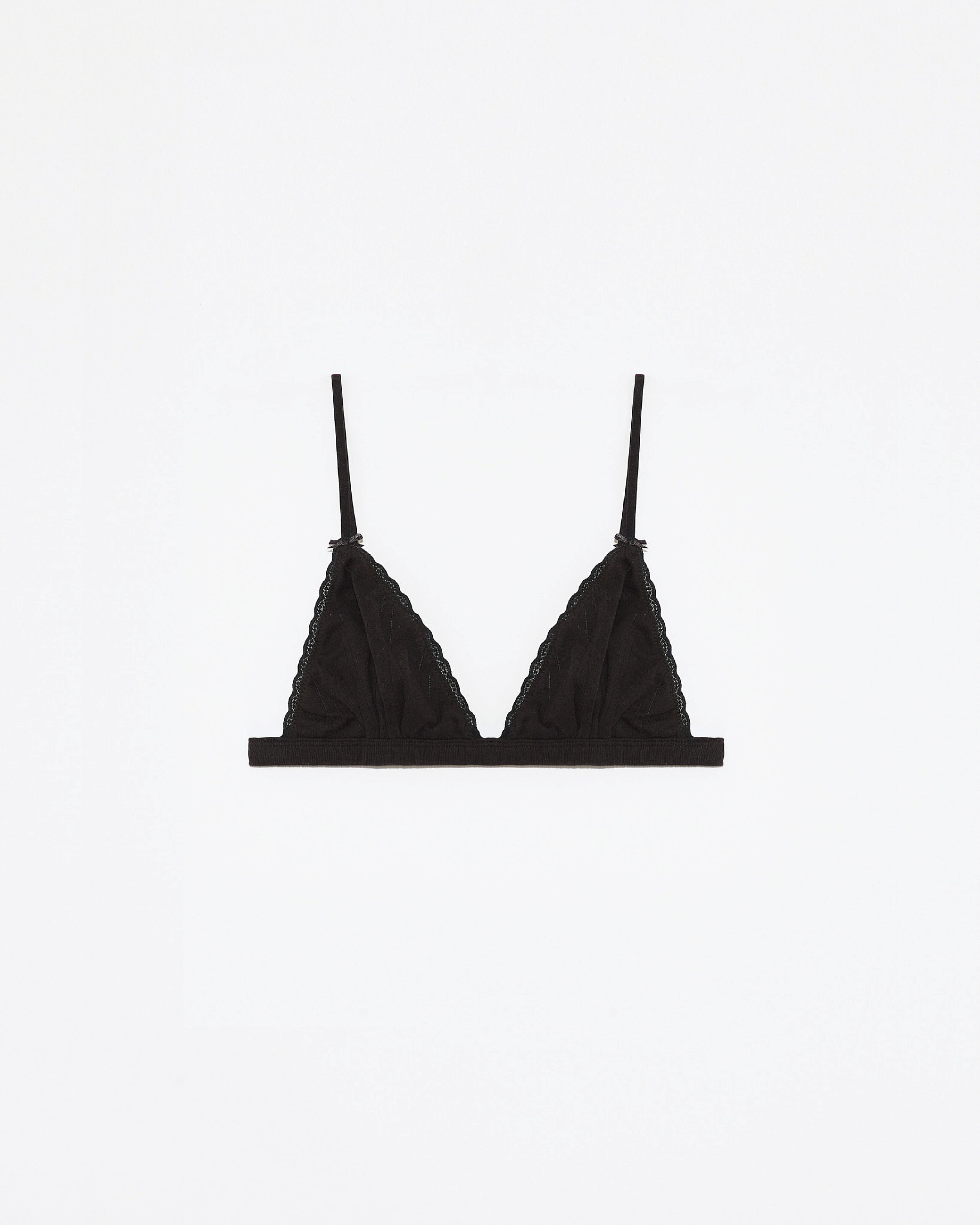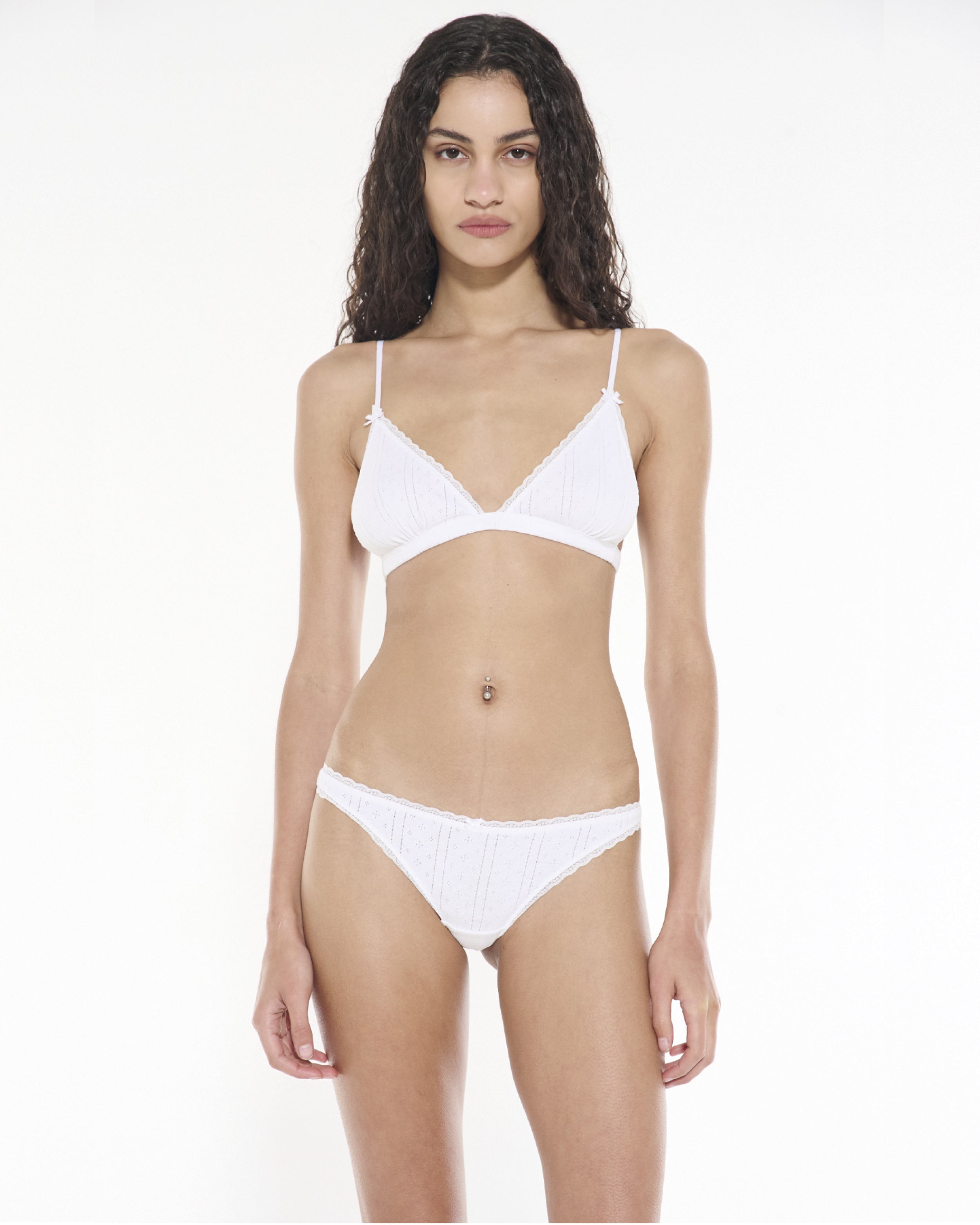 Corpiño triángulo tipo 'pointelle', con puntilla de encaje en escote y detalle de moño. Sus breteles elastizados son regulables.