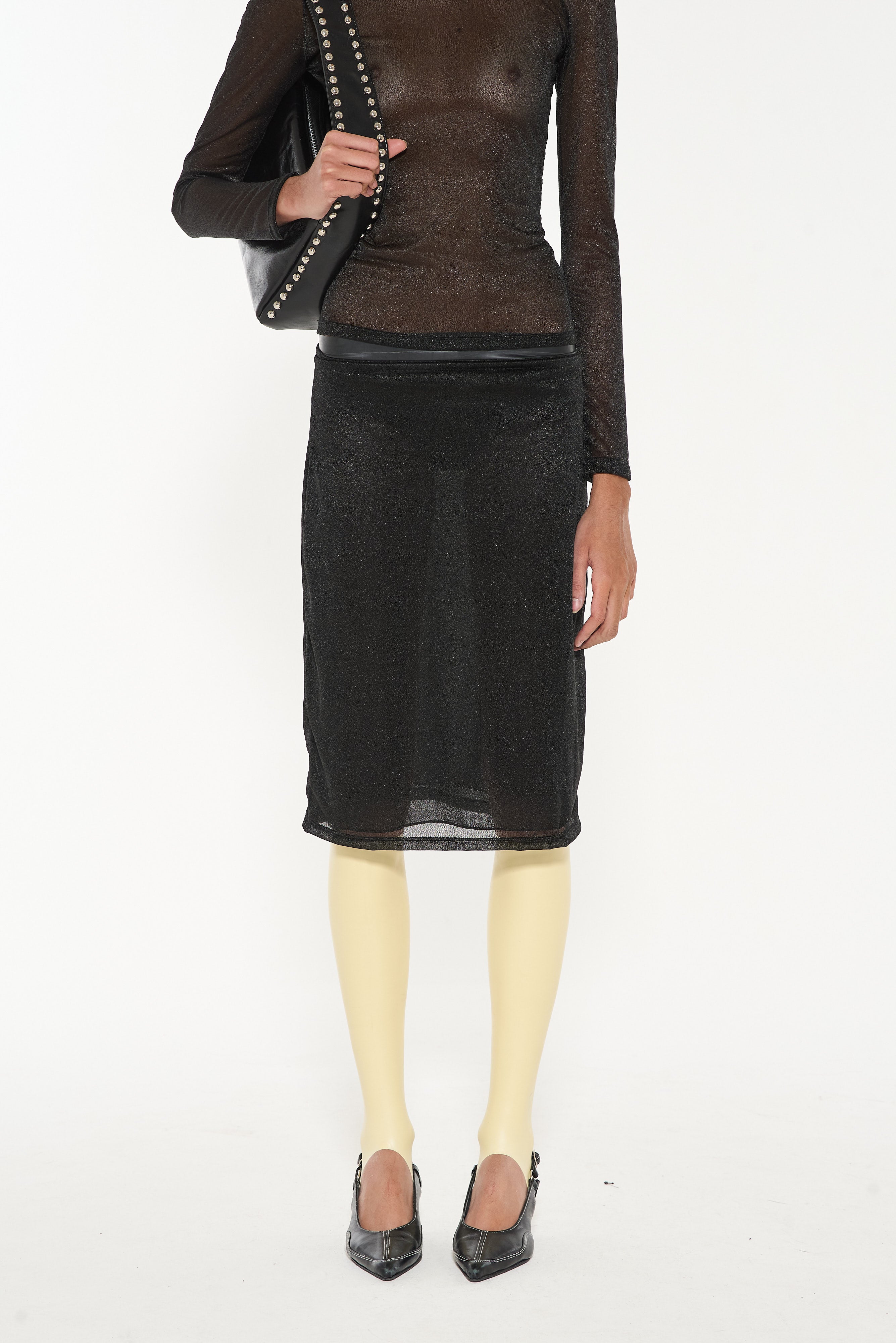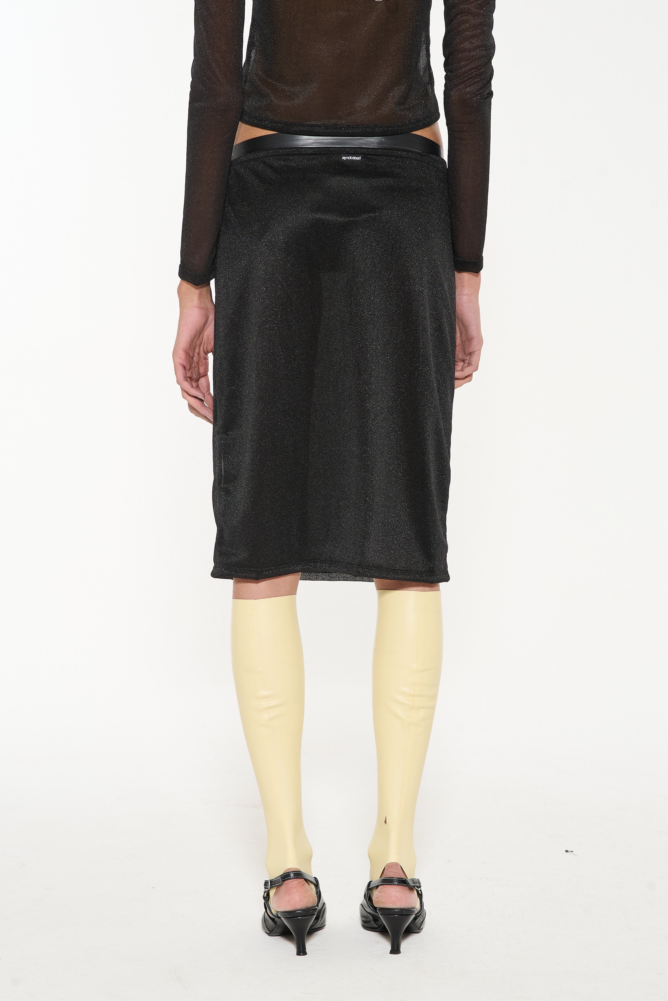 Falda confeccionada en textil brilloso y traslucido. Contiene un viso de tela base, separable, para usar con mayor o menor transparencia. Calce al cuerpo y largo hasta debajo de las rodillas.