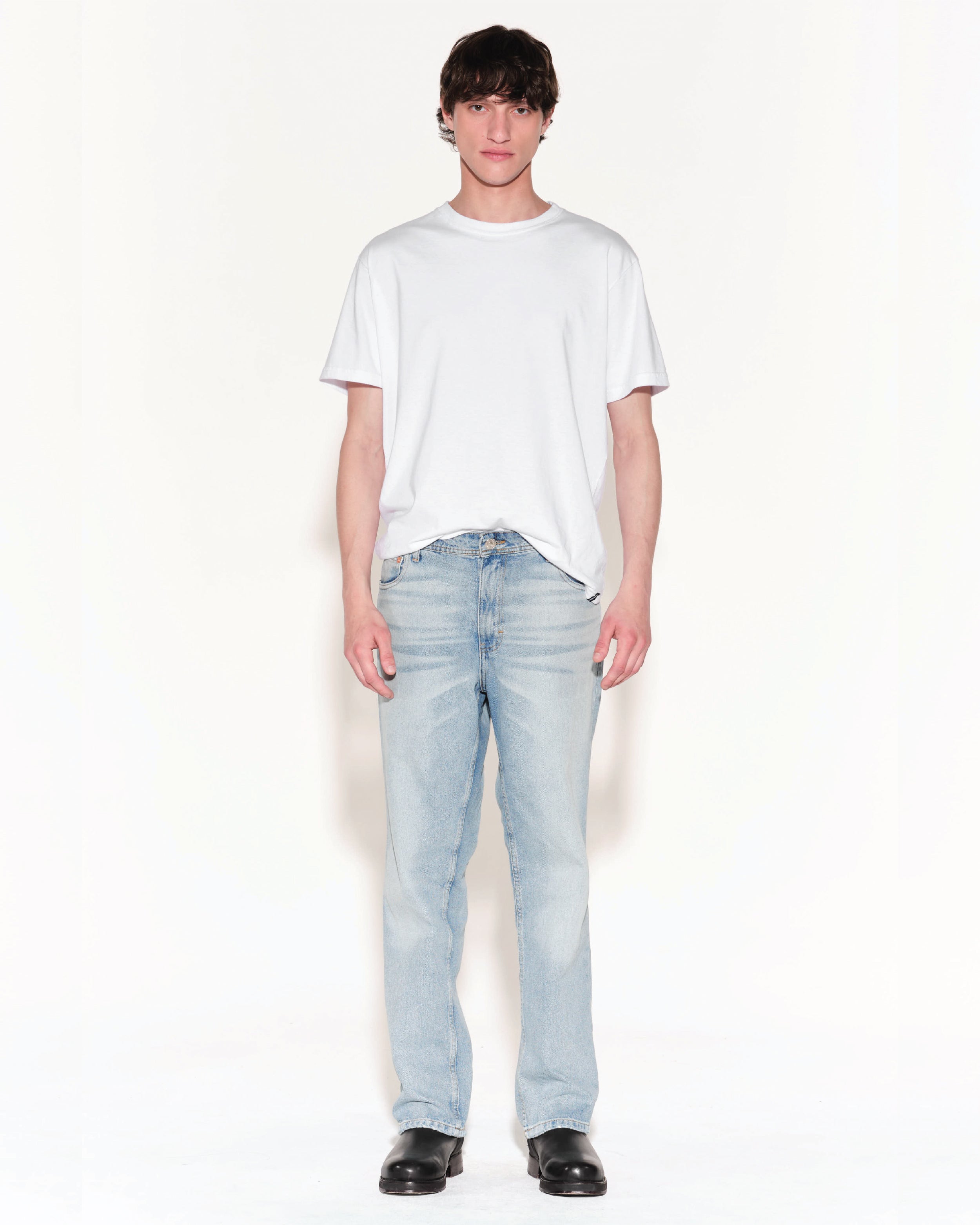 Jean 5 bolsillos, tejido 100 % algodón de peso intermedio, lavado azul claro gastado, con suaves bigotes.