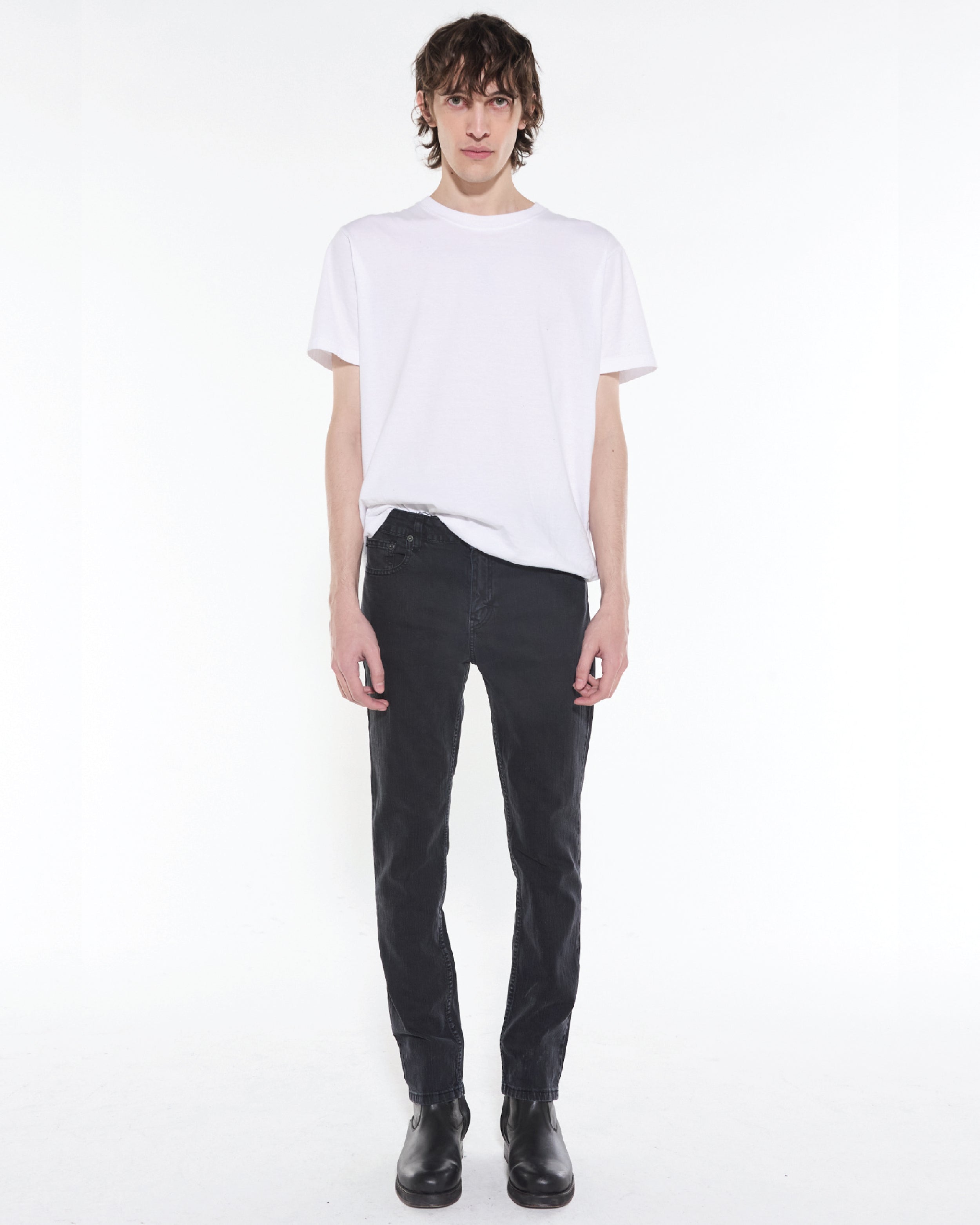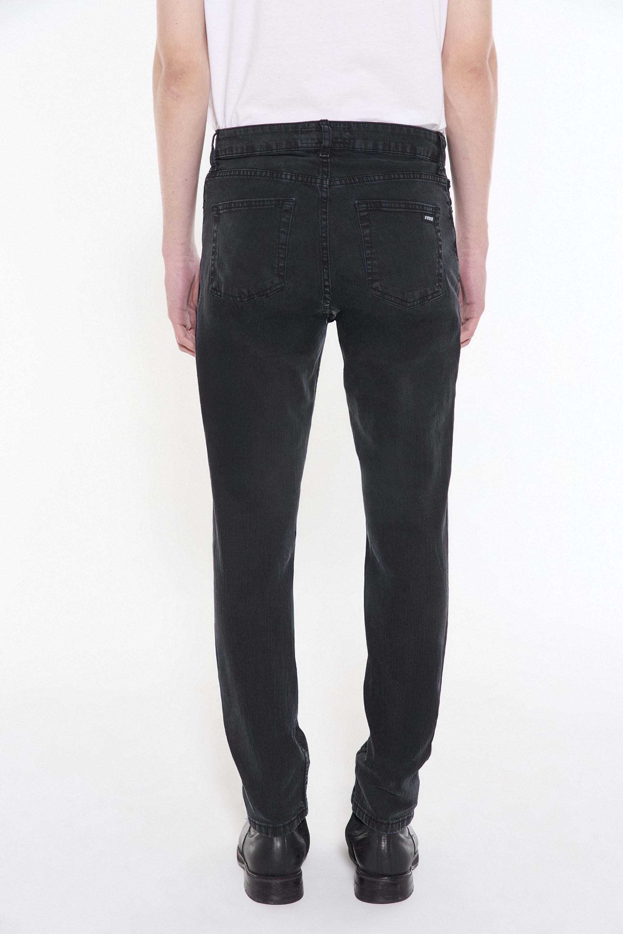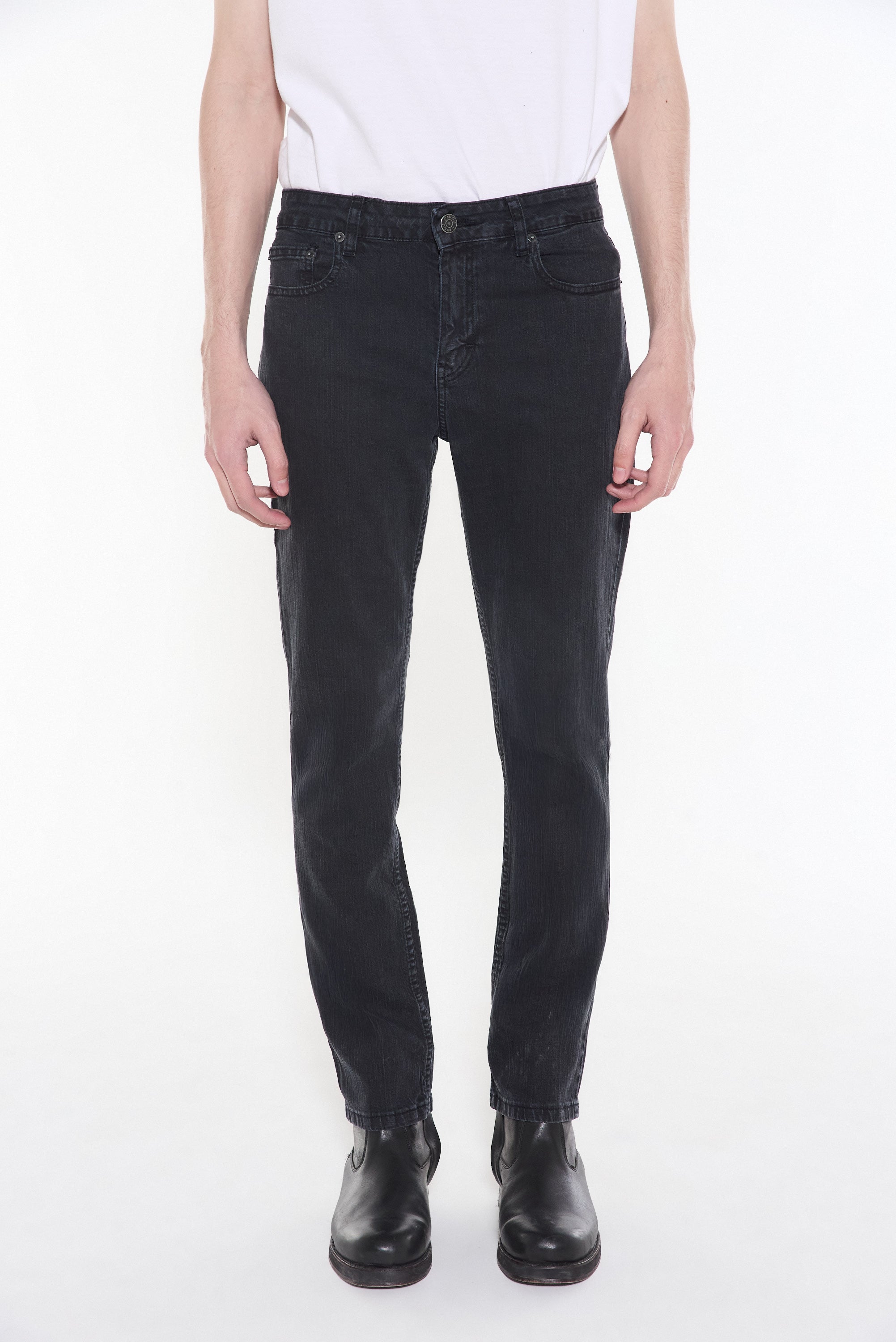 Jean 5 bolsillos, en tejido elastizado, lavado negro gastado.