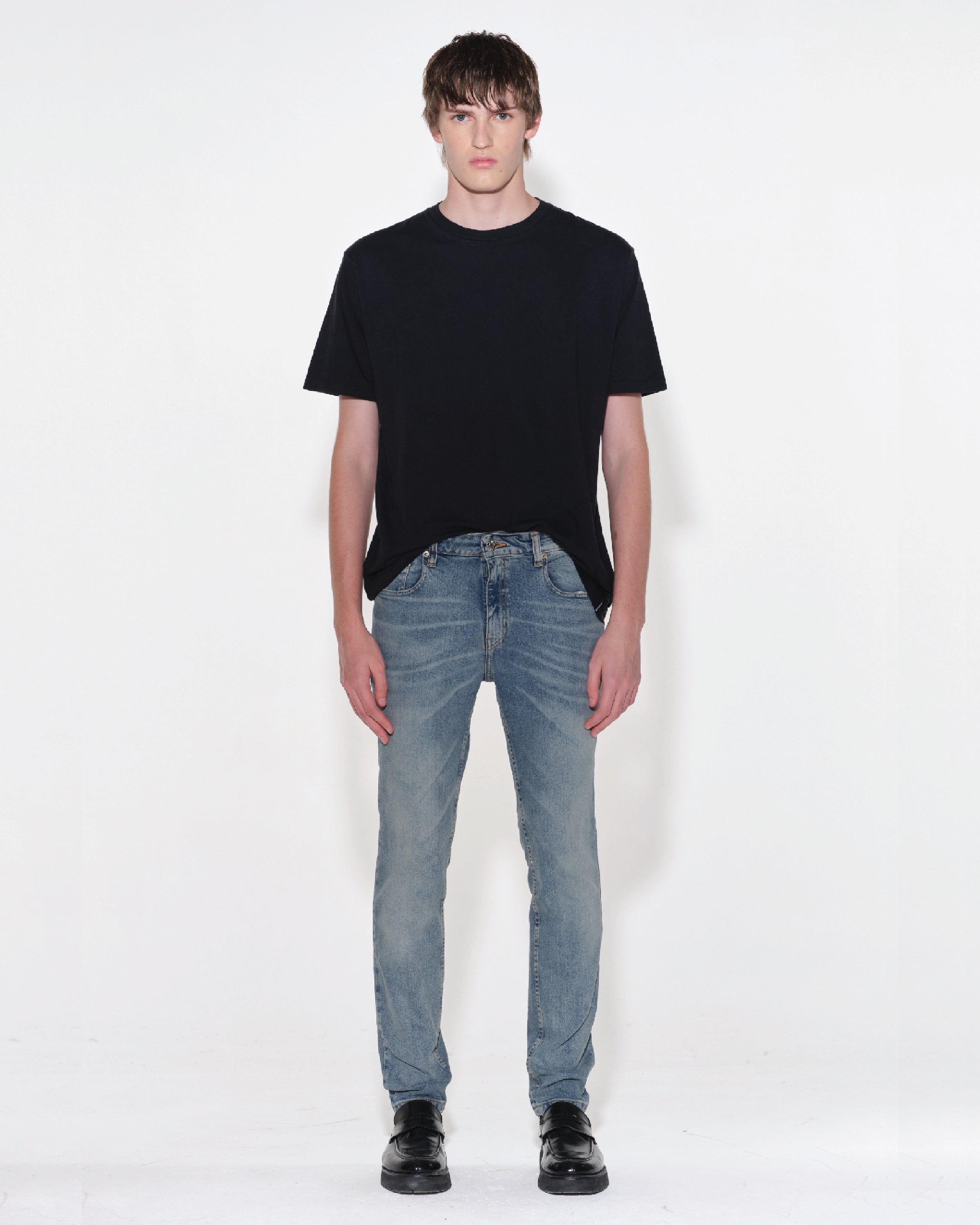 Jean 5 bolsillos, en tejido azul medio gastado.