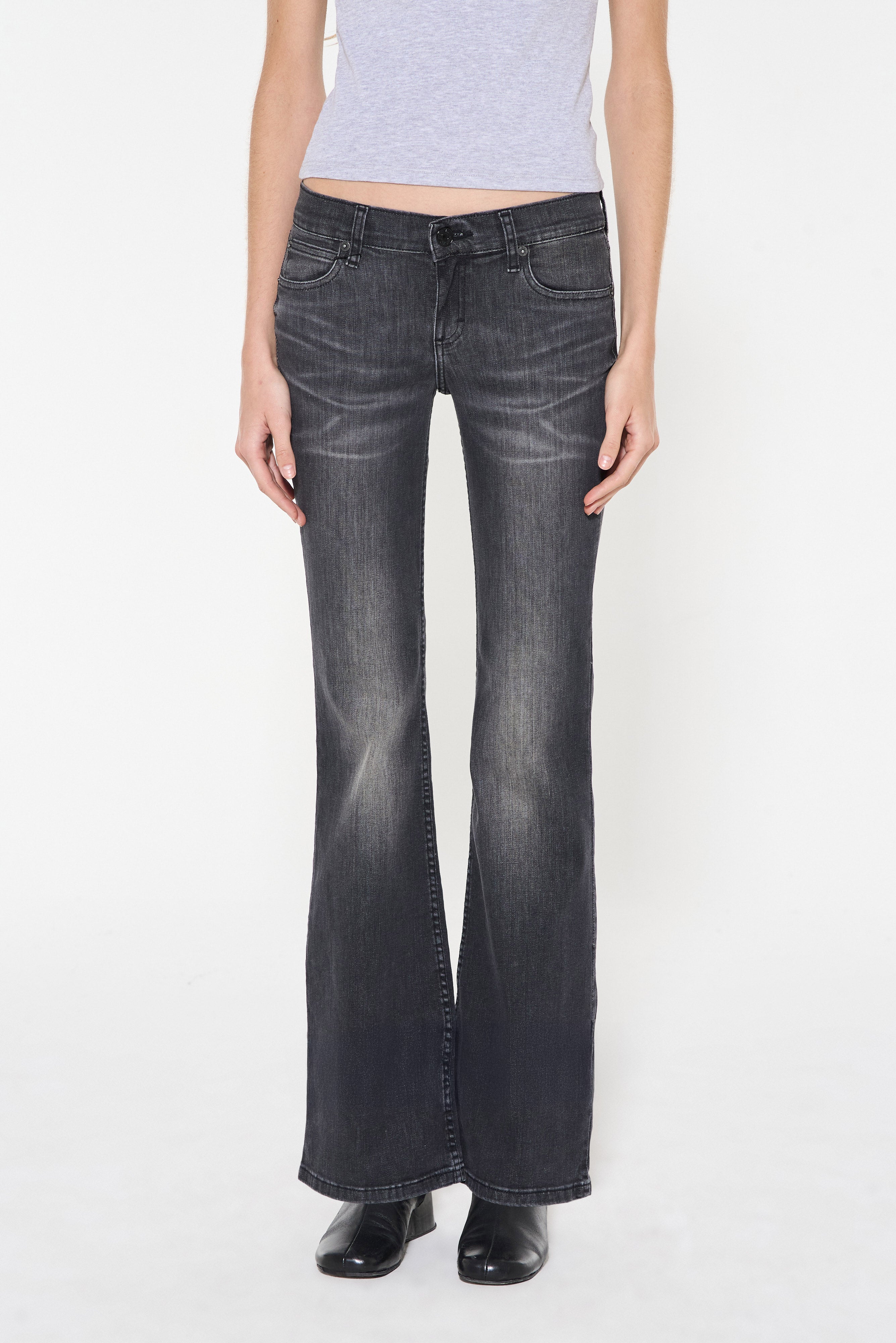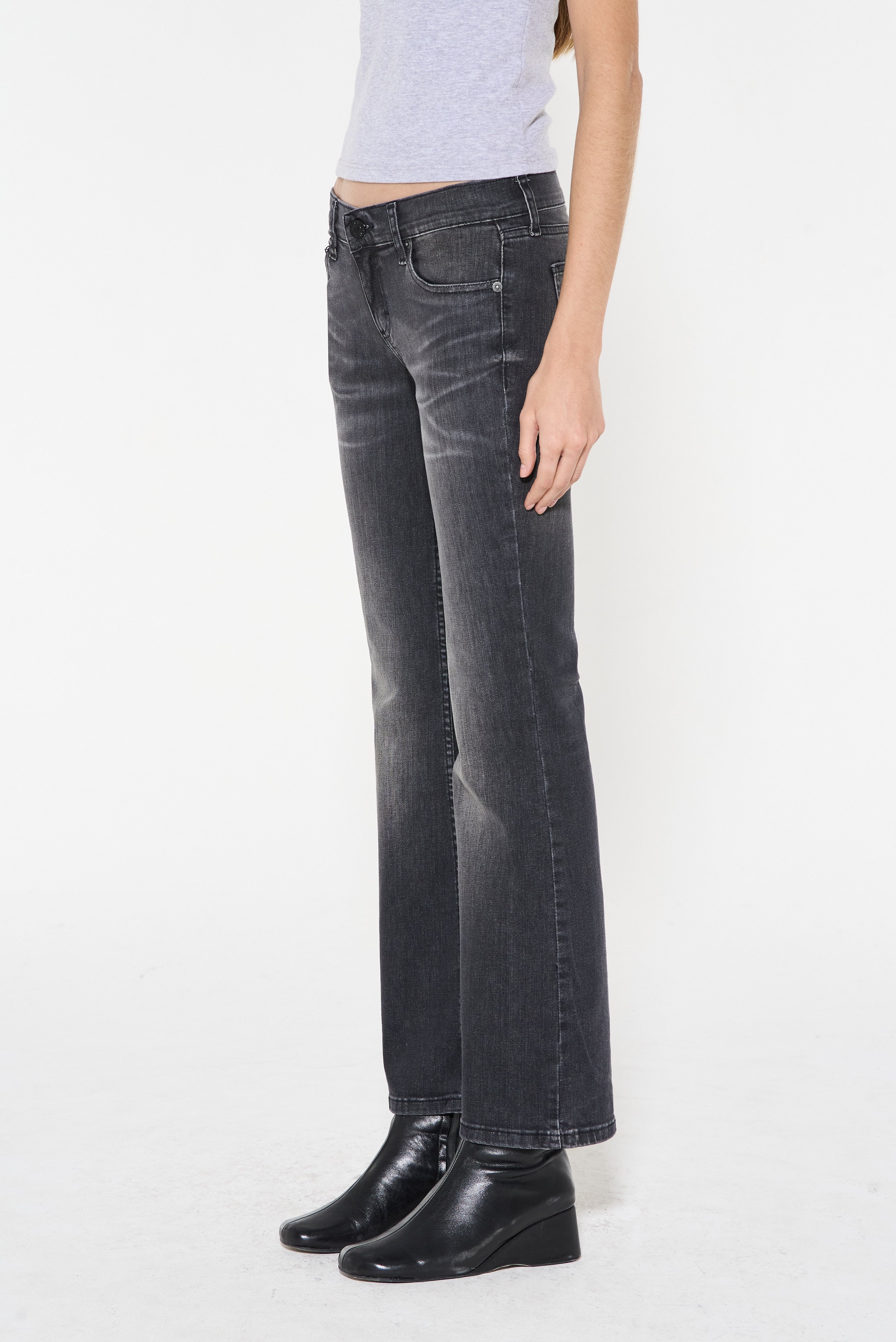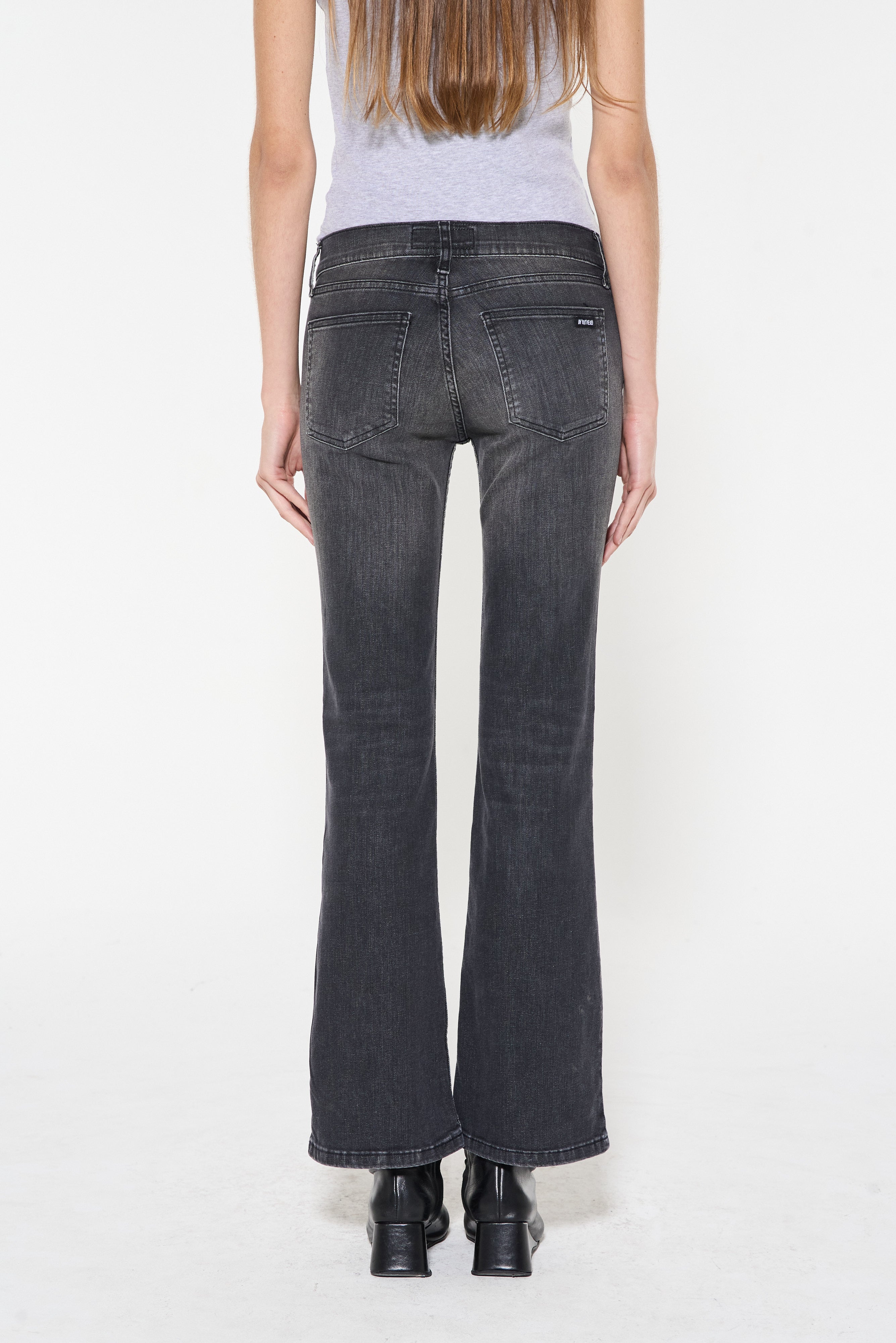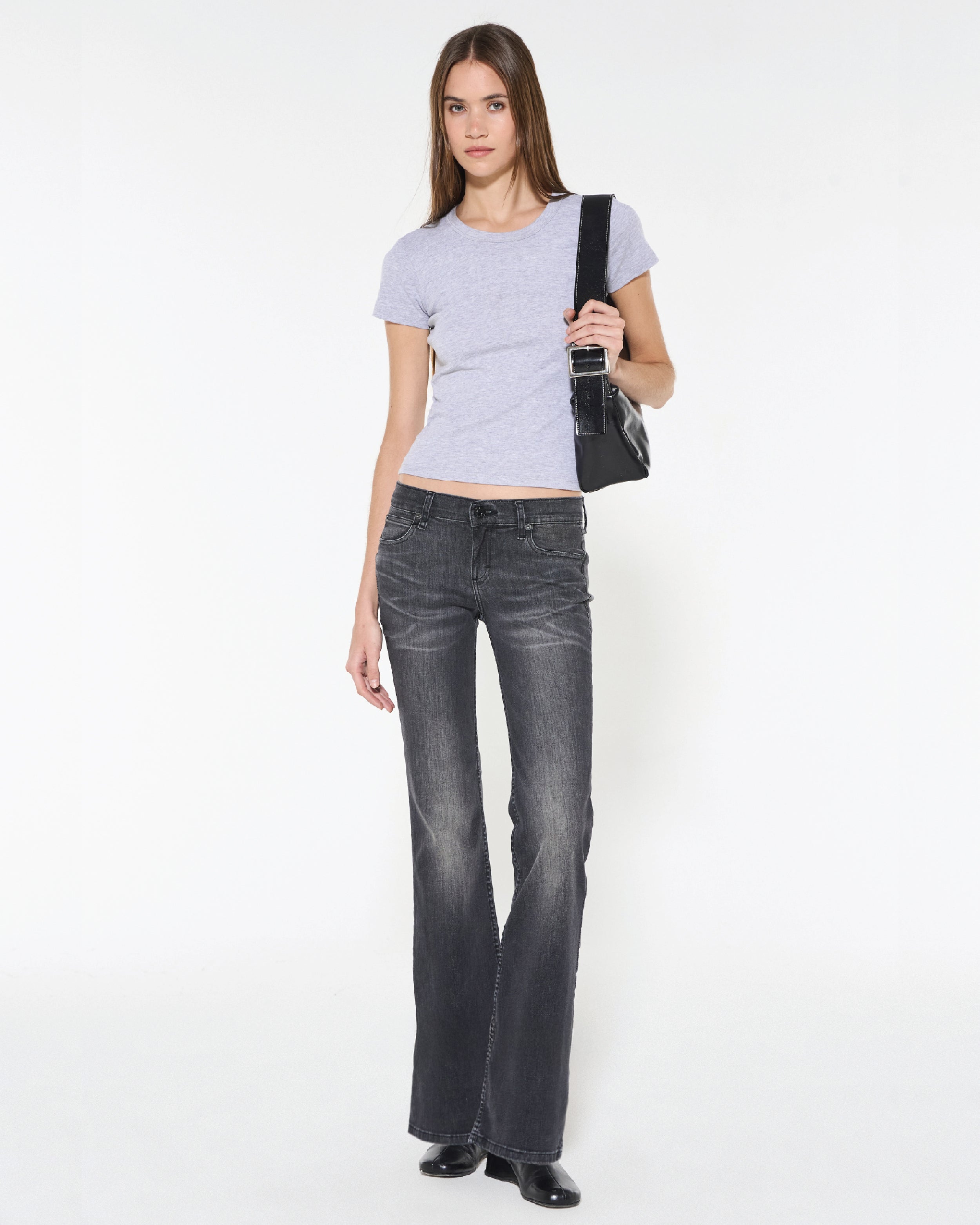 Jean 5 bolsillos, en denim algodón con lycra, negro gastado, con localizado blanco y bigotes.