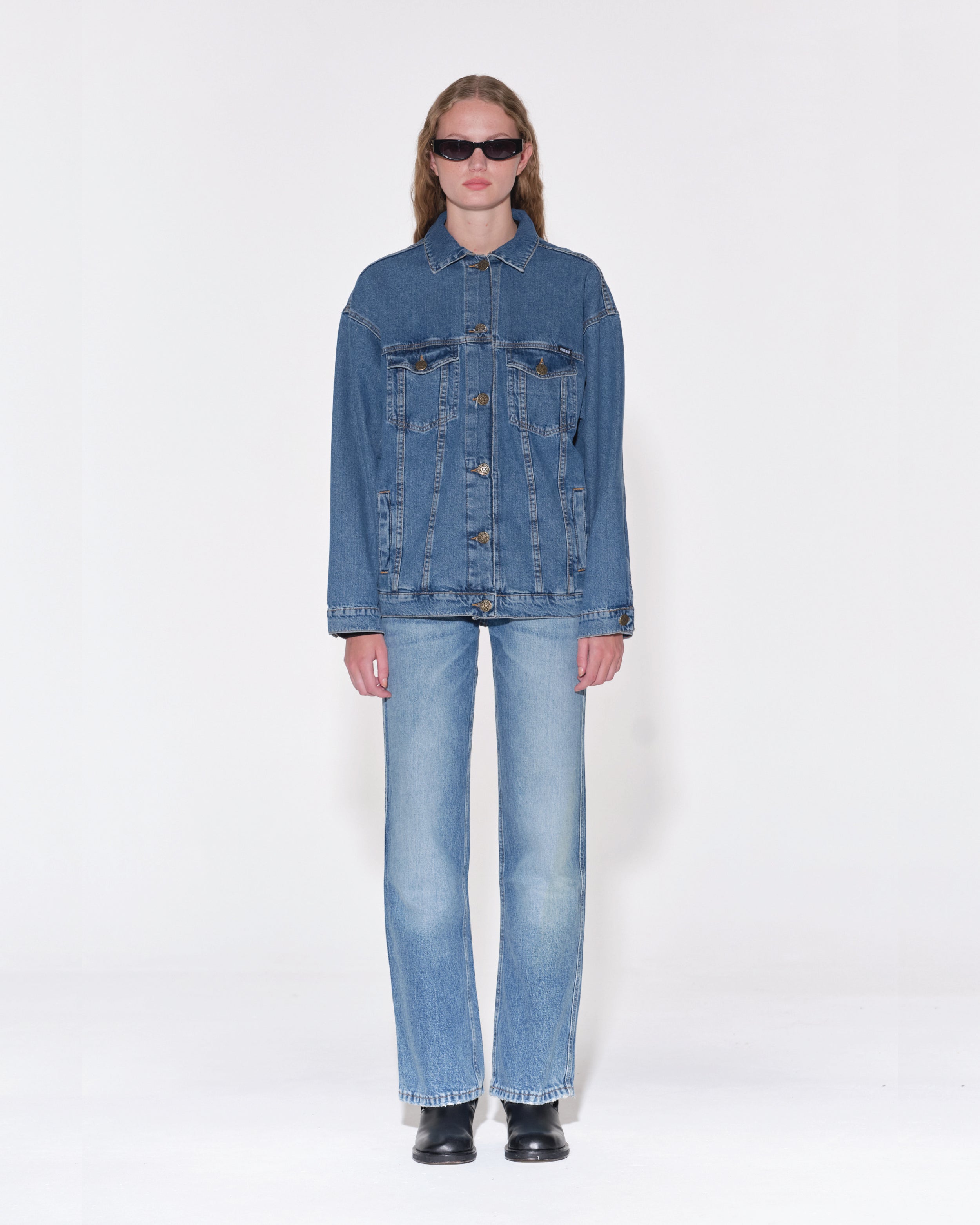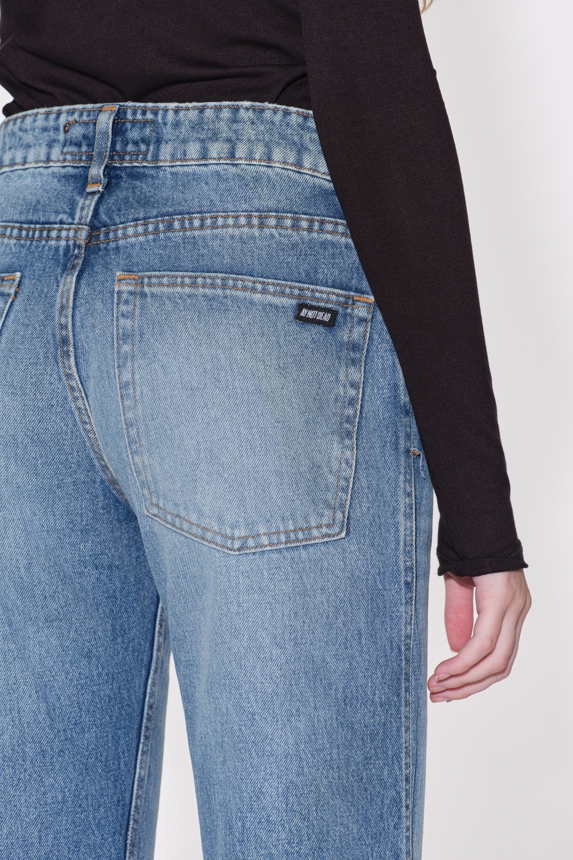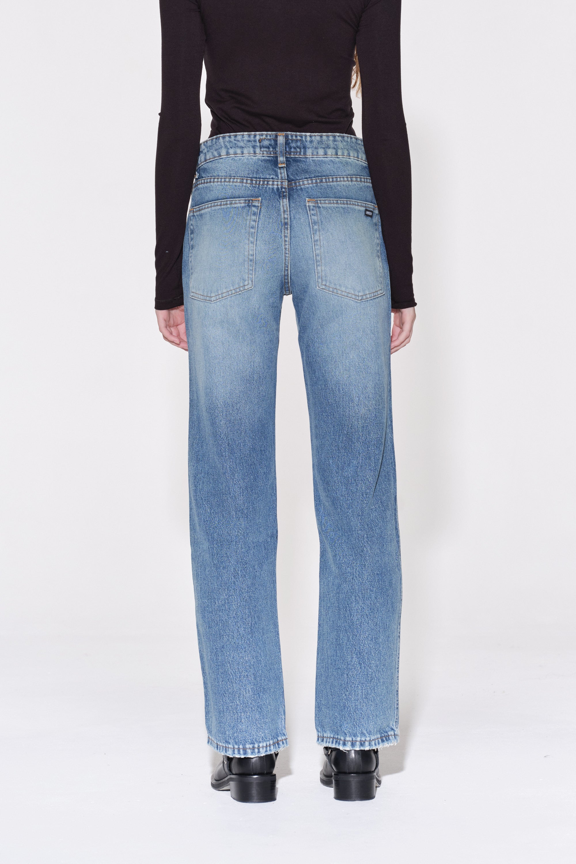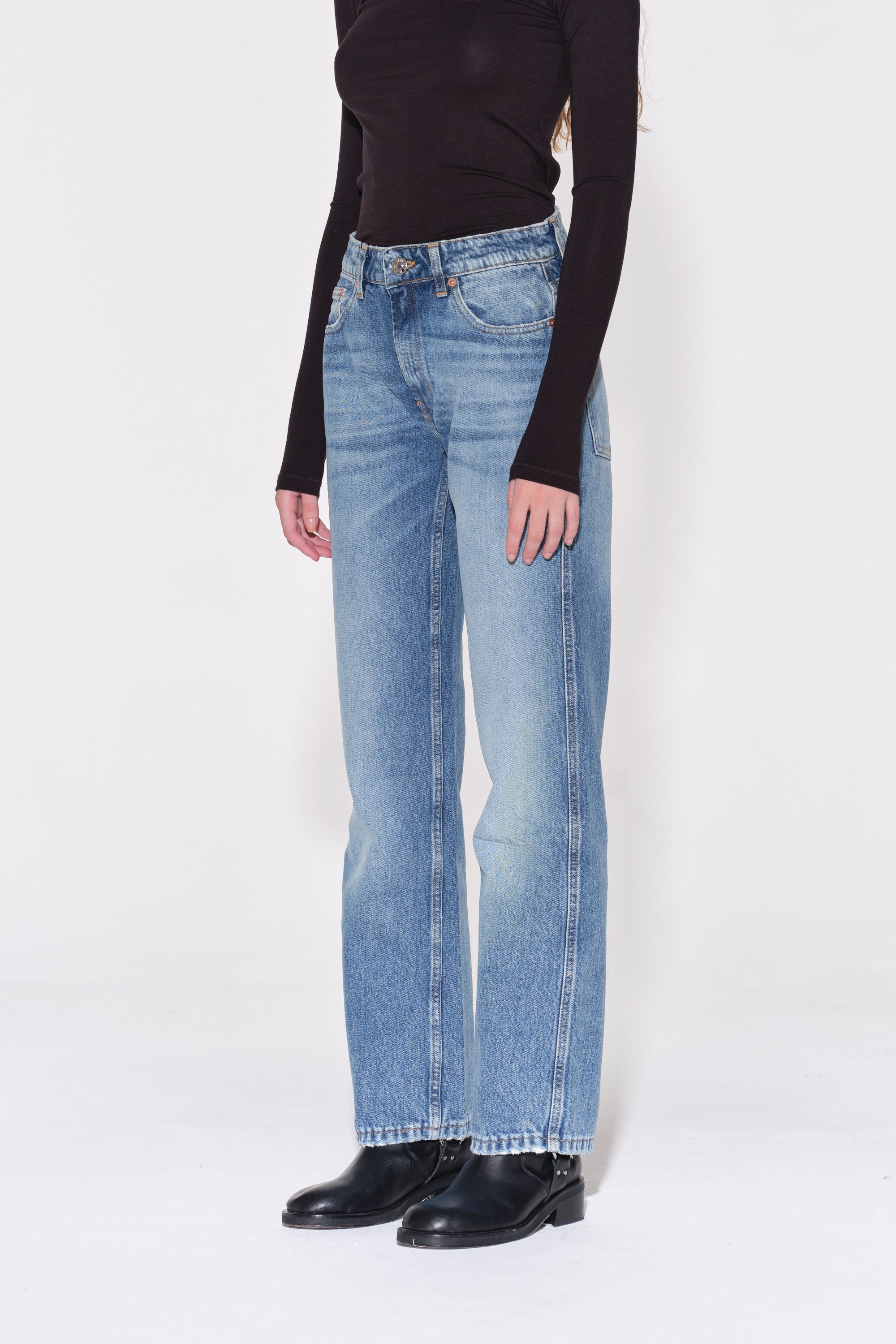 Jean 5 bolsillos, en tejido pesado 100% algodón, lavado azul claro con look vintage.