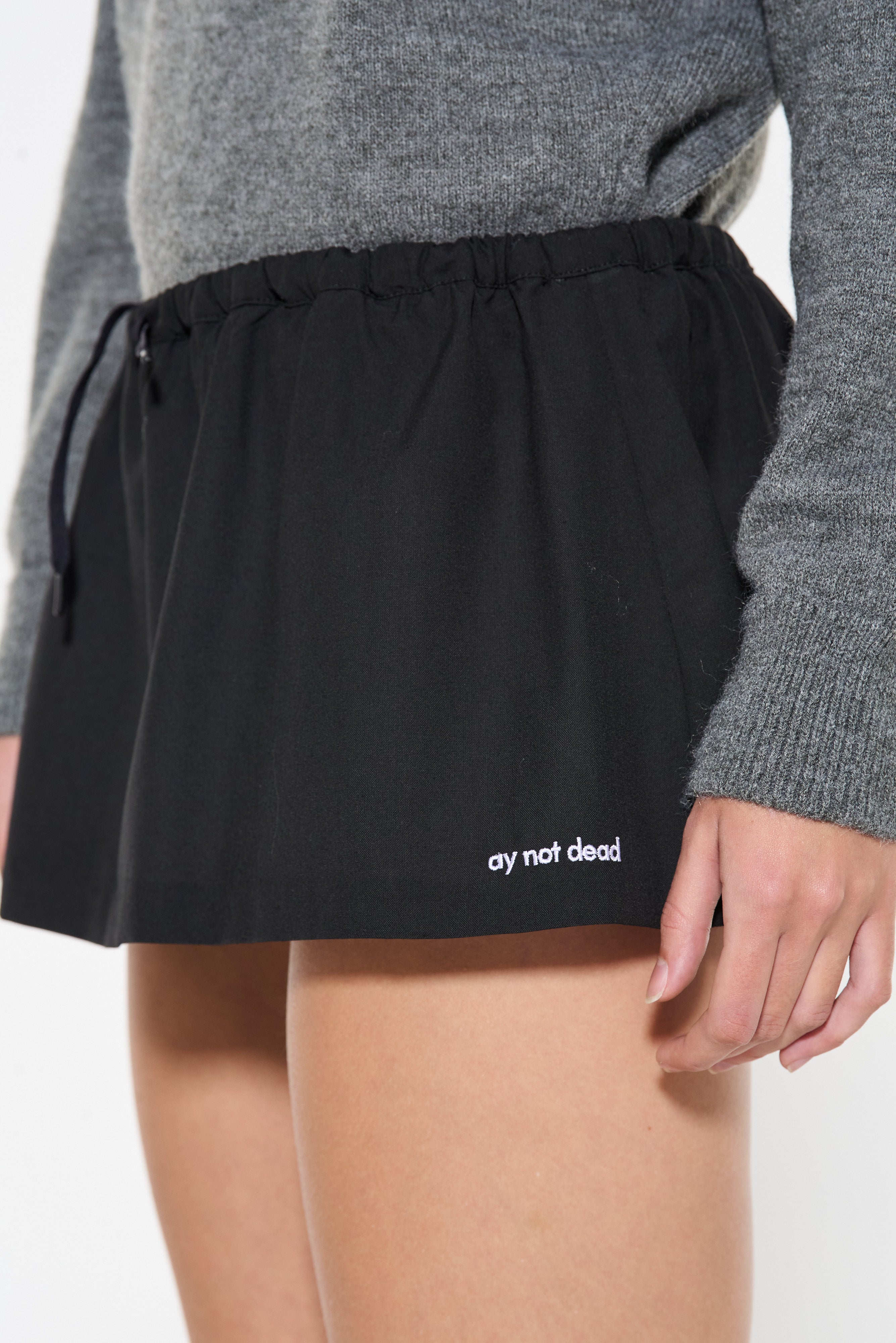 Mini confeccionada en sarga sastrera. Elástico y cordón regulable en cintura. Short de microfibra en interior. Detalle de logo bordado a contratono.