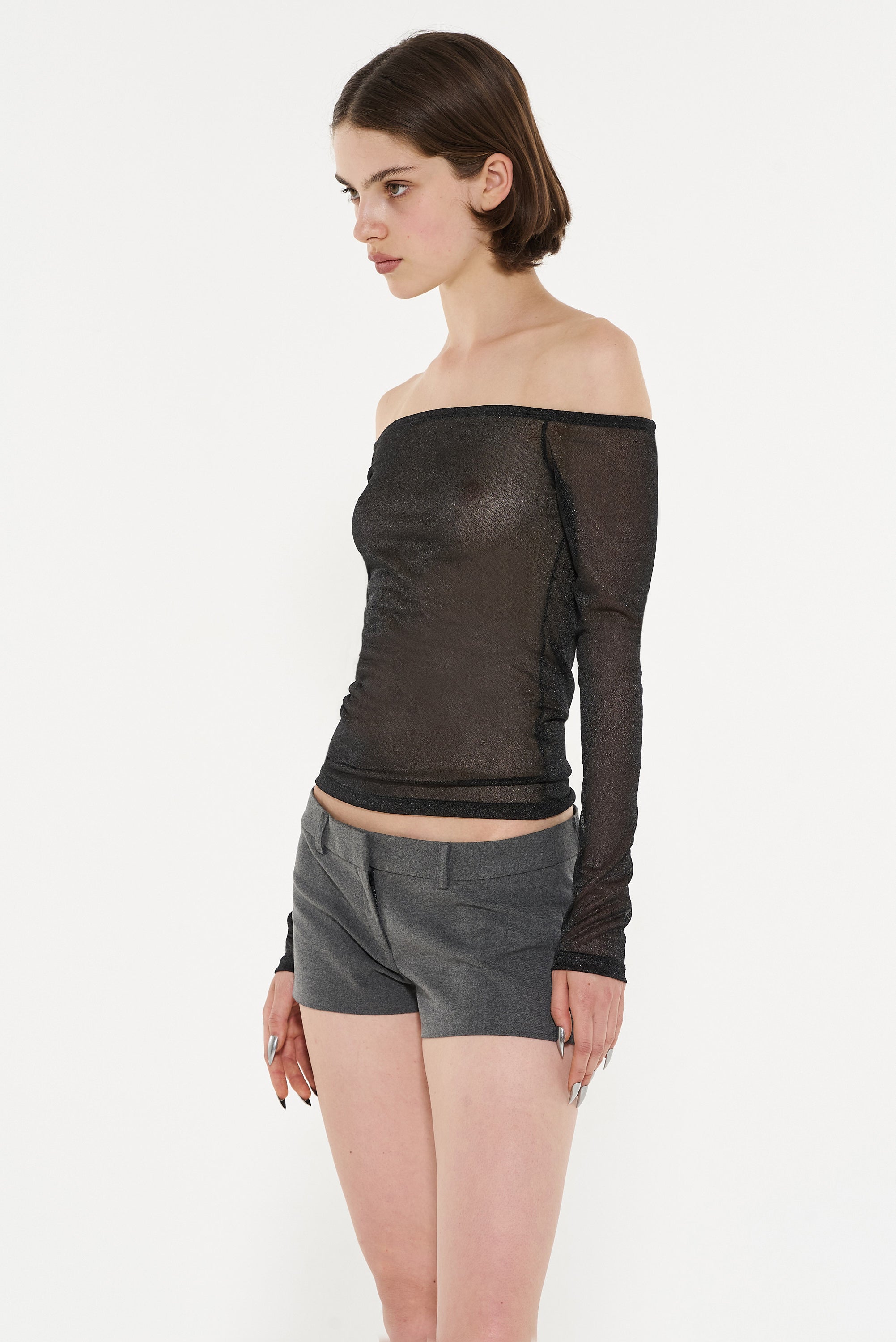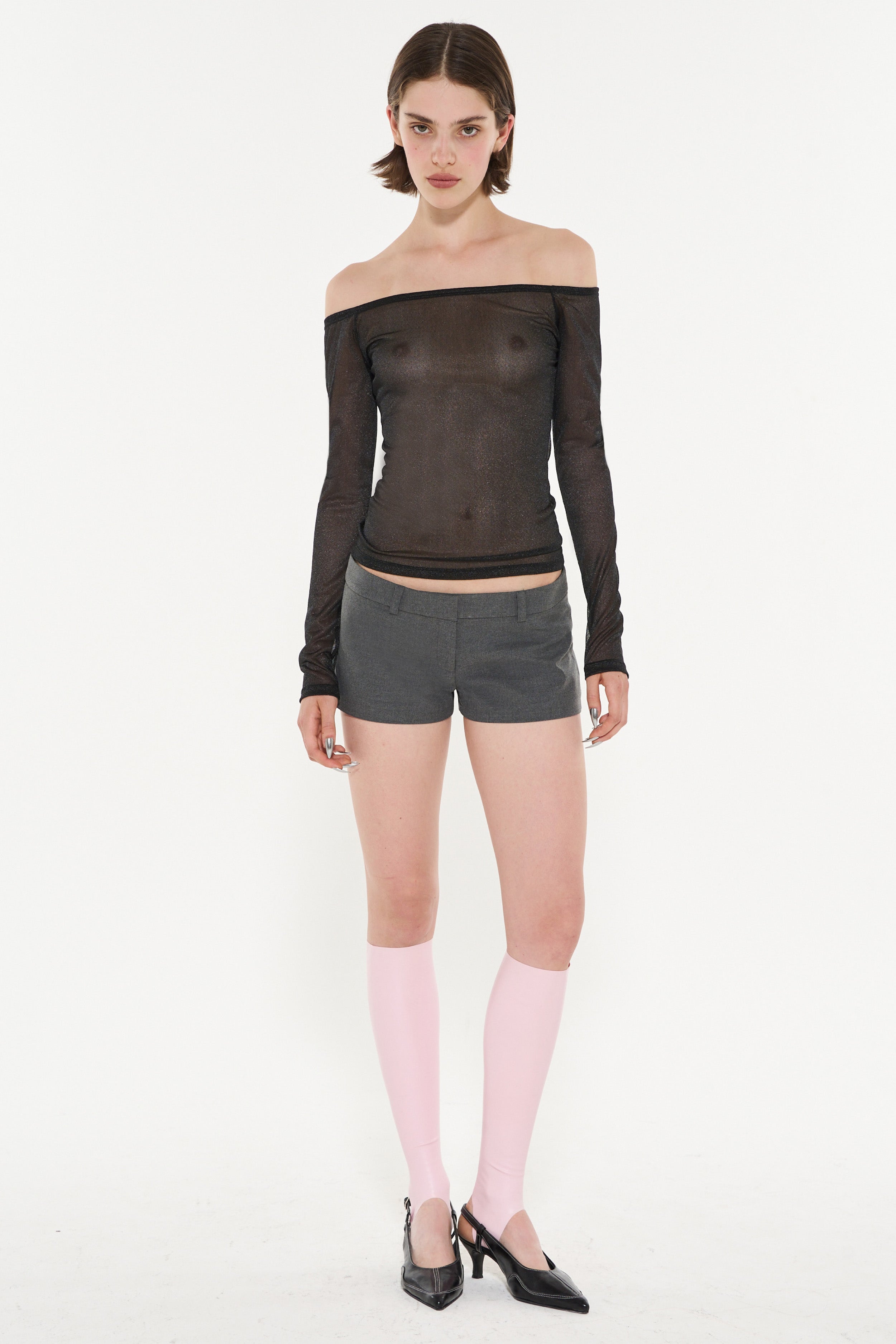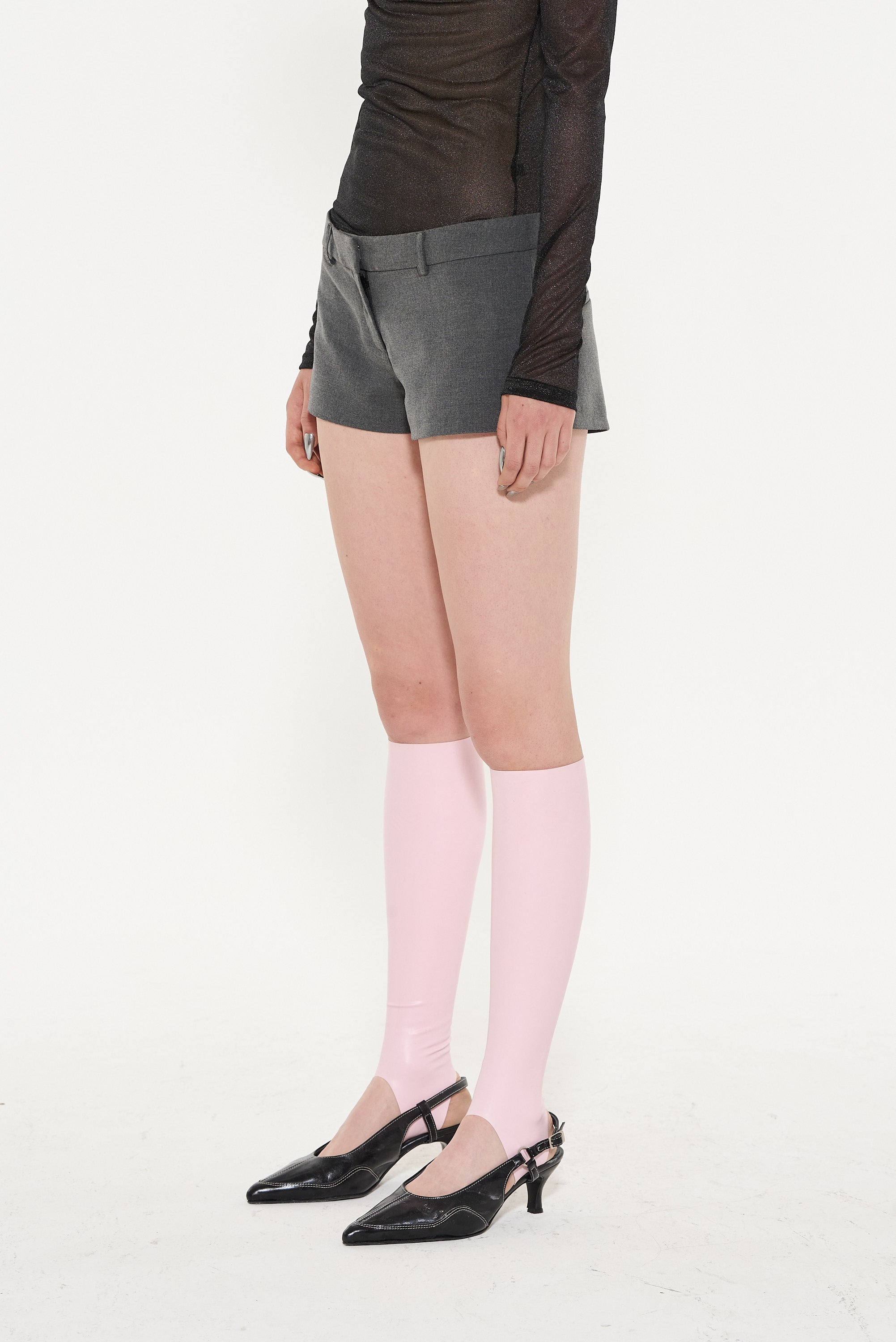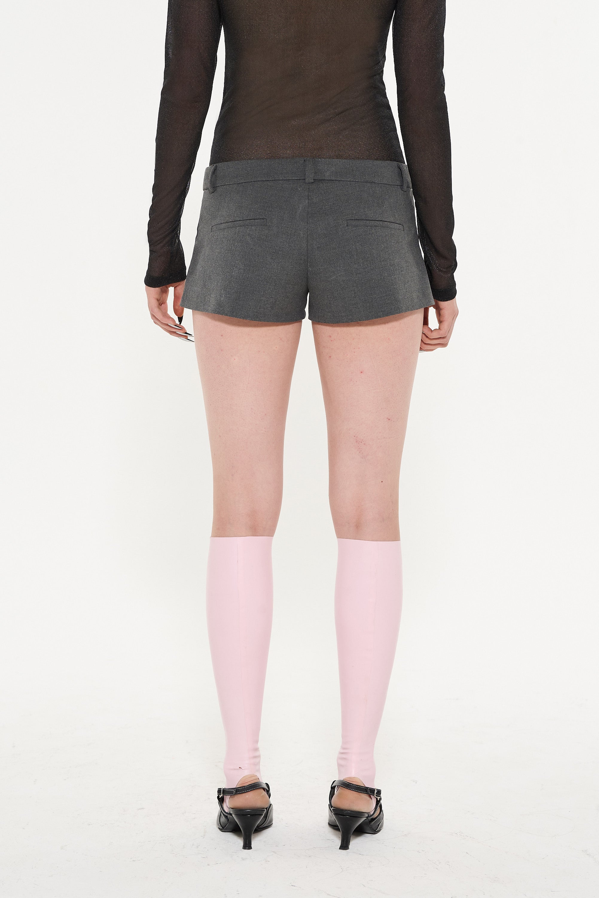 Mini short sastrero. Confeccionado en sarga sastrera lisa. Tiro bajo. Falsos bolsillos ojal en la espalda. Cintura con 5 presillas. Acceso delantero mediante cierre a tono y gancho pantalonero oculto.