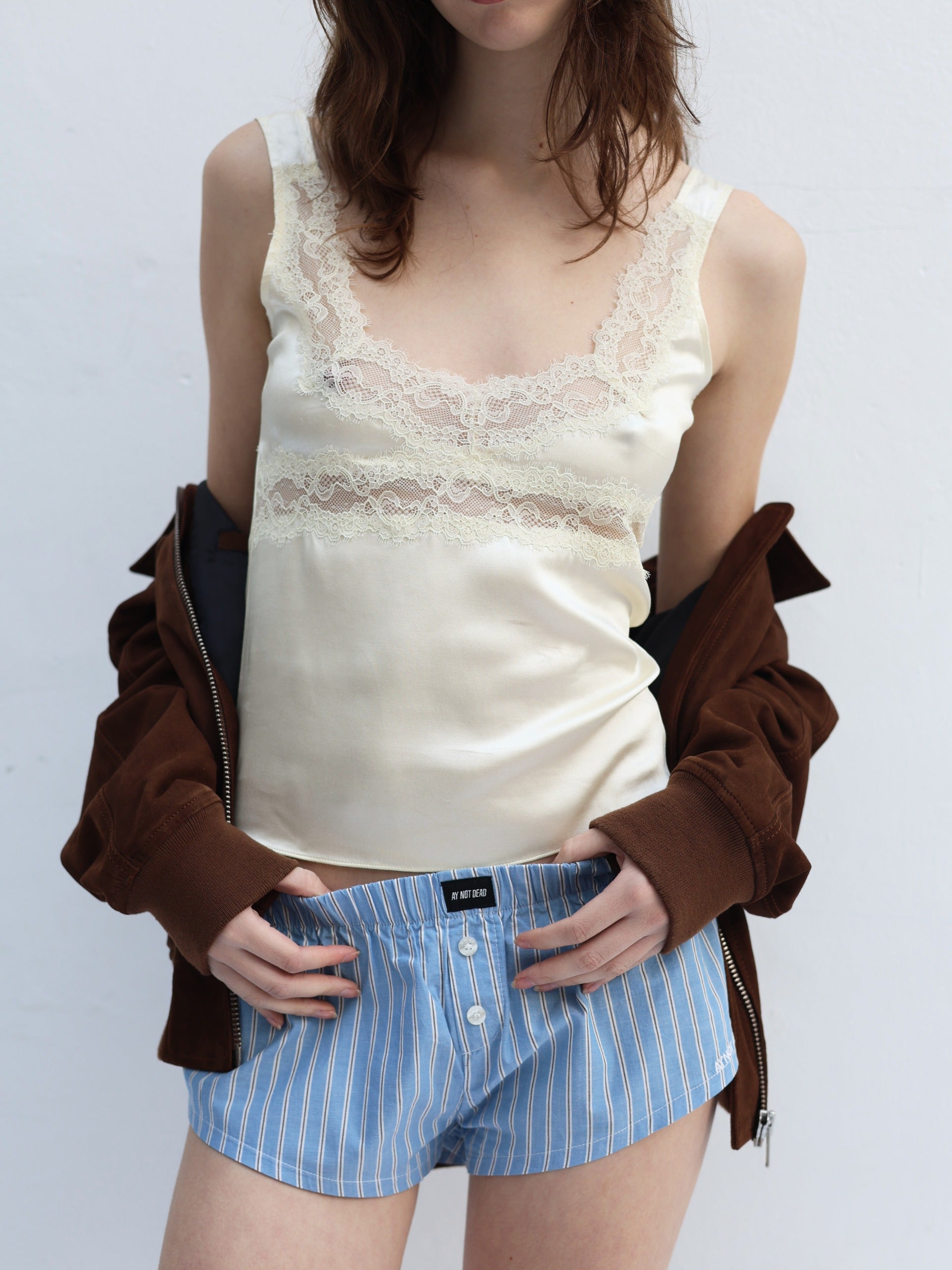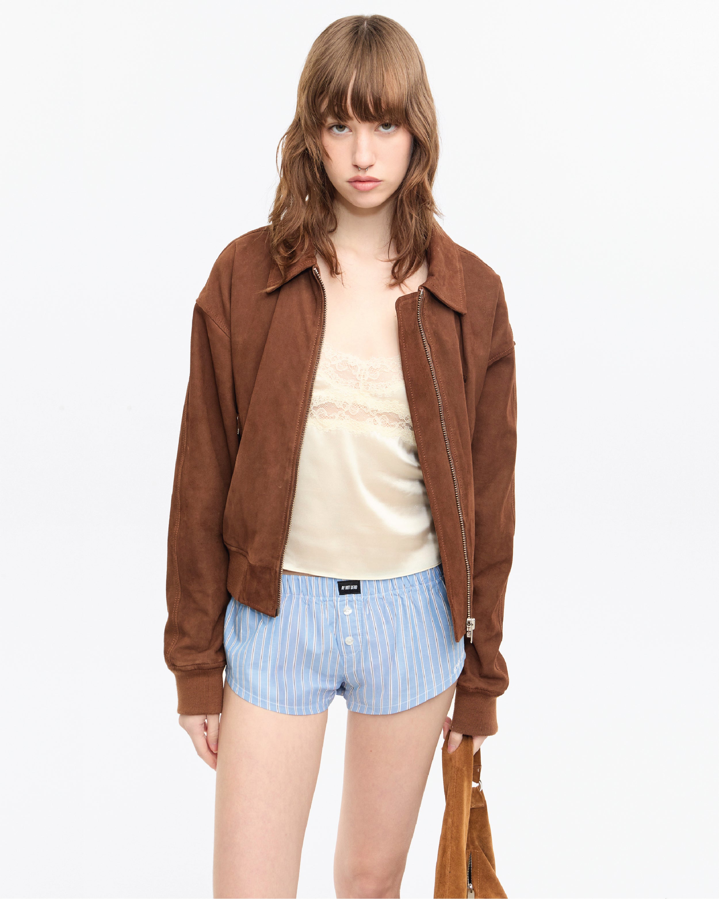 Mini short confeccionado en poplín de algodón rayado. De tiro bajo y calce loose. Con elástico embutido en la cintura y cartera fija con dos botones. Detalle de logo bordado en blanco.