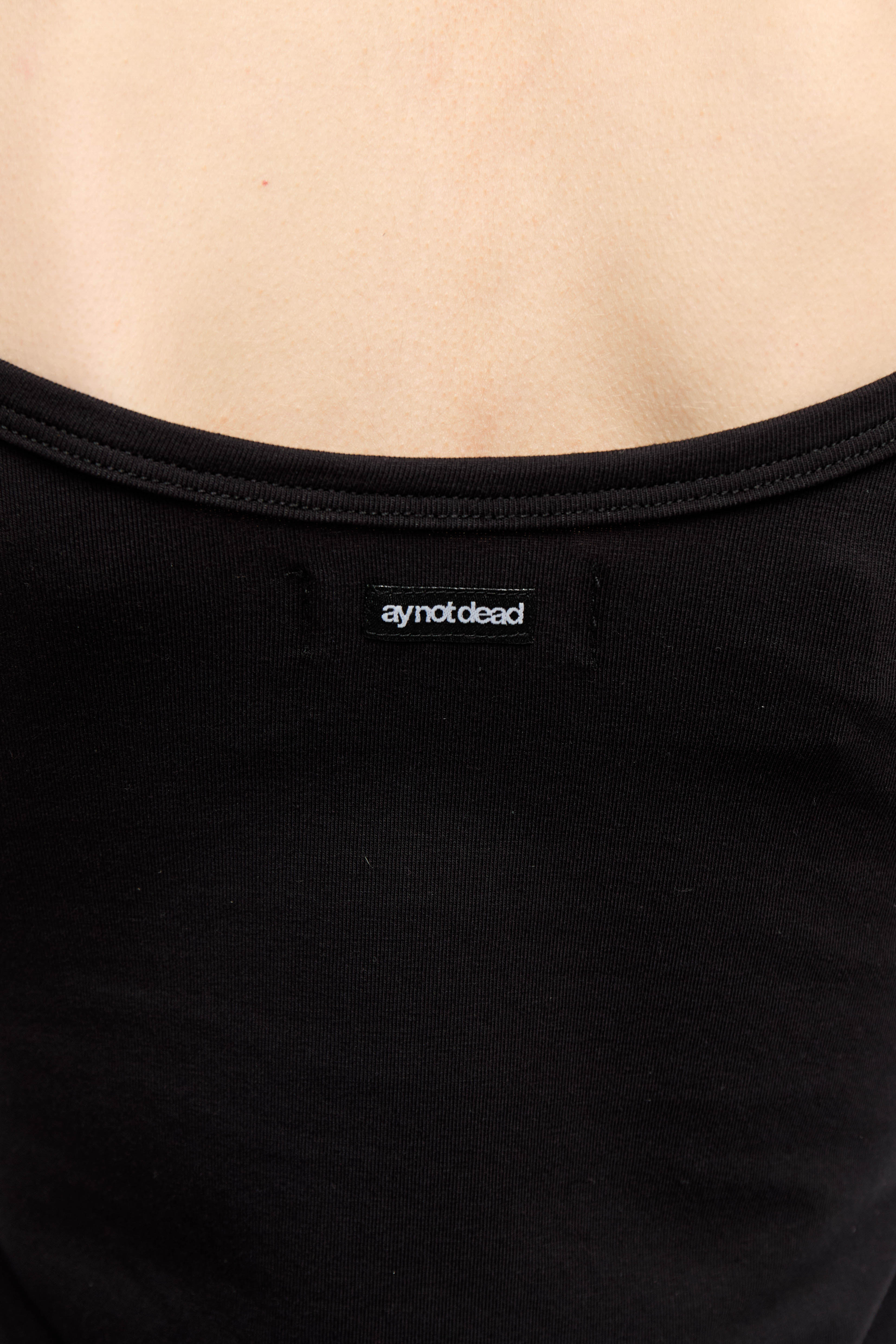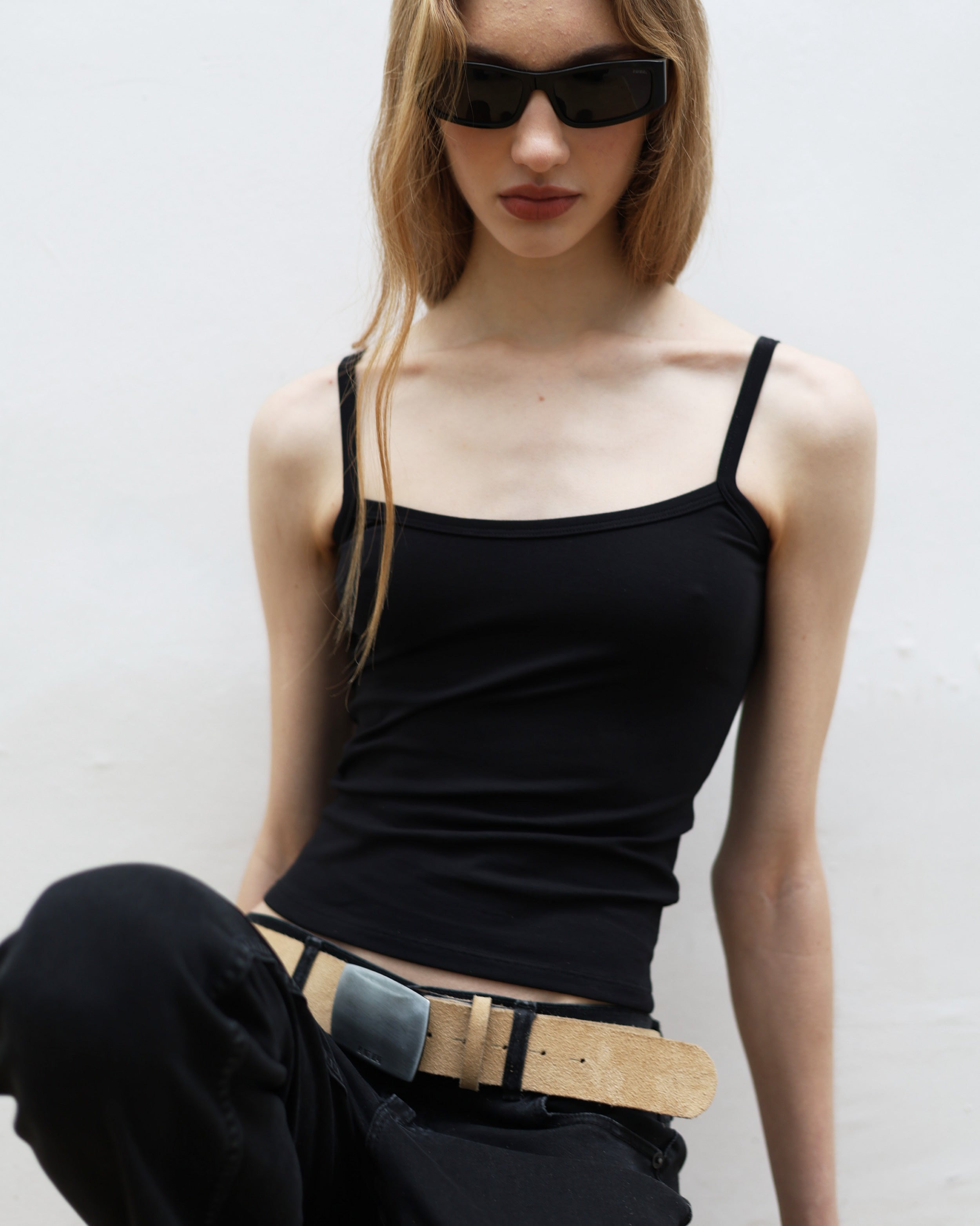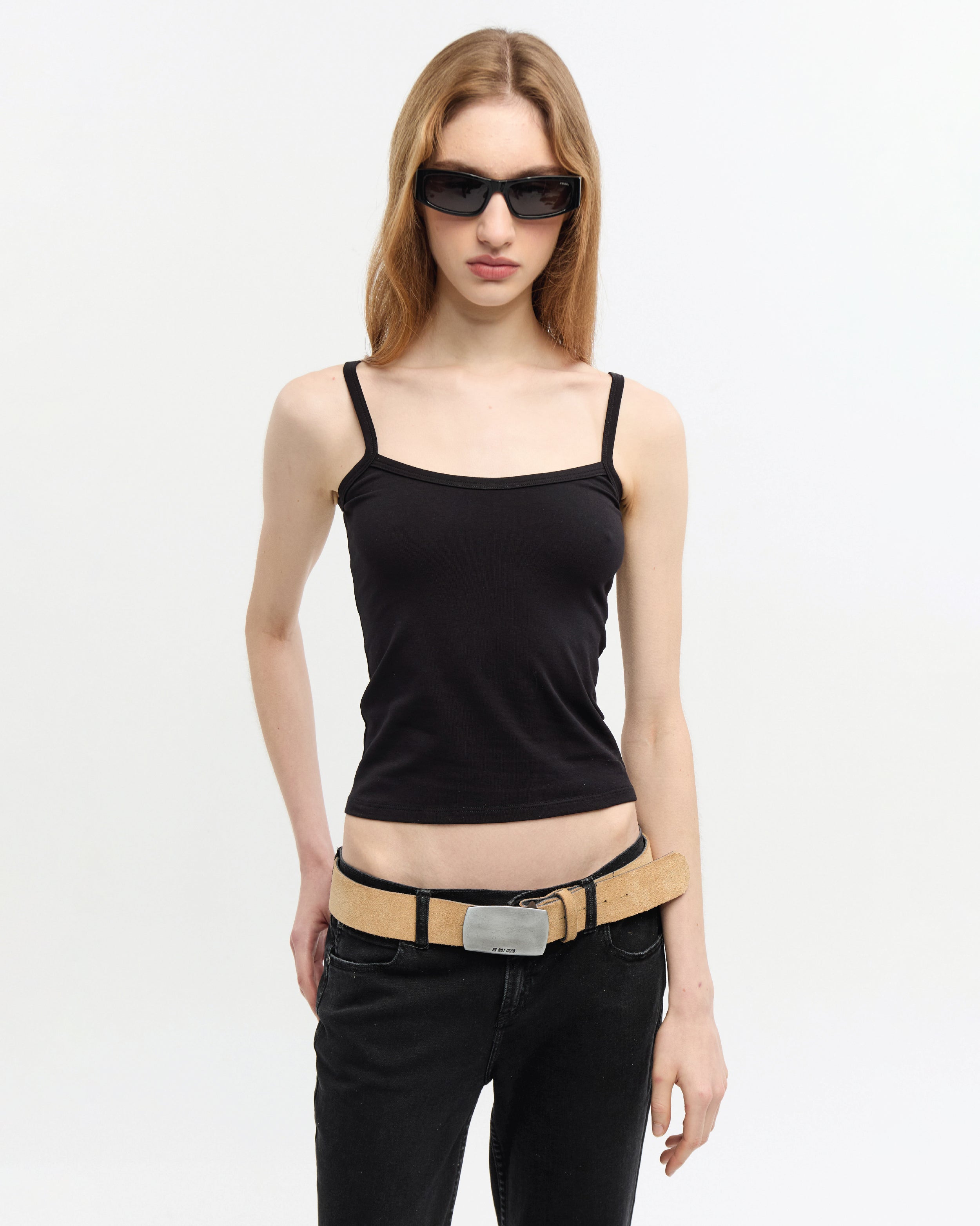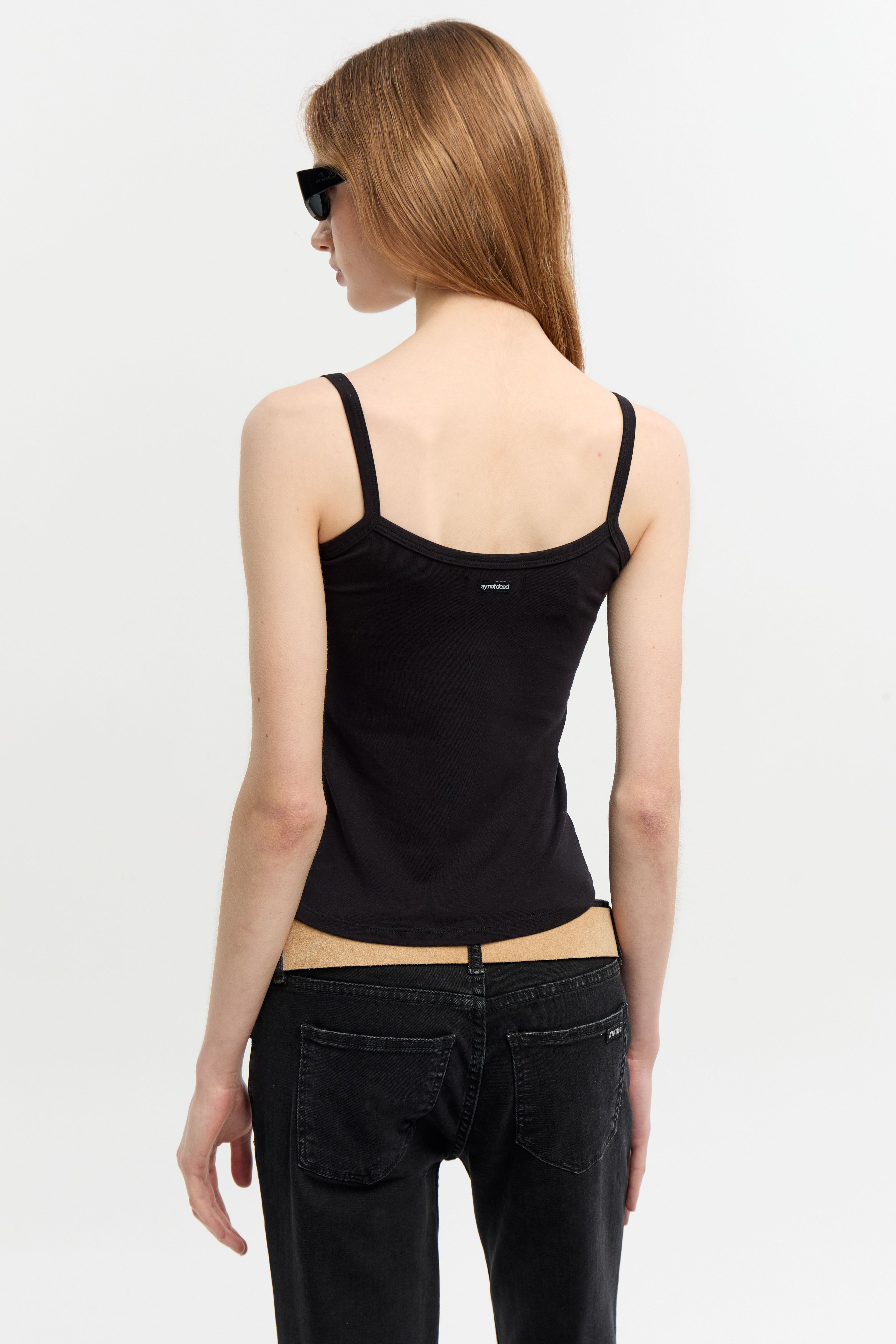 Musculosa de tiritas, con escote redondo profundo en jersey de algodón con elastano. Calce fitted con largo a la primer cadera. Posee grifa de marca en espalda.