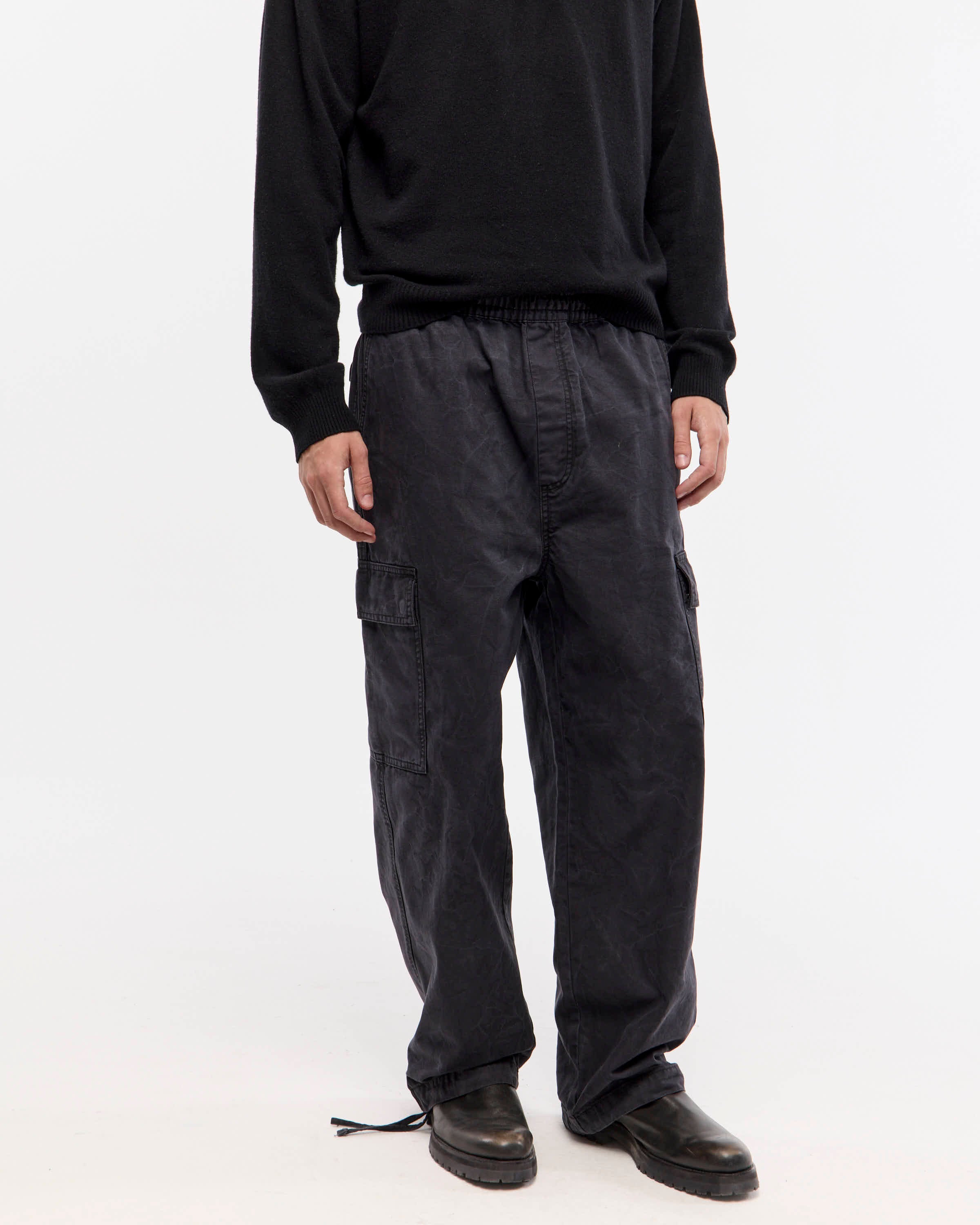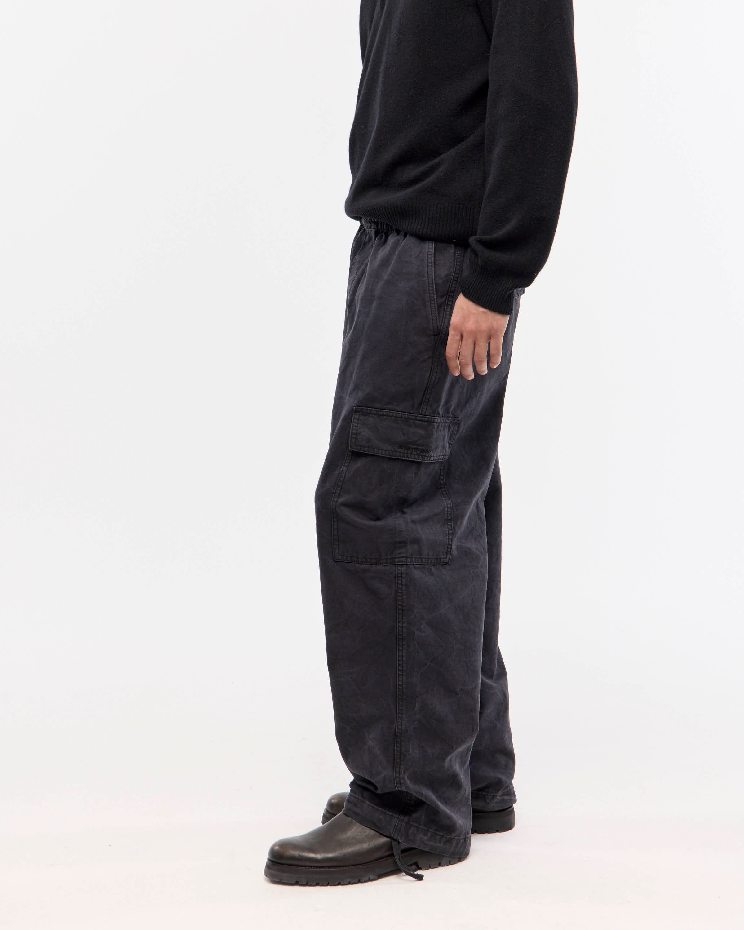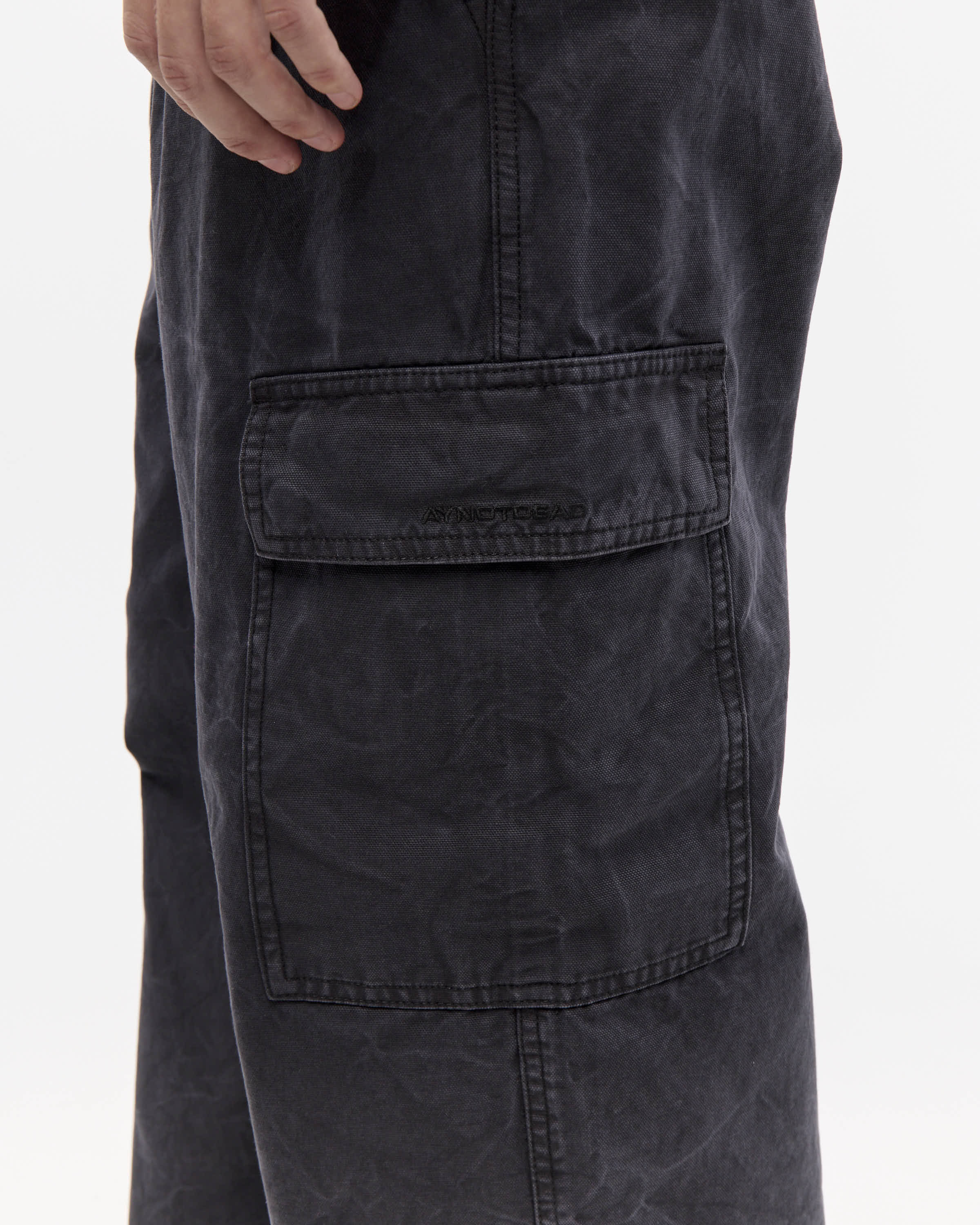 Pantalón de canvas rígido teñido. Tiro bajo, con cintura elastizada y cordón oculto para ajustar. Bolsillos diagonales en delantero y bolsillos ojales con tapa en espalda. Bolsillos plaque con tapa en laterales de la pierna. Pierna recta. Detalle de cartera con doble pespunte a tono.