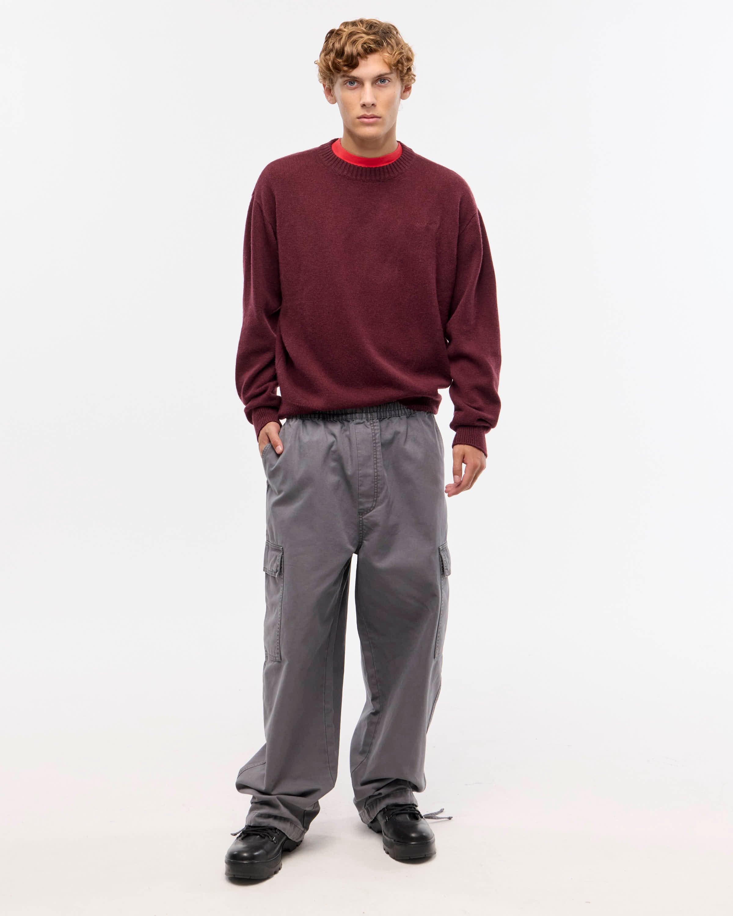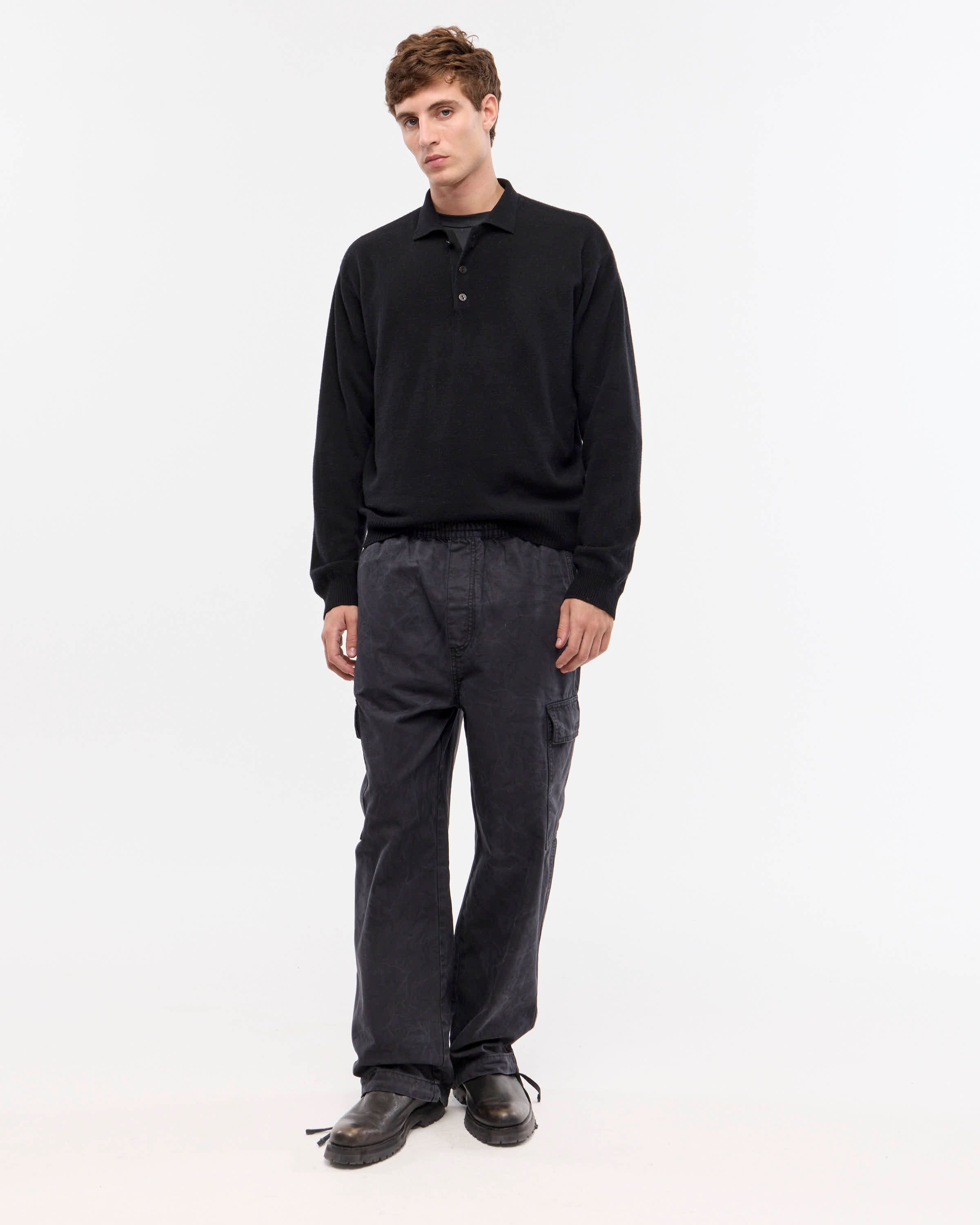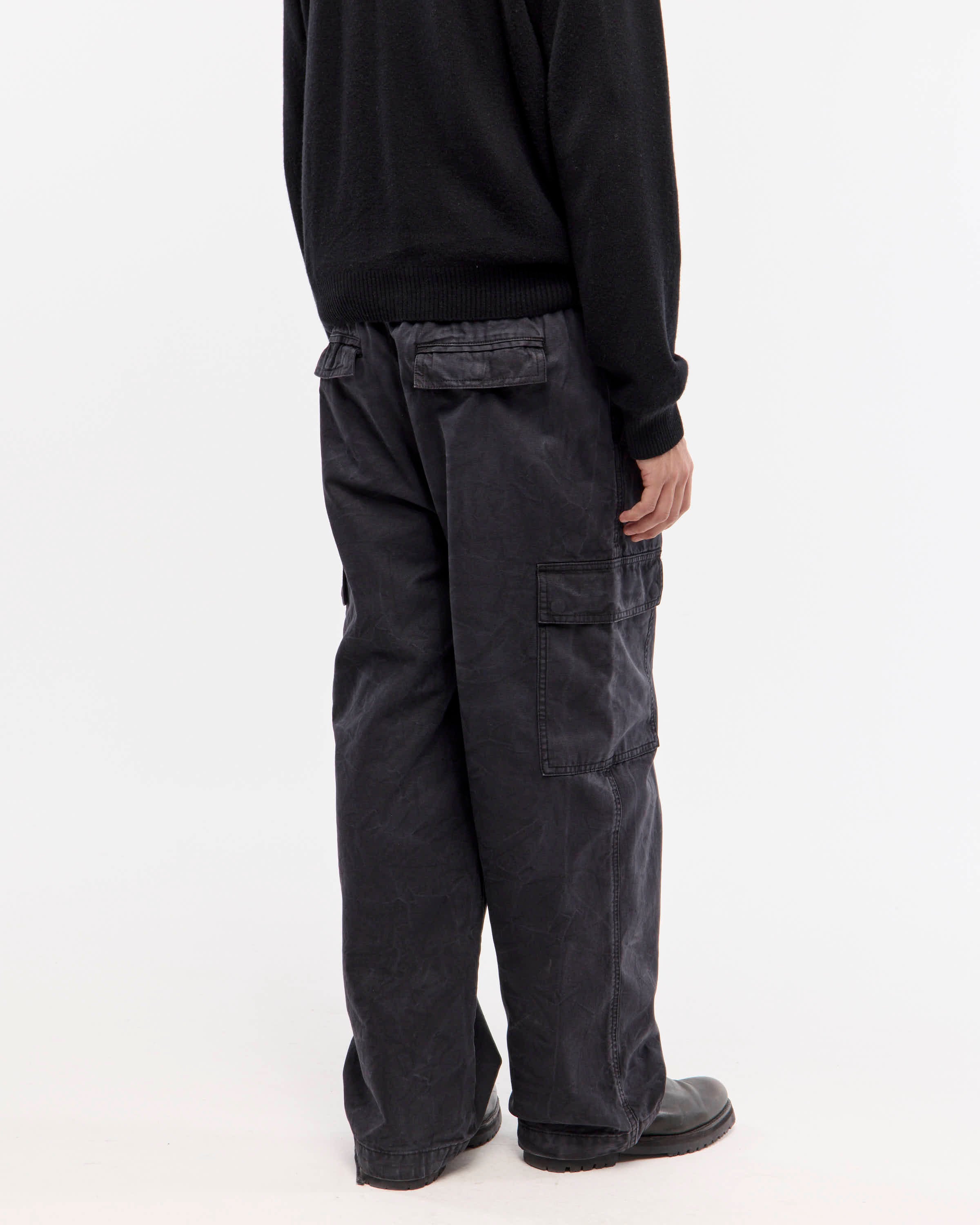 Pantalón de canvas rígido teñido. Tiro bajo, con cintura elastizada y cordón oculto para ajustar. Bolsillos diagonales en delantero y bolsillos ojales con tapa en espalda. Bolsillos plaque con tapa en laterales de la pierna. Pierna recta. Detalle de cartera con doble pespunte a tono.
