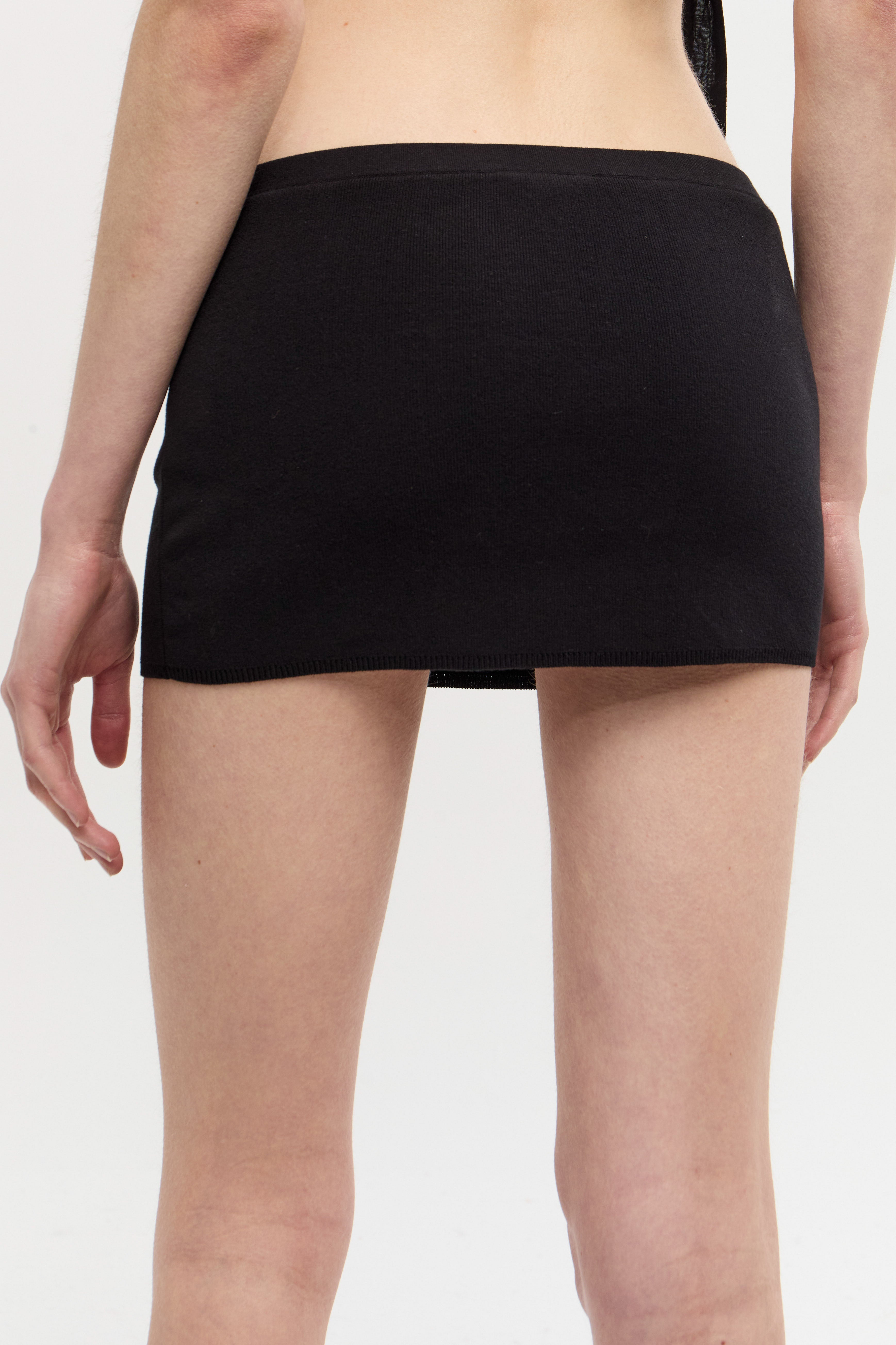 Pollera corta tejida en punto acanalado, de viscosa. Tiro bajo con cintura elastizada con elástico interno.