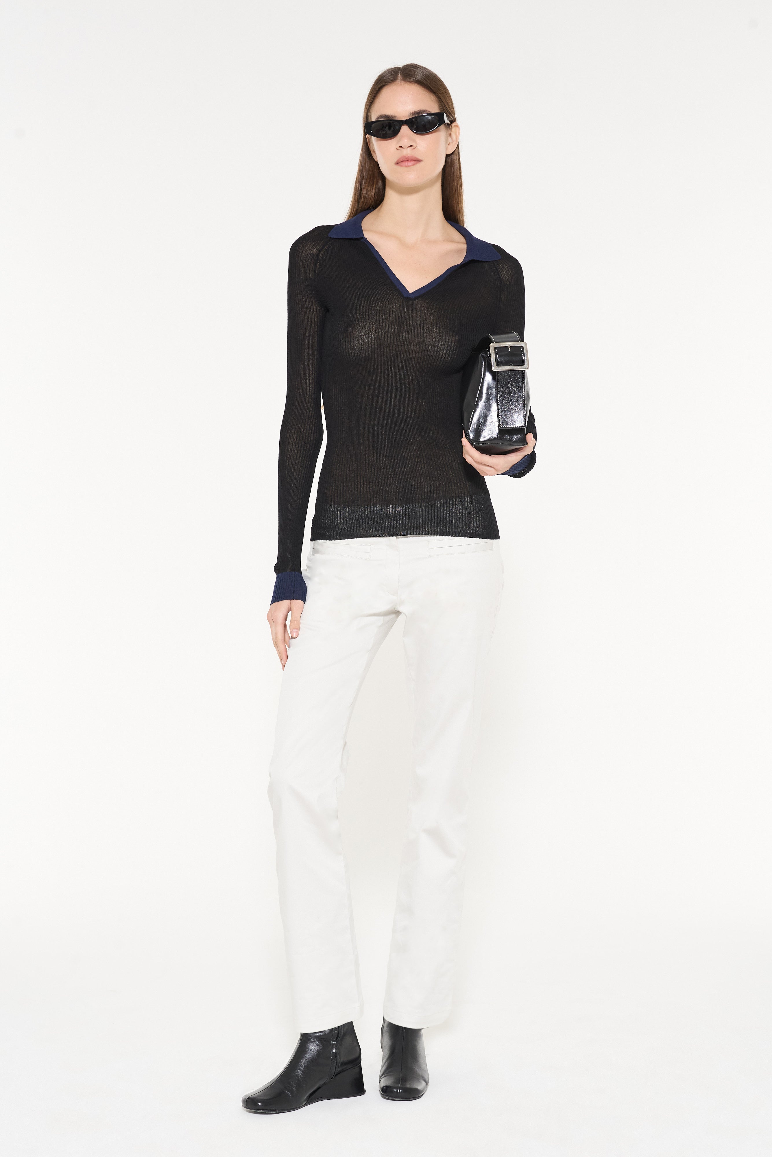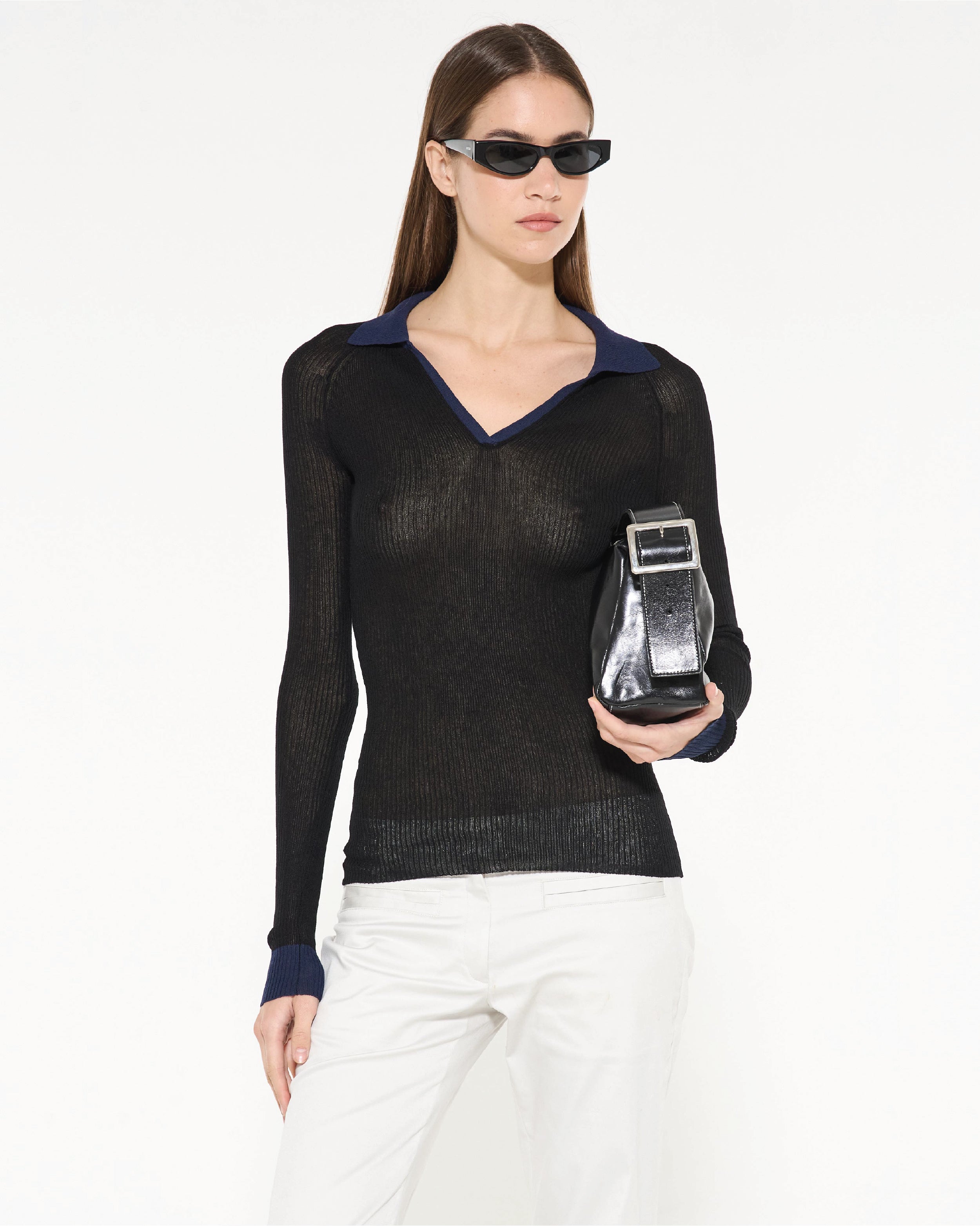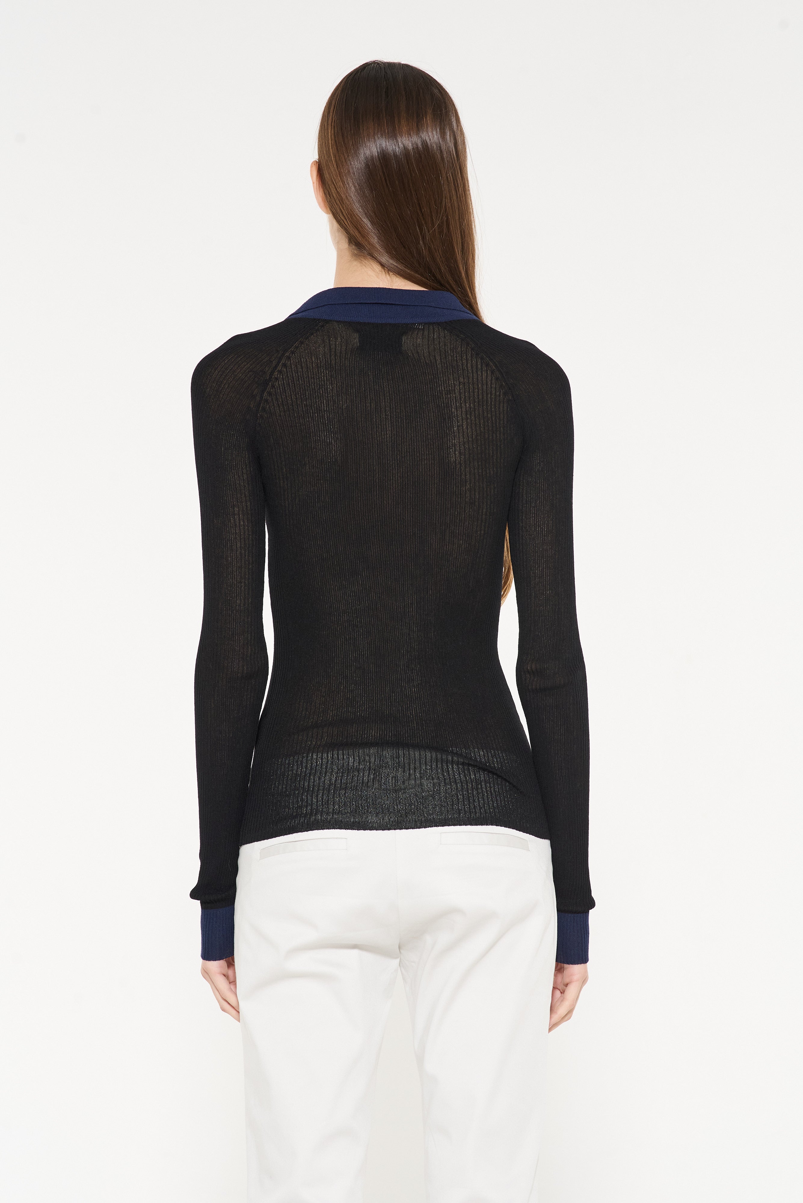 Remera con cuello polo tejida de calce al cuerpo con largo a la cadera. Tejido transparente de viscosa que le aporta suavidad.