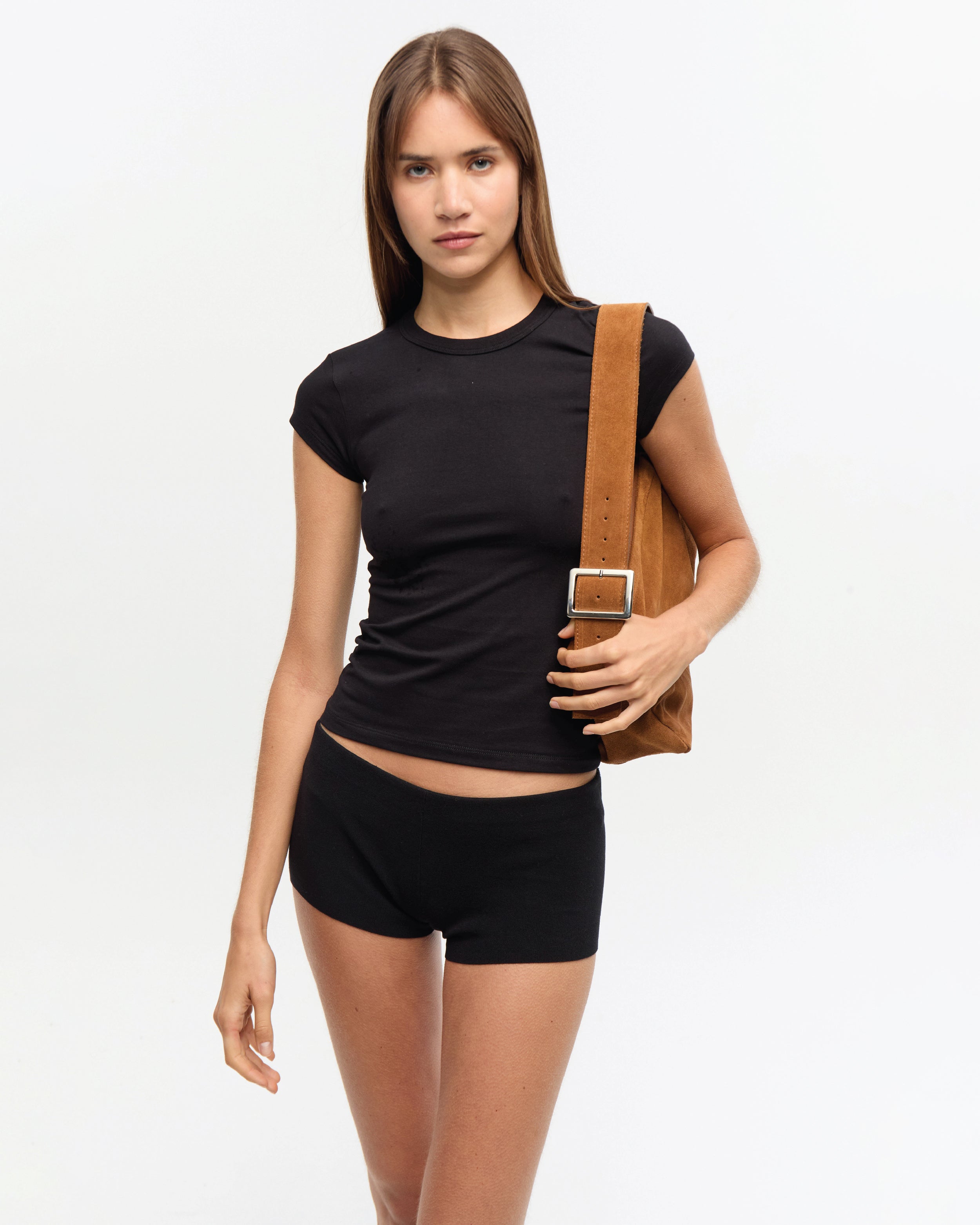 Remera manga corta con escote redondo en jersey de algodon con elastano. Calce fitted con largo a la primer cadera. Posee grifa de marca en espalda.