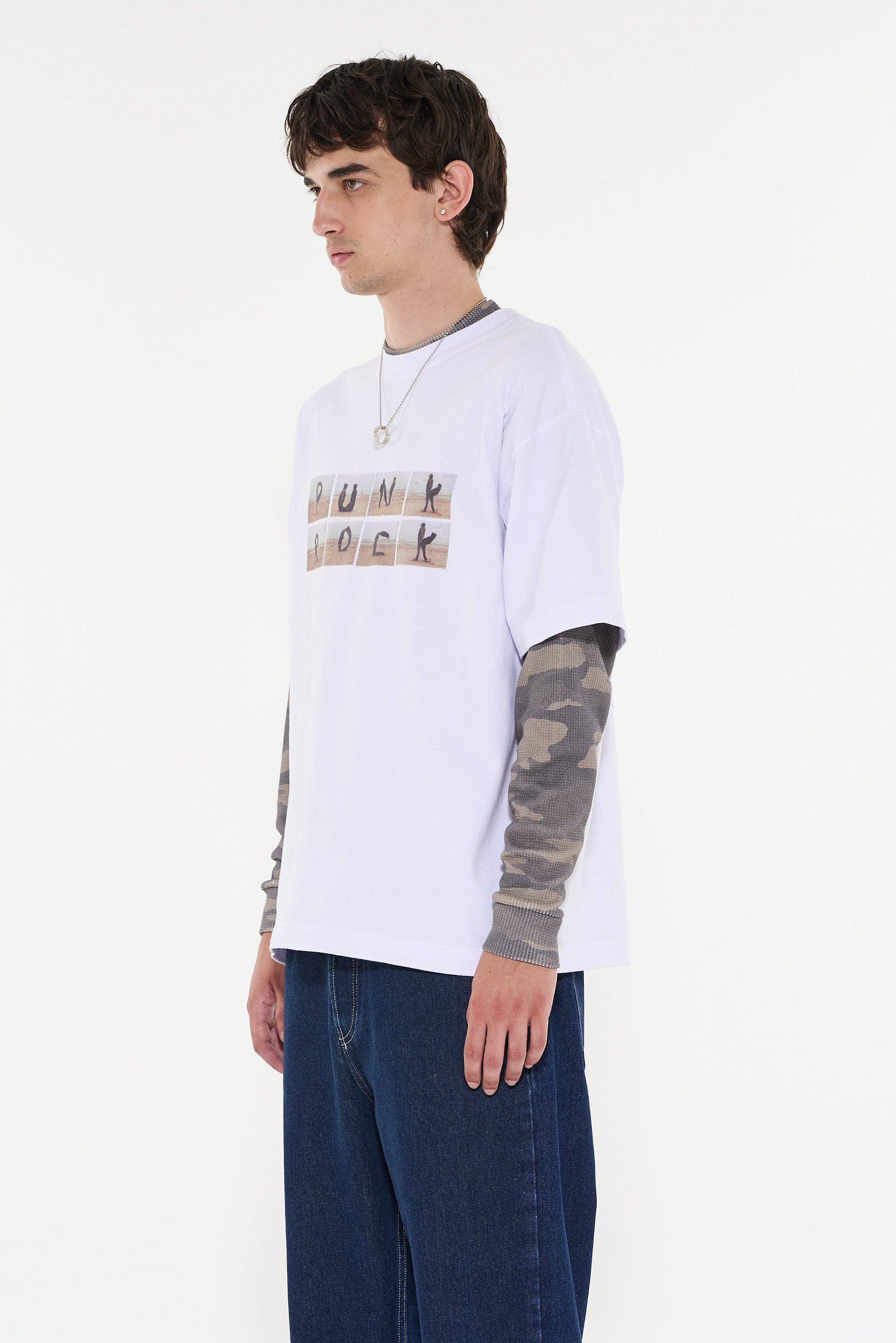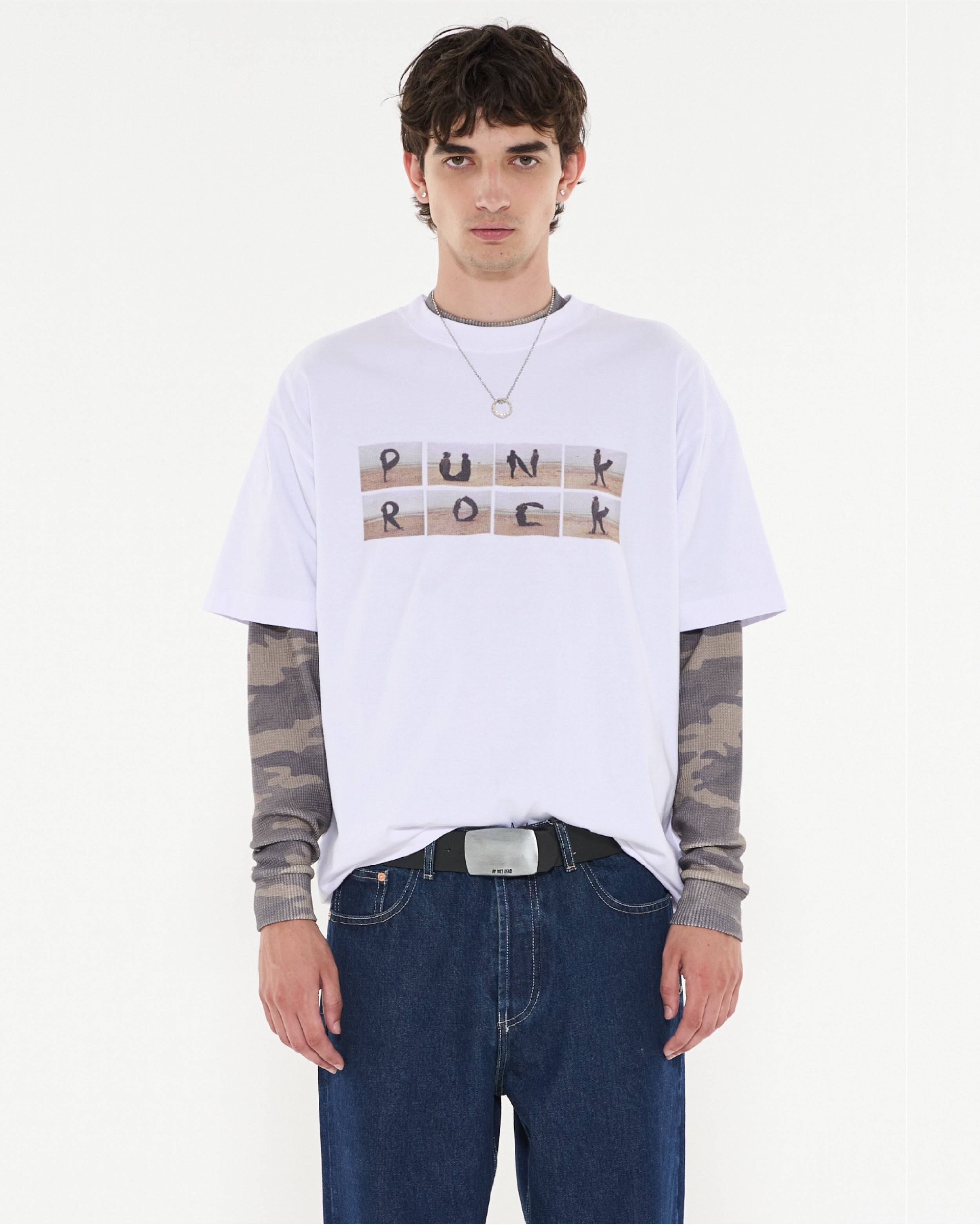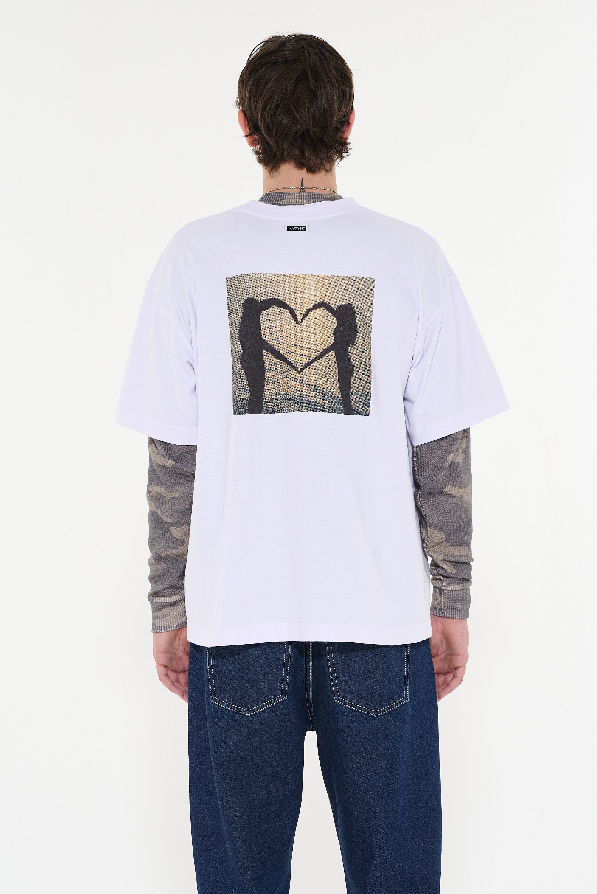 Remera manga corta de cuello redondo y calce oversize en jersey de algodón pesado. Estampa fotográfica en frente y espalda.