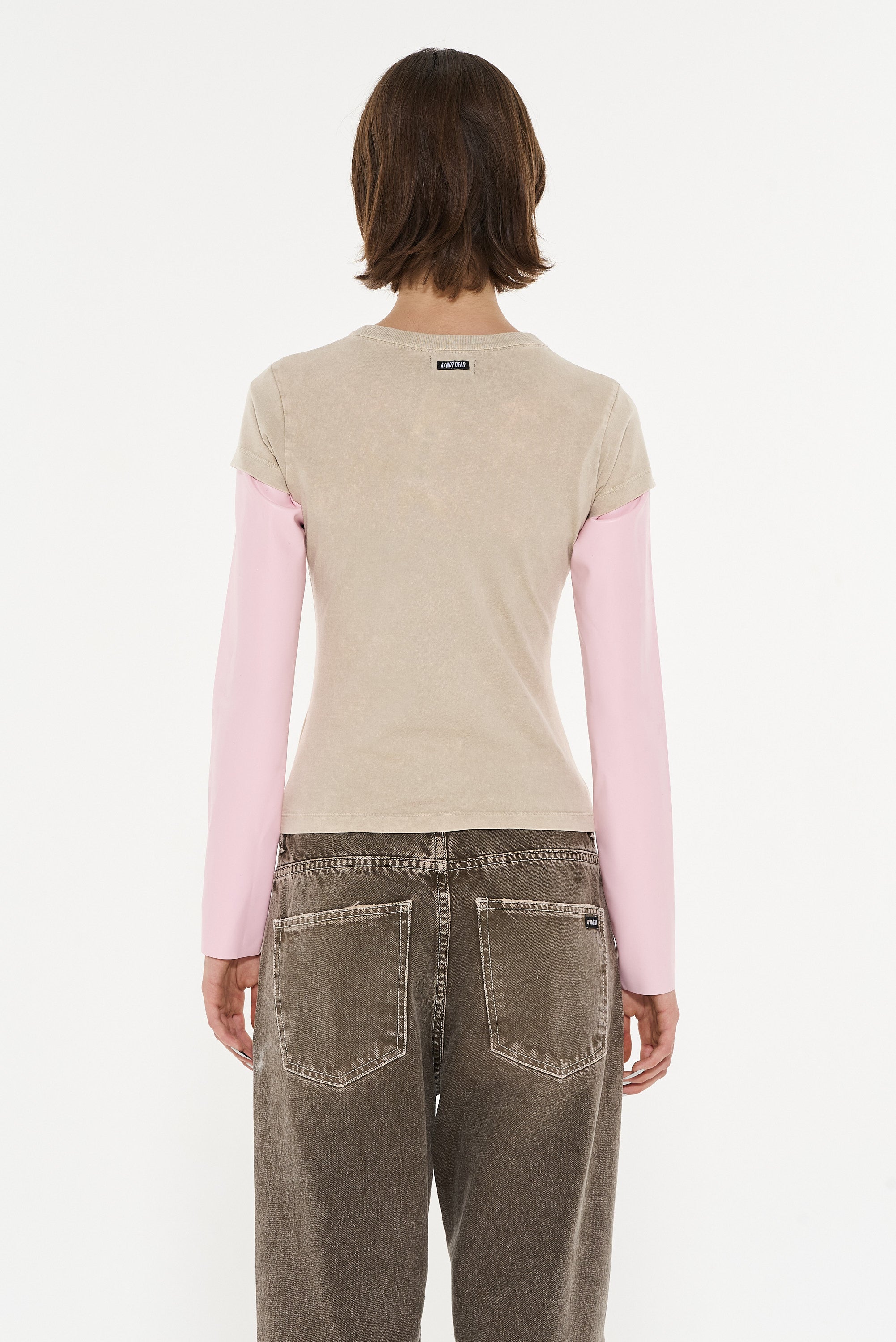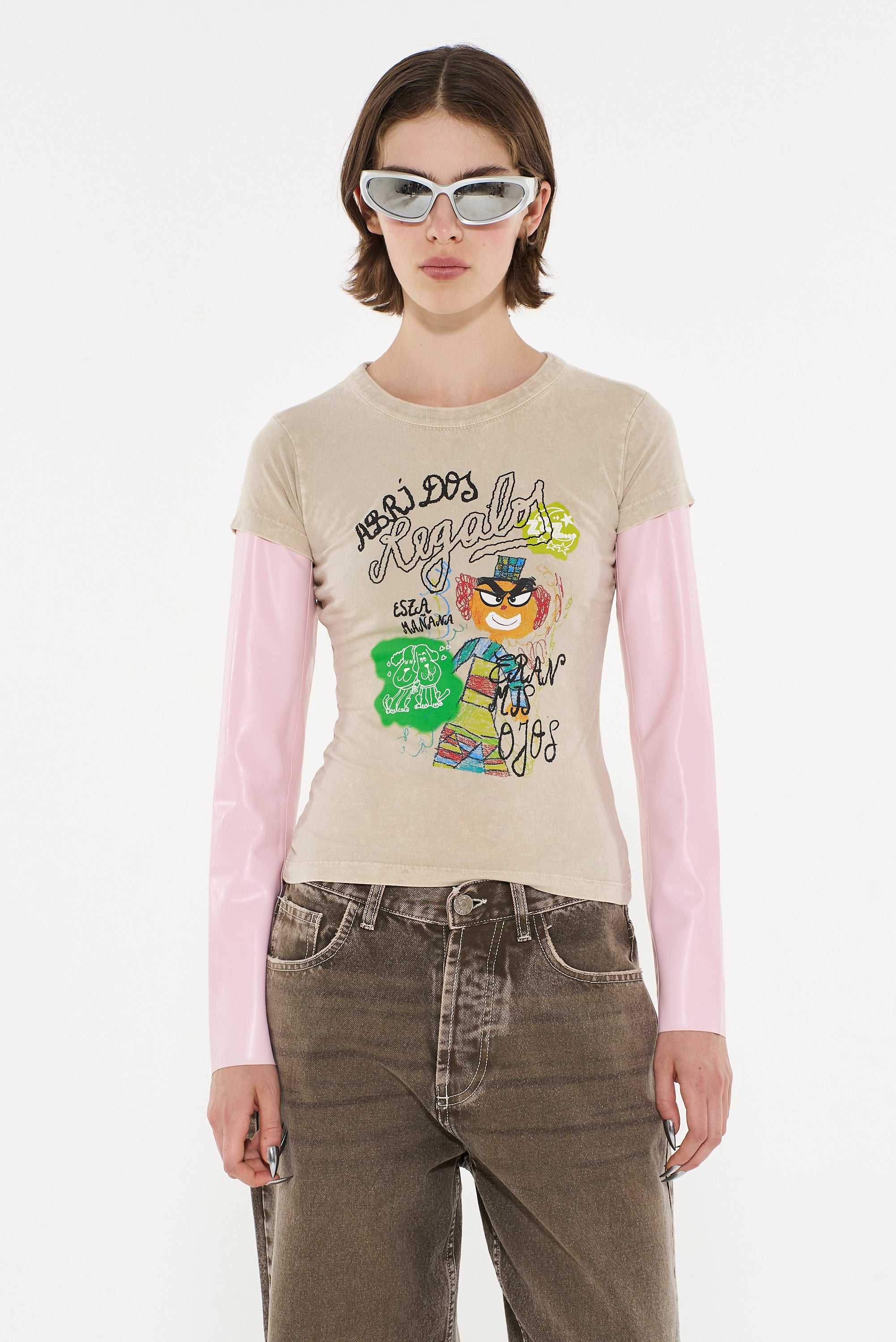 Remera manga corta con cuello redondo en jersey de algodón. Calce fitted con largo a la primer cadera. Gastado fade en prenda. Estampa en frente.