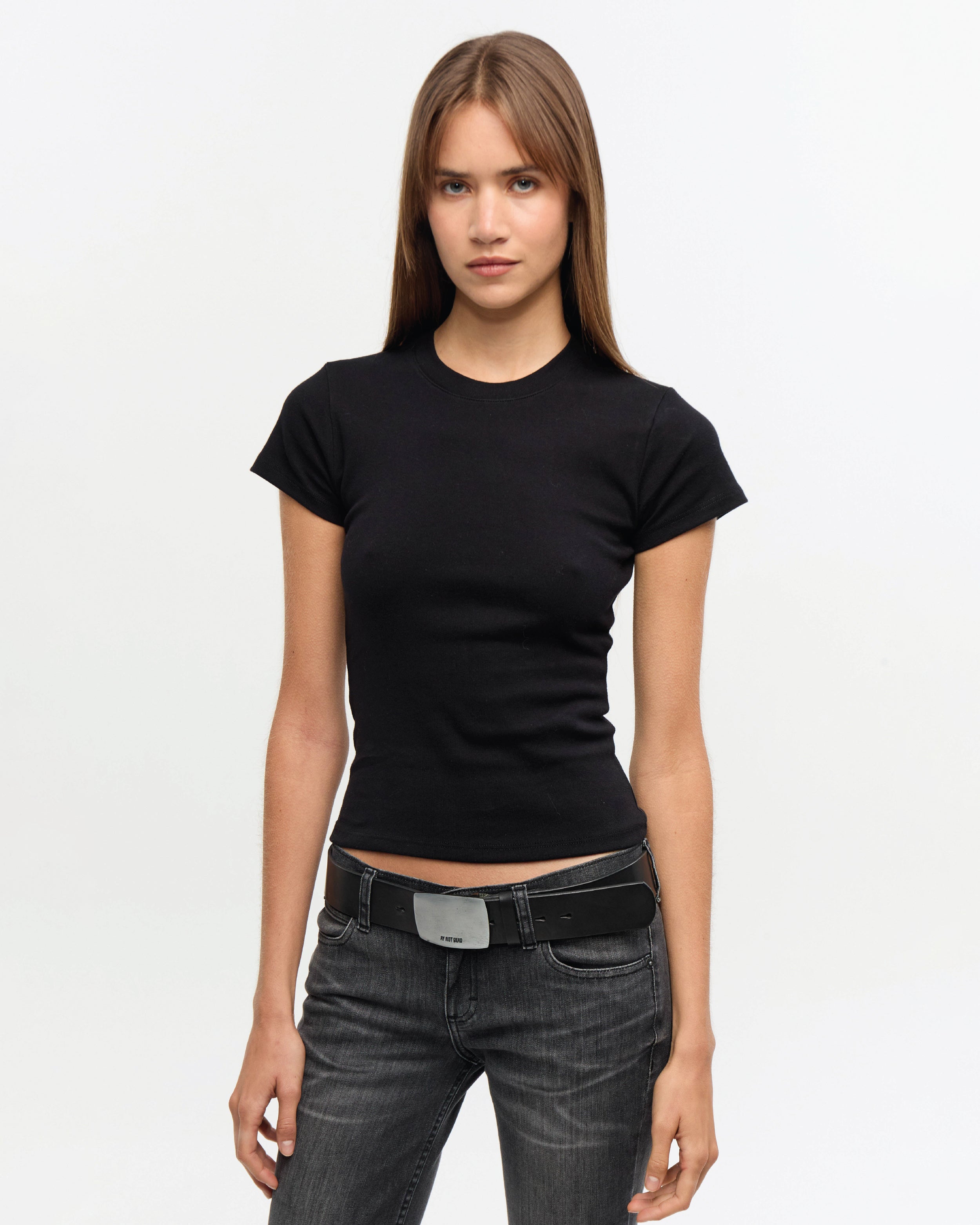 Remera manga corta con cuello redondo en rib de algodón. Calce fitted con largo a la primer cadera. Posee grifa de marca en espalda.