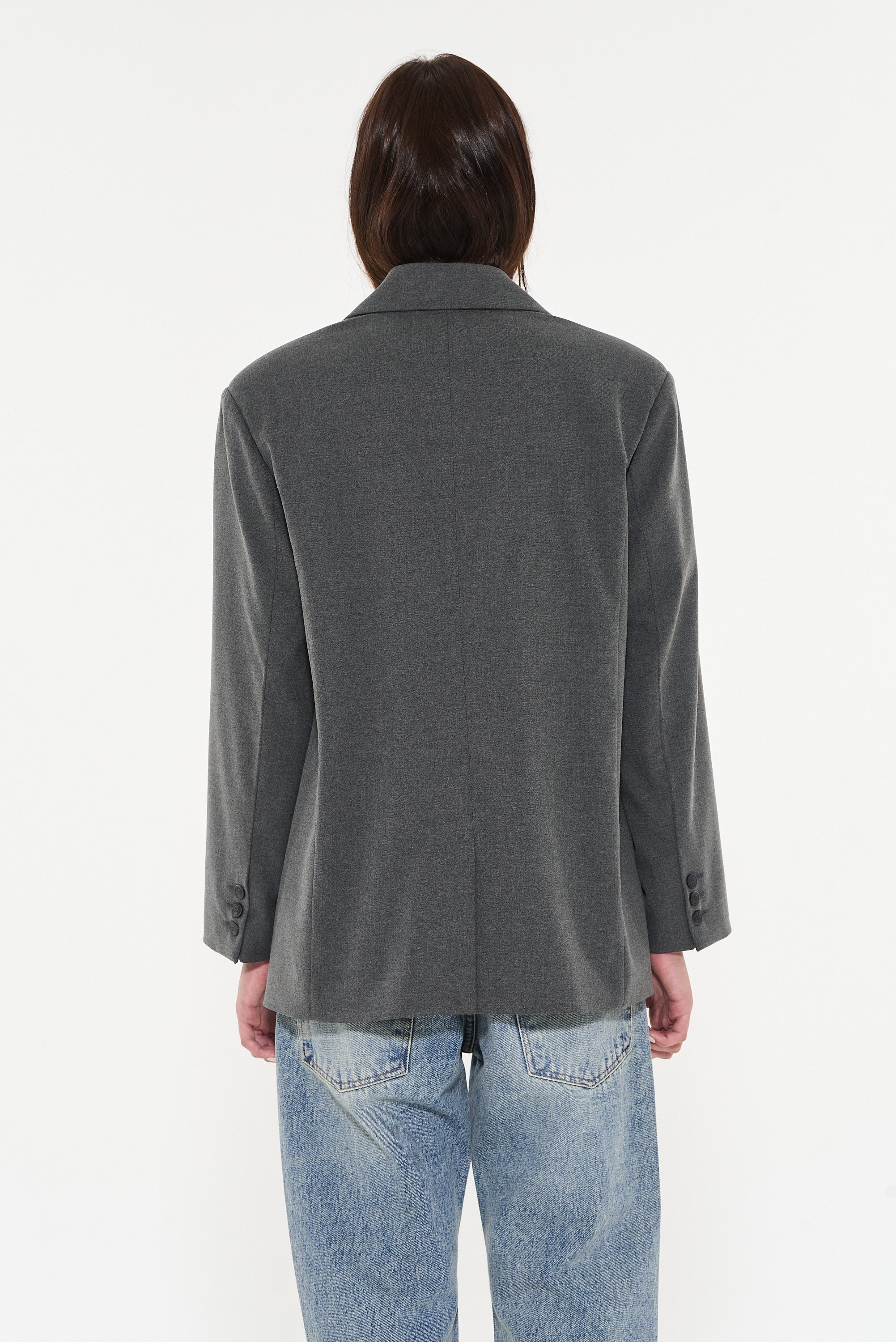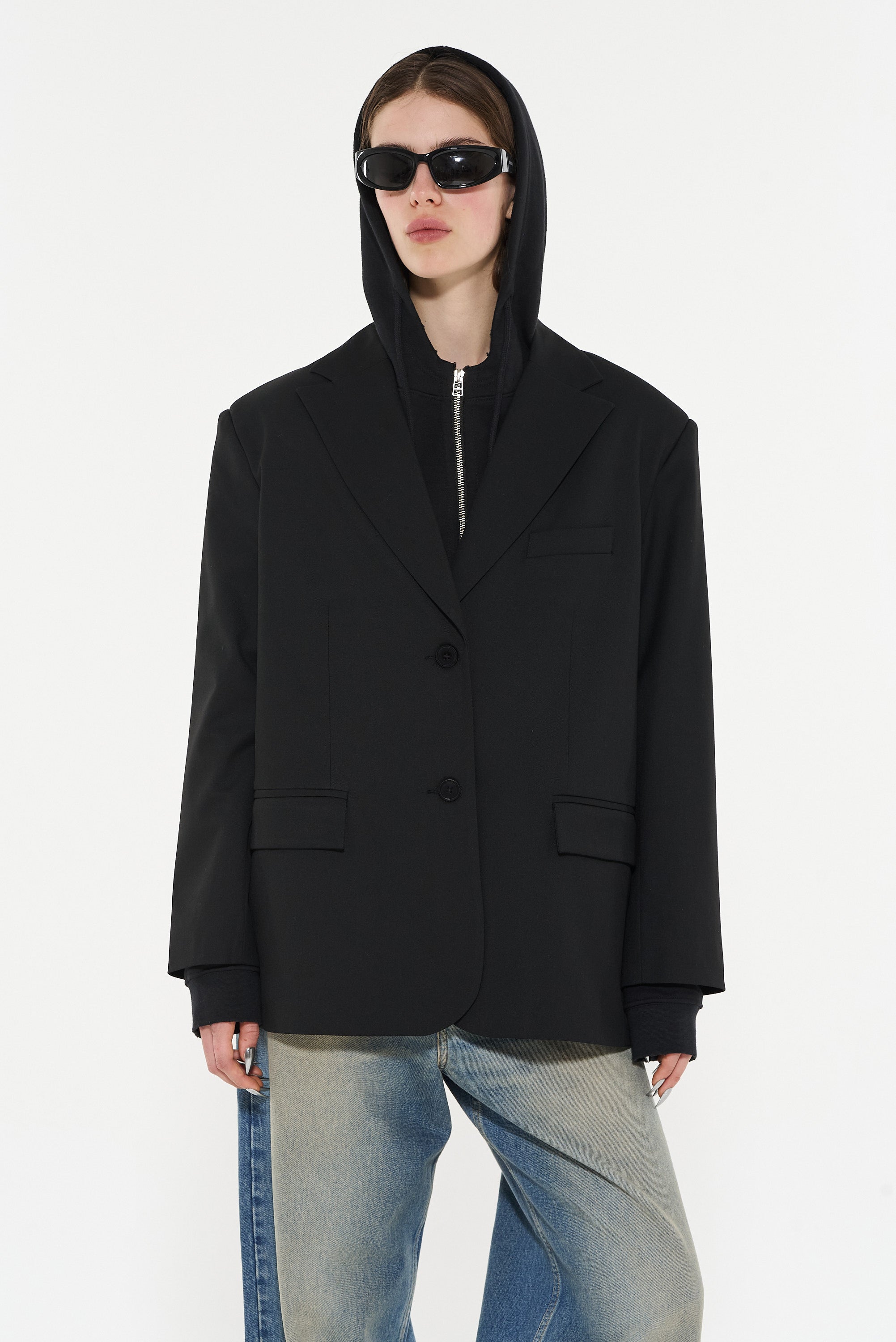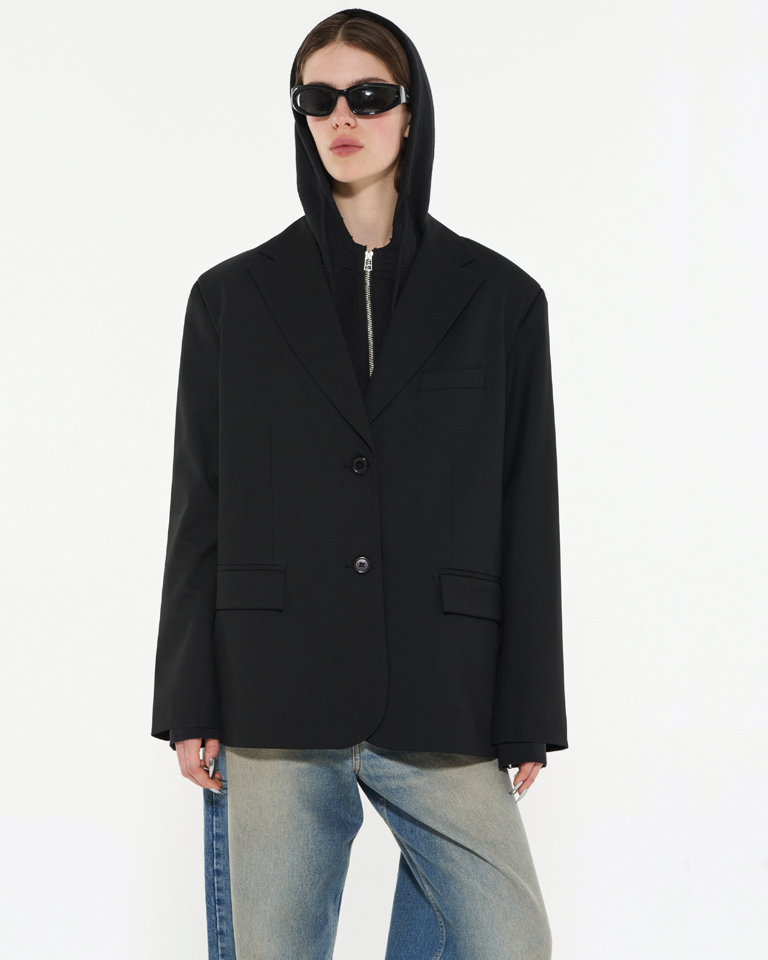 Saco sastrero oversize en sarga lisa. Bolsillos ojal con tapa en delantero y bolsillo sastre en pecho. Acceso delantero con botones personalizados. Tajo sastrero en bajo de espalda. Manga larga terminada en tajo con botones. Interior forrado con tafeta lisa negra.