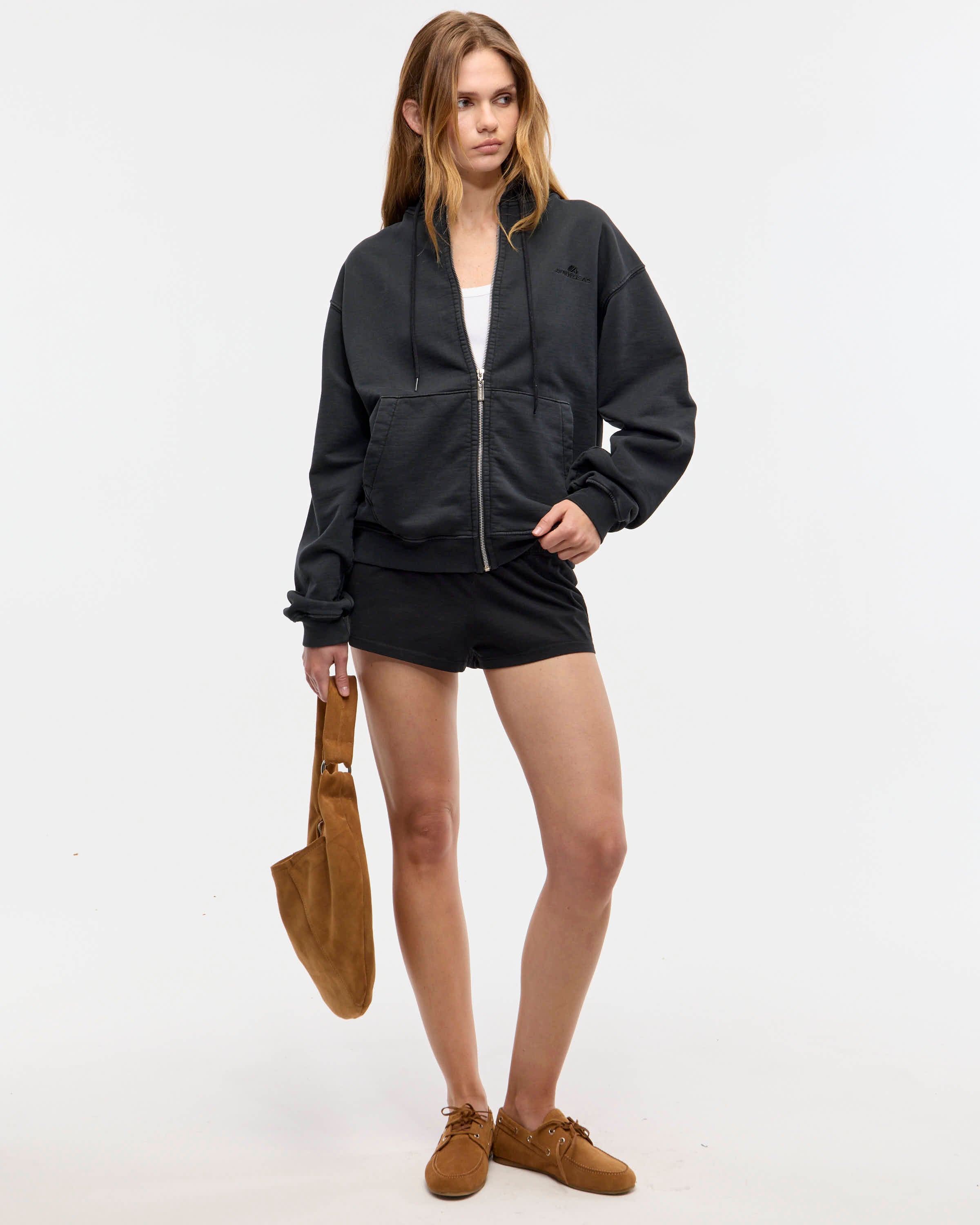 Short de jersey de algodón pesado. Tiro bajo con cintura elastizada. Teñido y gastado en prenda. Logo bordado al tono de la tela base sobre lateral, por arriba del ruedo.