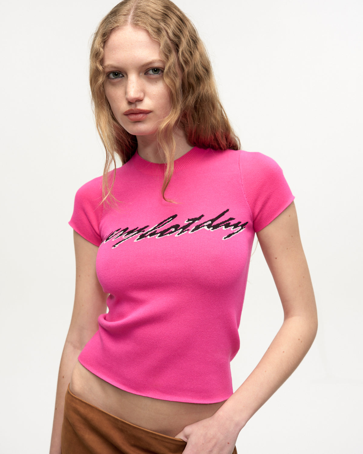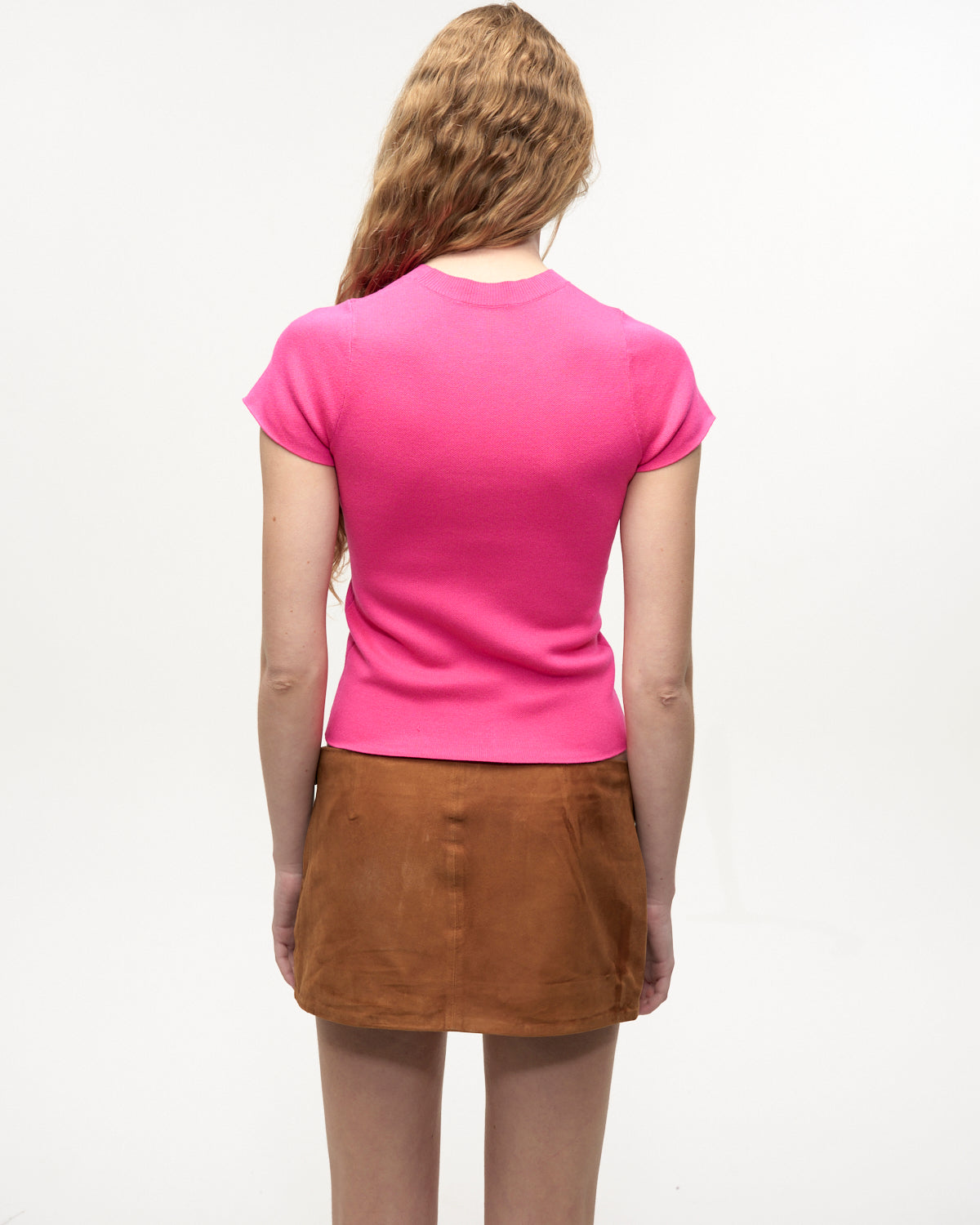 Top tejido con escote redondo. Calce al cuerpo con largo a la primer cadera y manga corta regular. Dibujo jacquard ´A very hot day'.