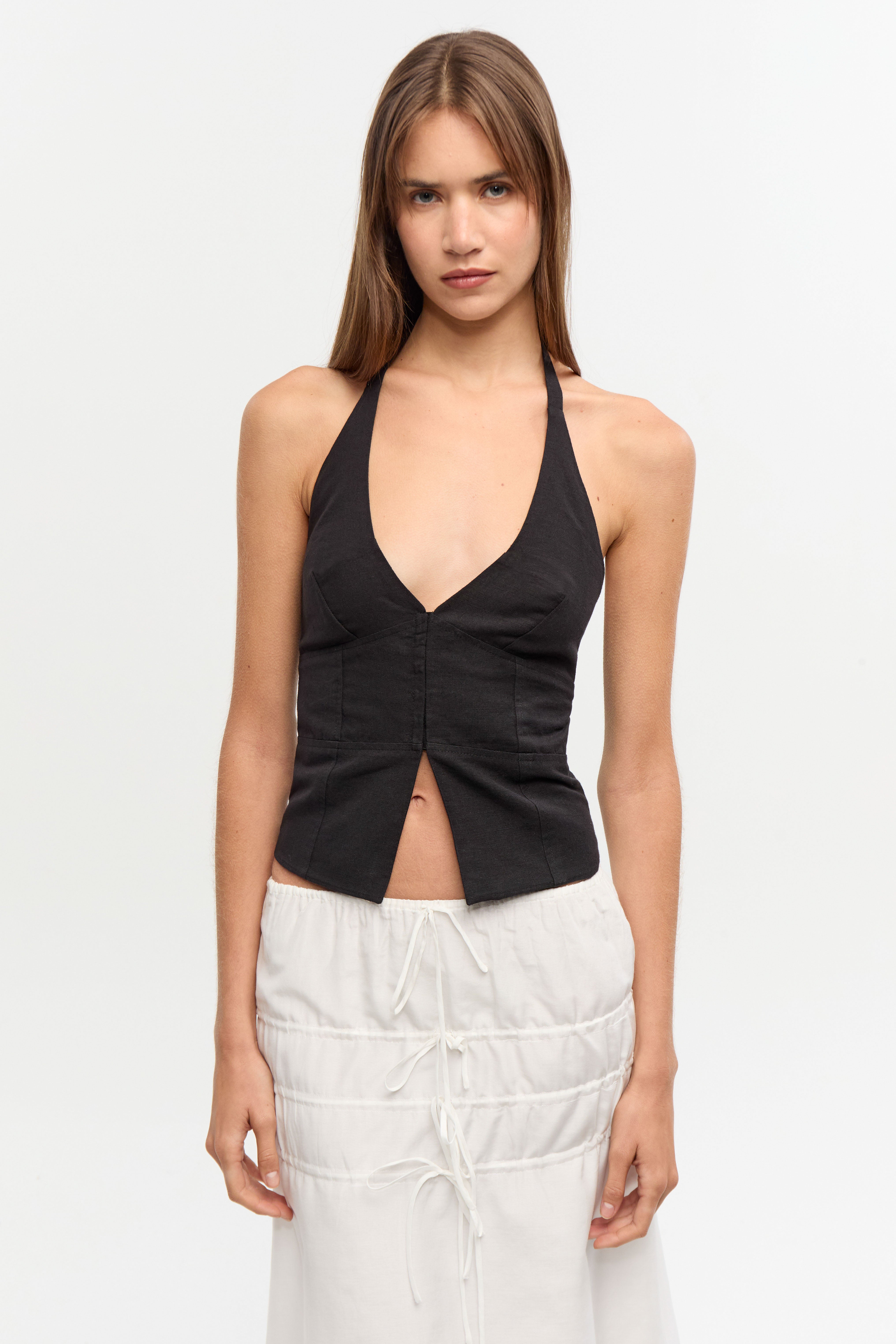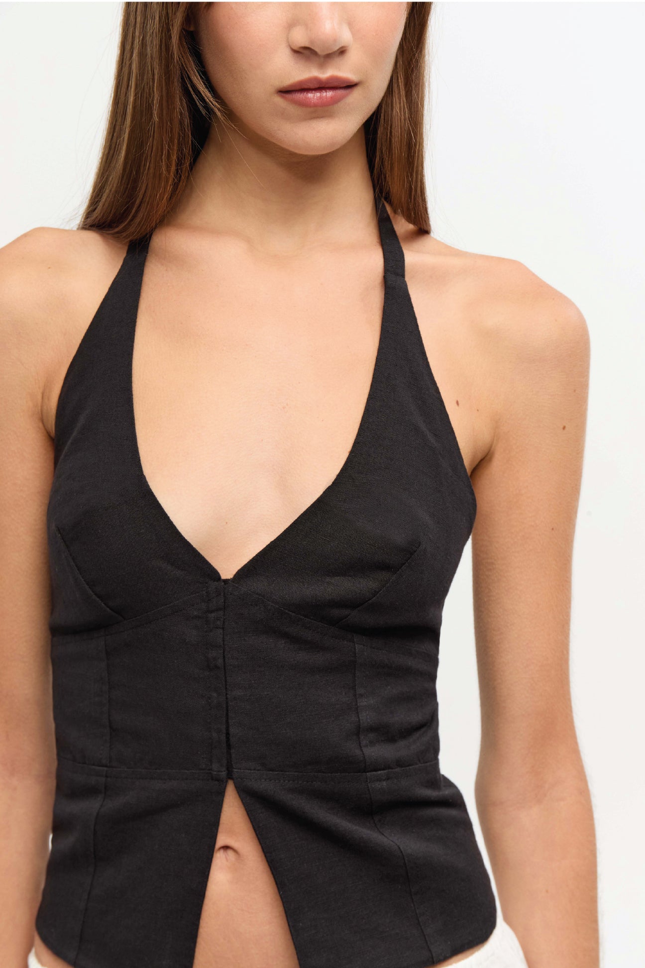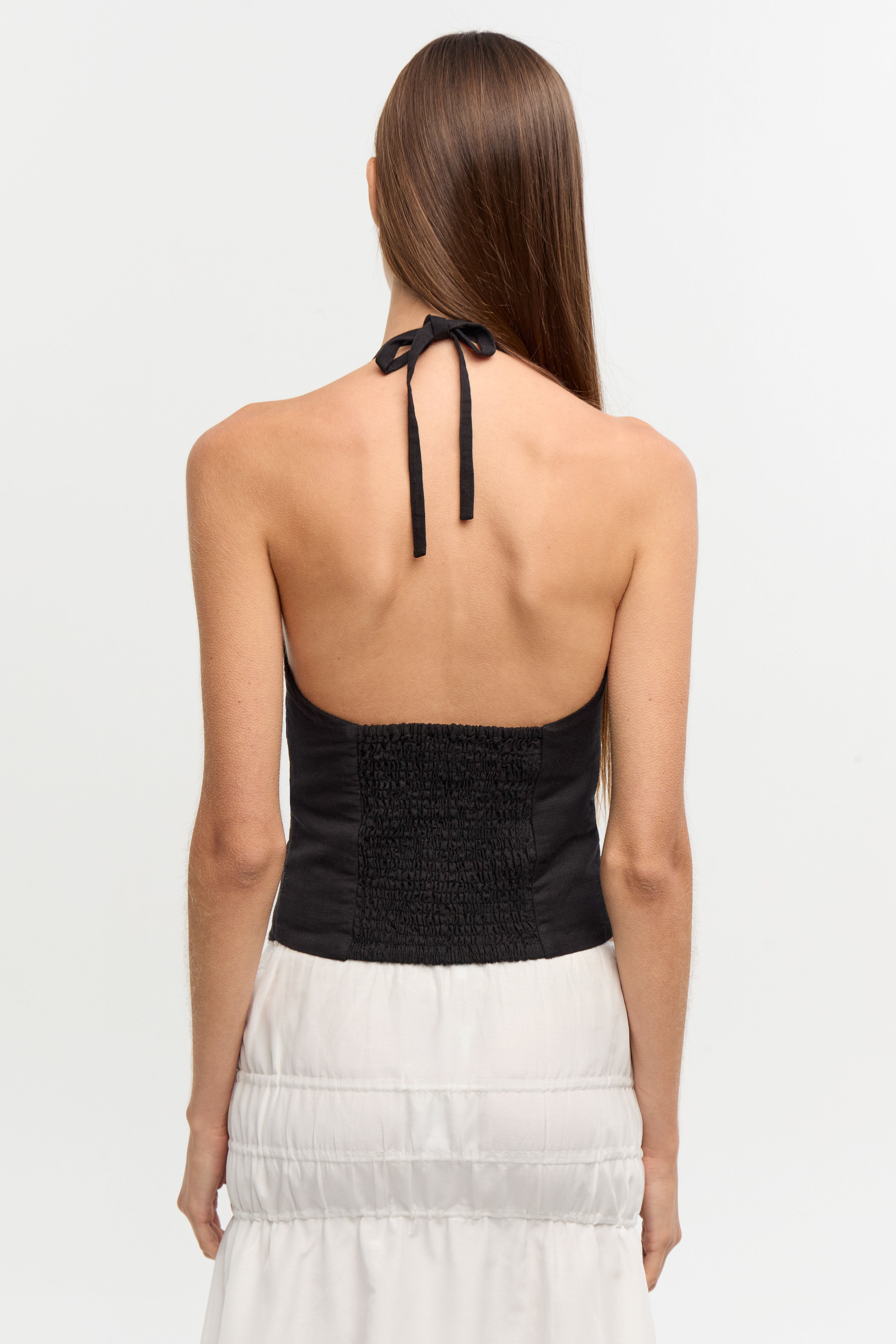 Top confeccionado en lino con algodón. De escote halter que se anuda al cuello, calce fitted y largo a la primera cadera. Con recortes, espalda elastizada con punto smock y acceso mediante ganchos corseteros en el centro delantero.