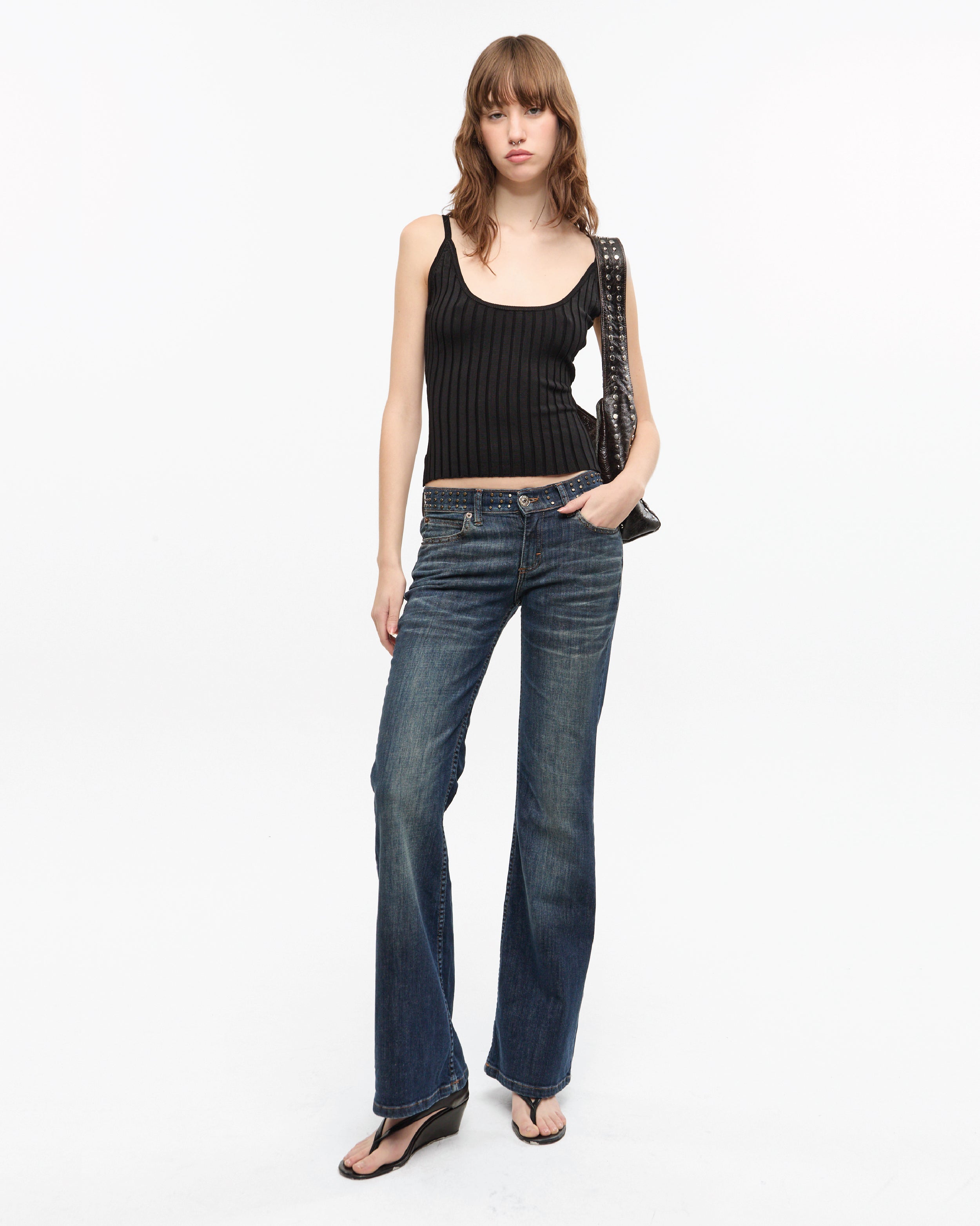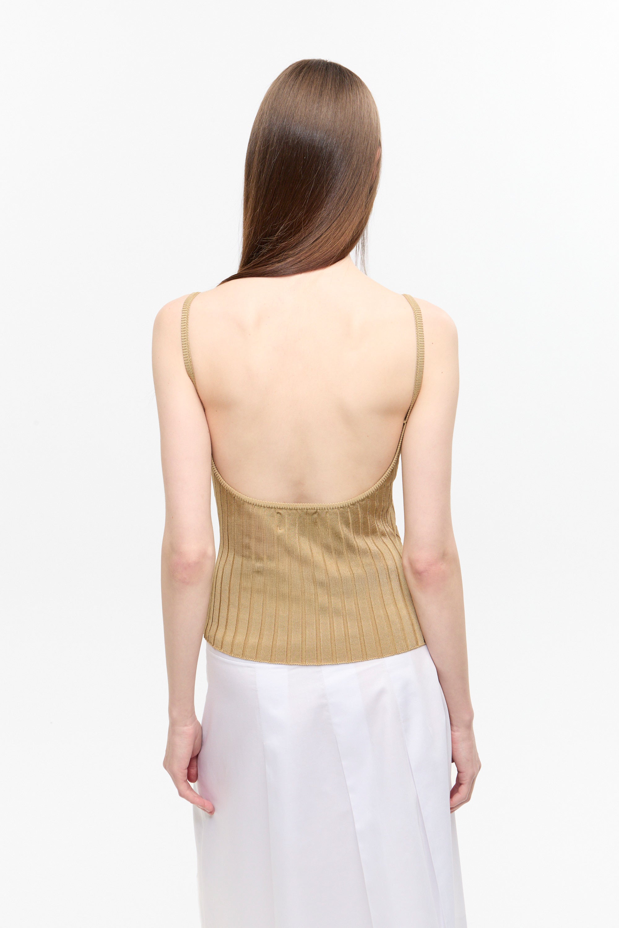 Top escote redondo profundo, tejido en punto acanalado ancho. Con breteles y espalda algo descubierta. Calce al cuerpo con largo a la primer cadera.