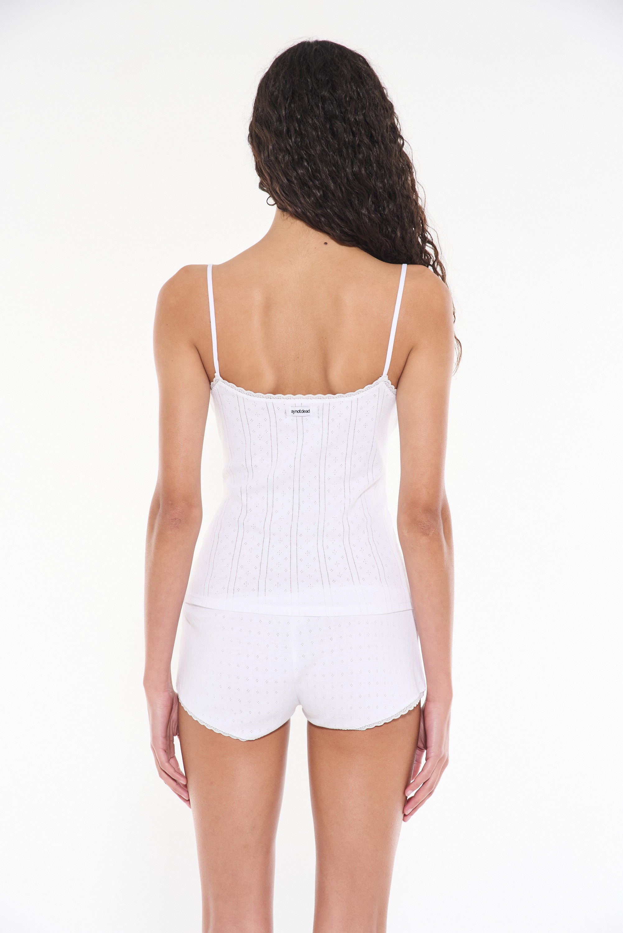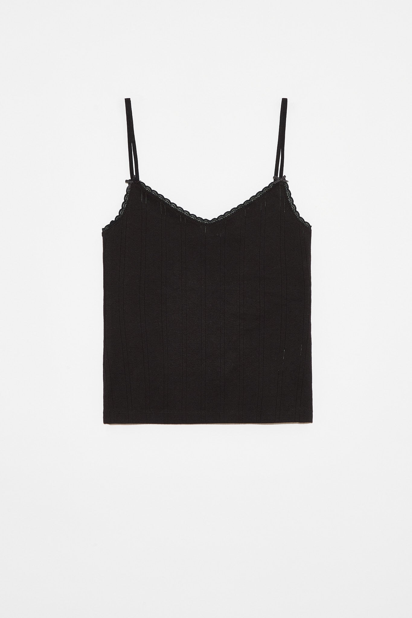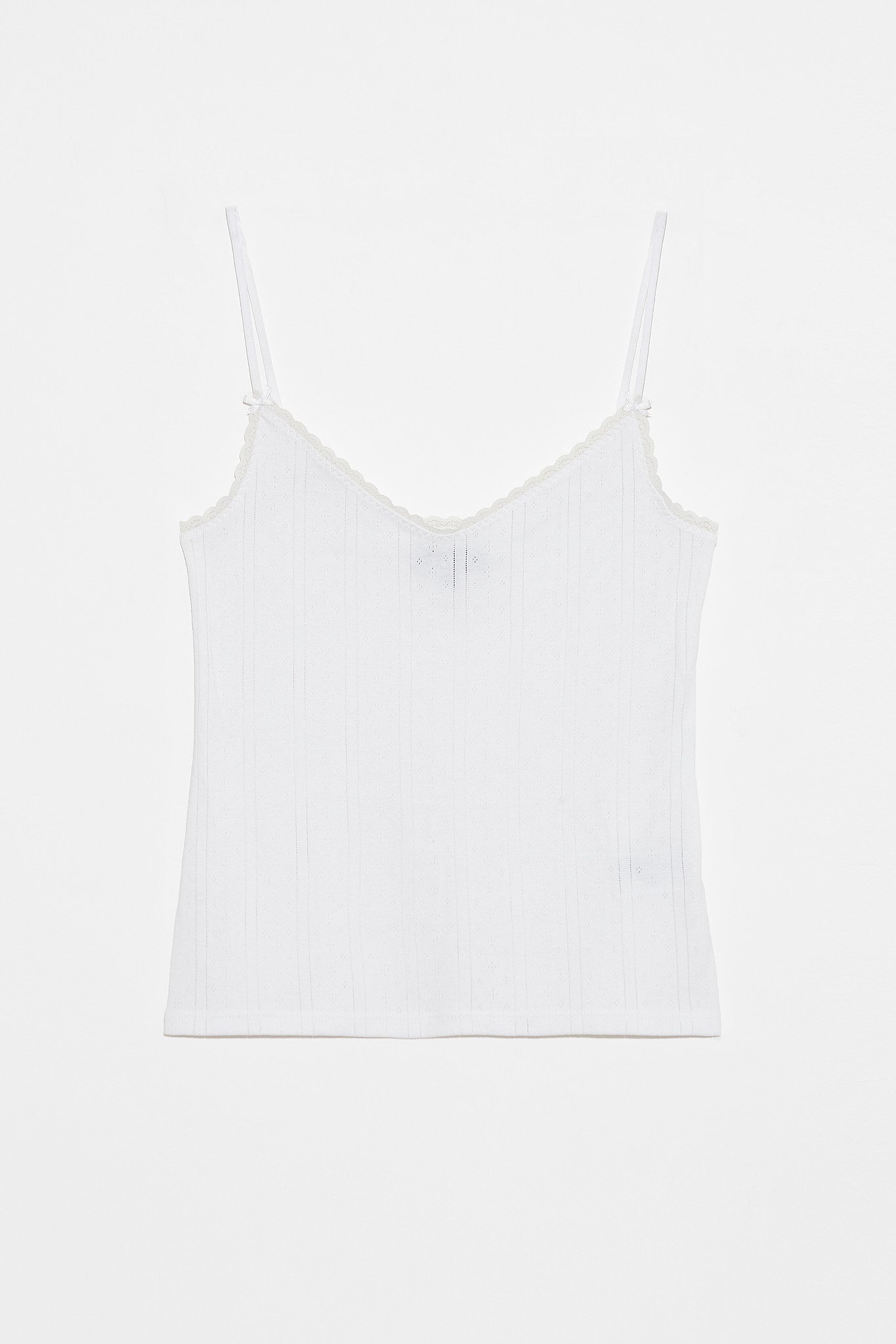 Top musculosa en jersey desagujado, tipo 'pointelle'. De calce al cuerpo y largo a la cadera, con detalle de puntilla de encaje en escote.