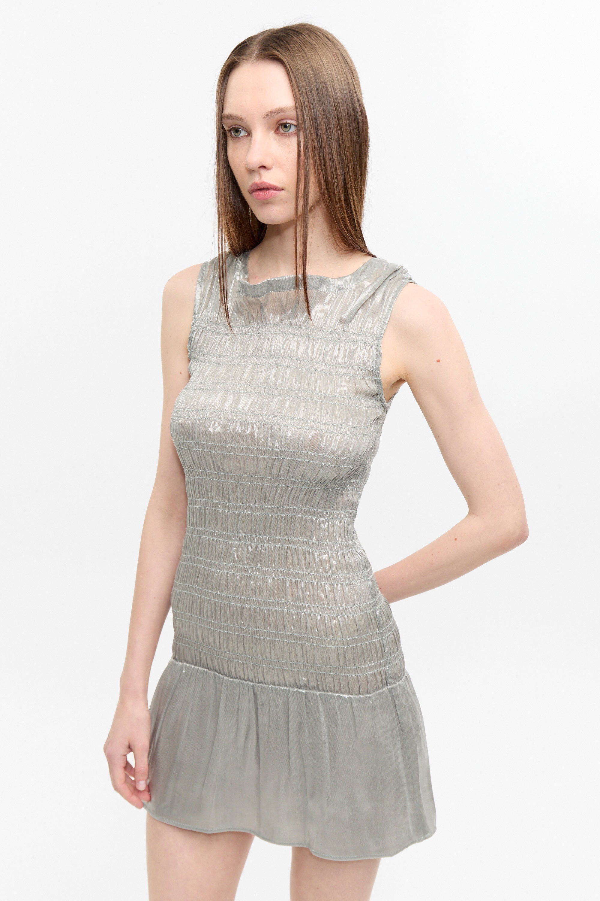 Vestido corto, sin mangas, confeccionado en seda con lurex. De calce fitted generado por punto smock en el delantero y en la espalda. Con recorte en la cadera y falda con vuelo. Acceso mediante gota y botón al tono en el centro de la espalda.