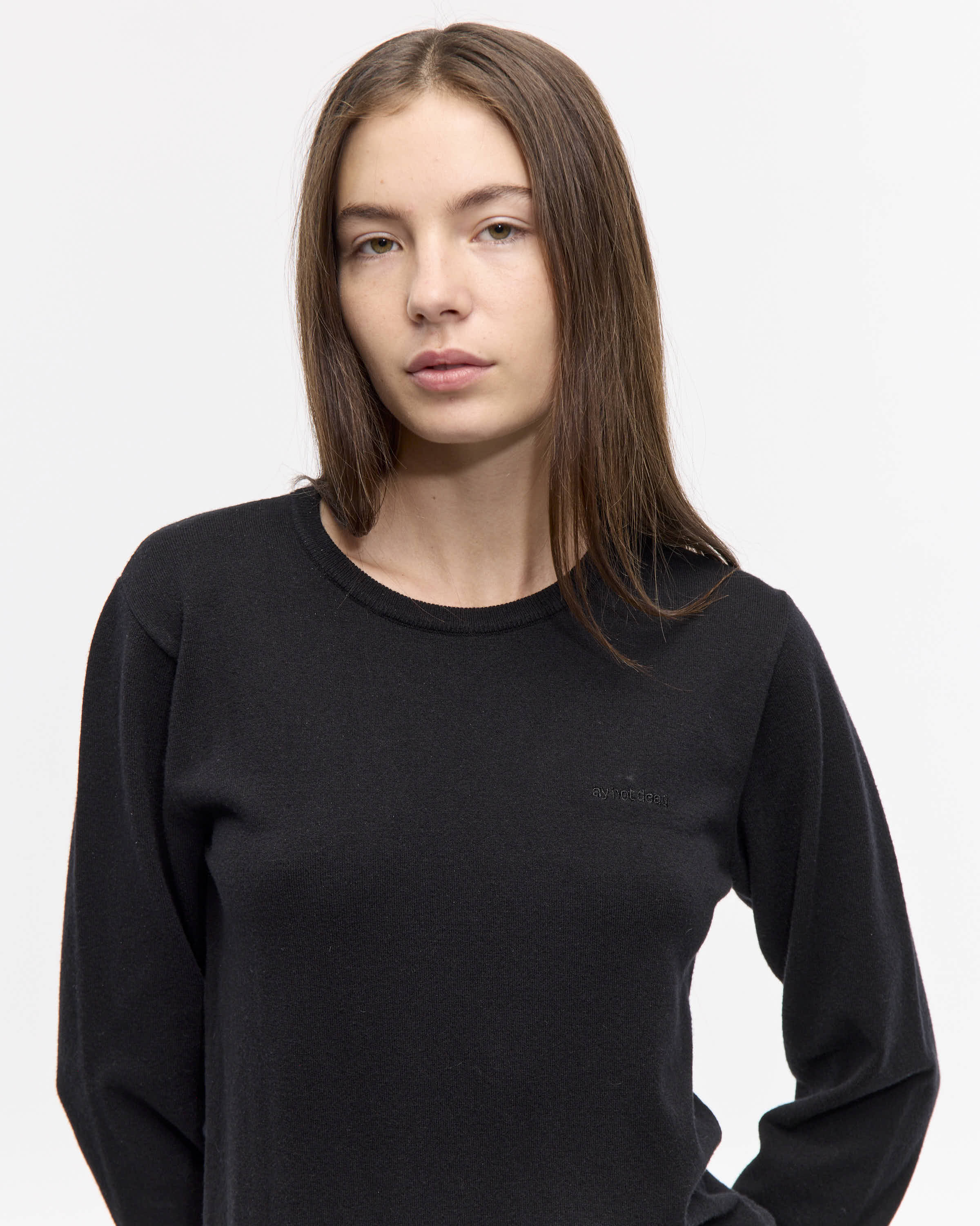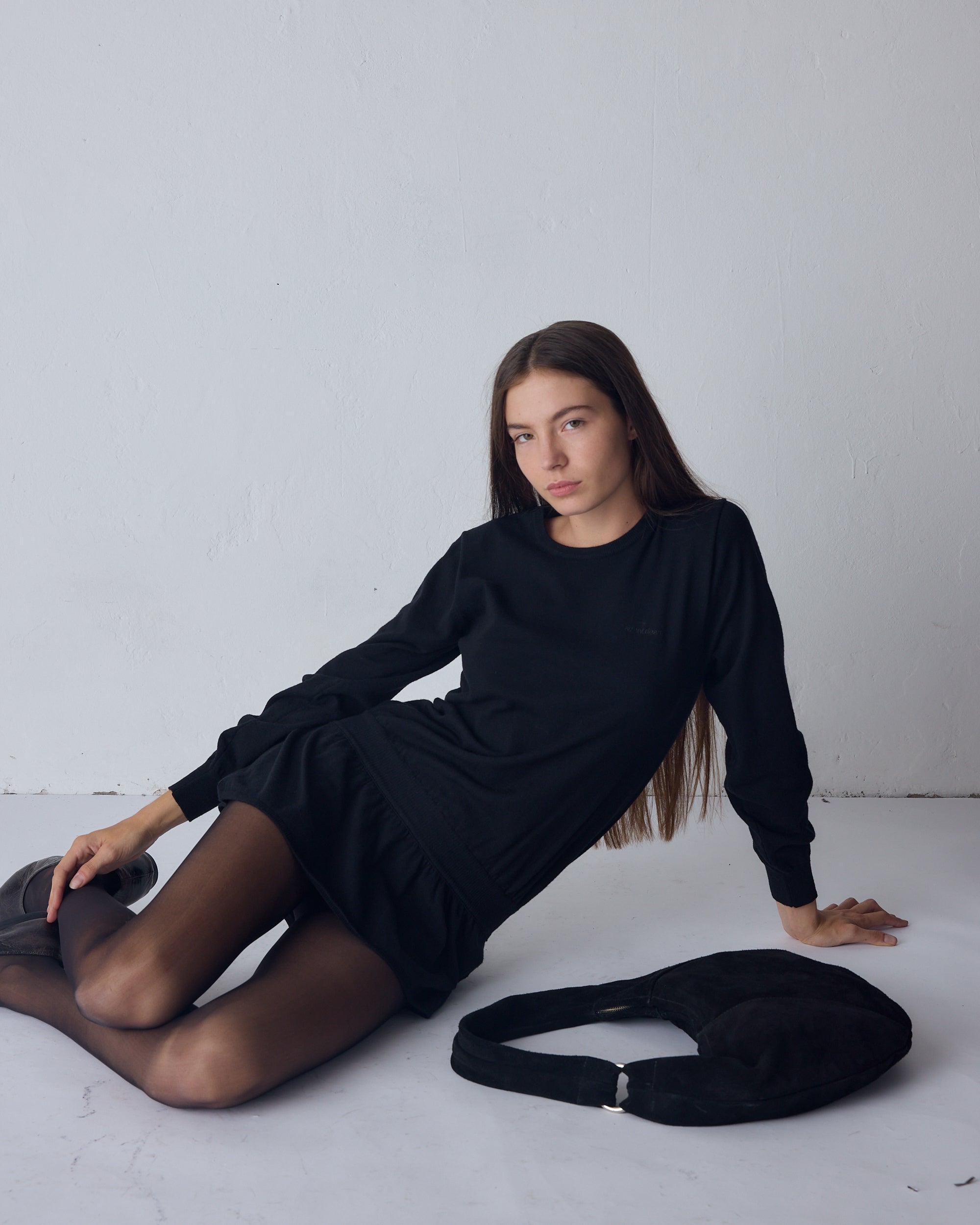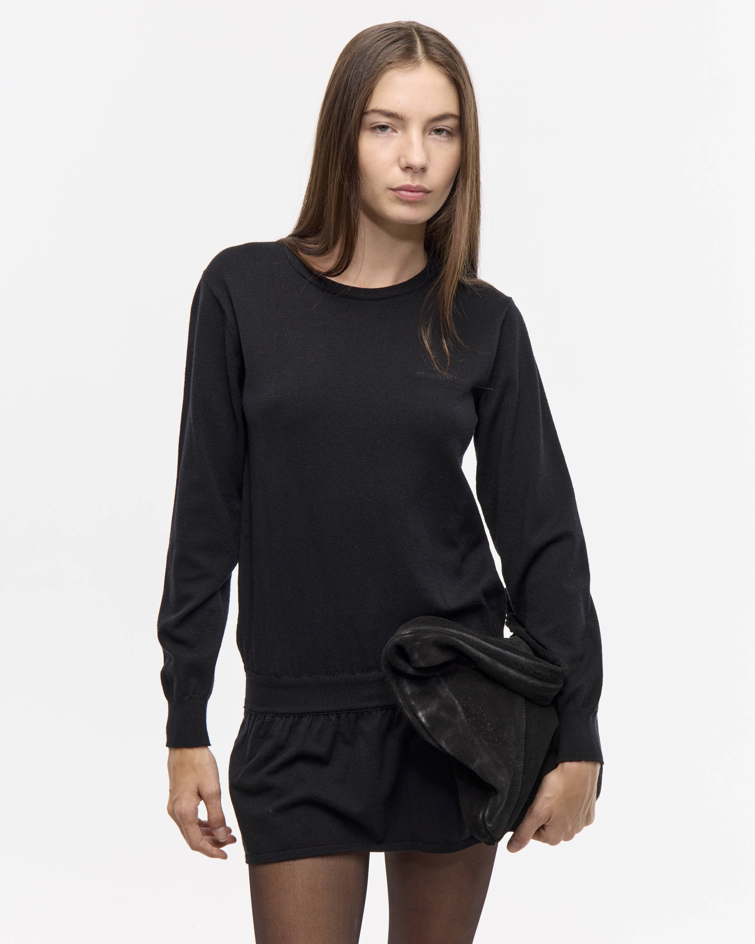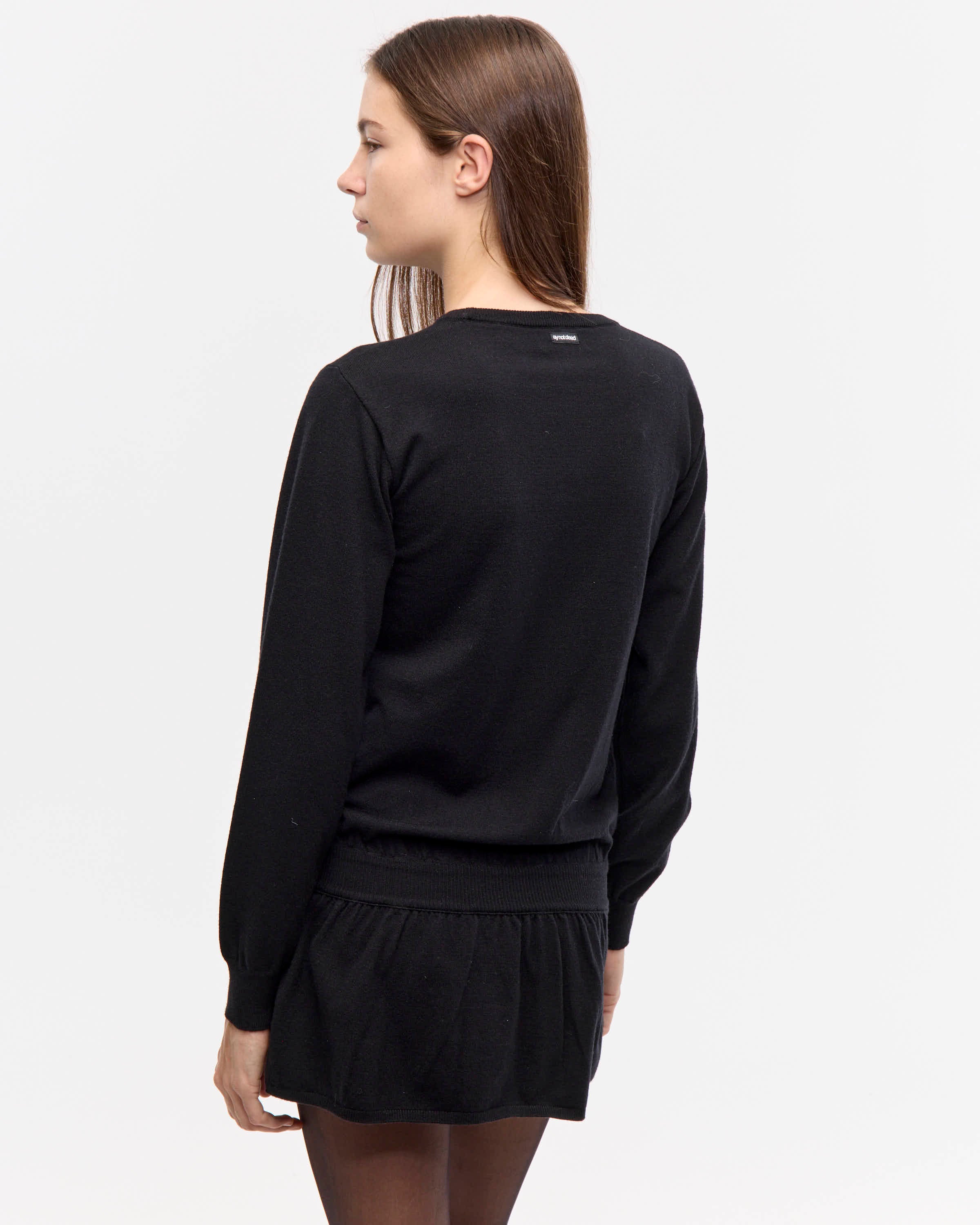 Vestido corto tejido, con silueta clásica y detalle fruncido en falda. Presenta escote redondo, manga larga y cintura marcada con elasticidad que aporta volumen suave en la parte inferior. Cuello, puño de mangas y cintura en ribb. Logo de marca bordado a tono en delantero y grifa de marca en espalda.