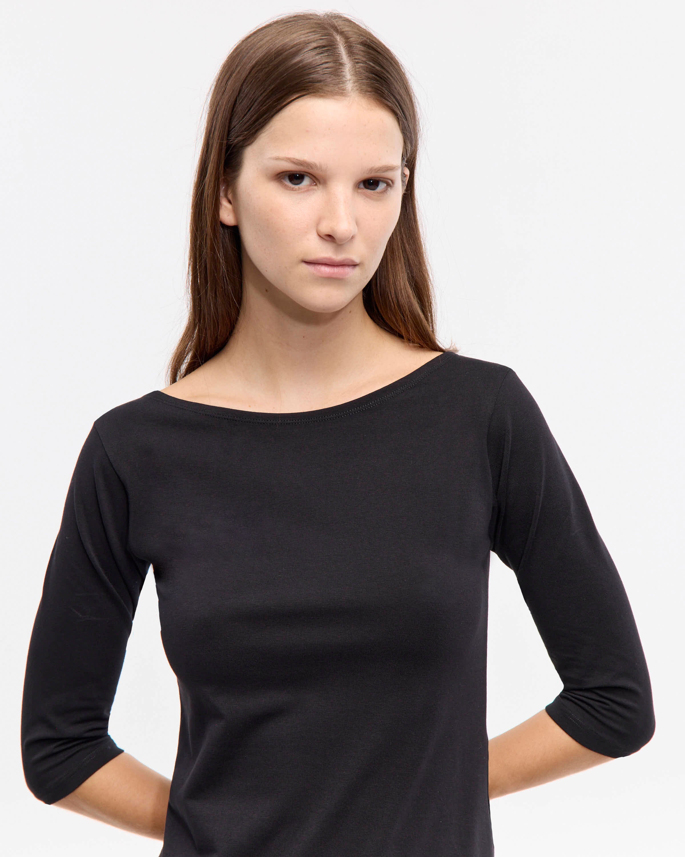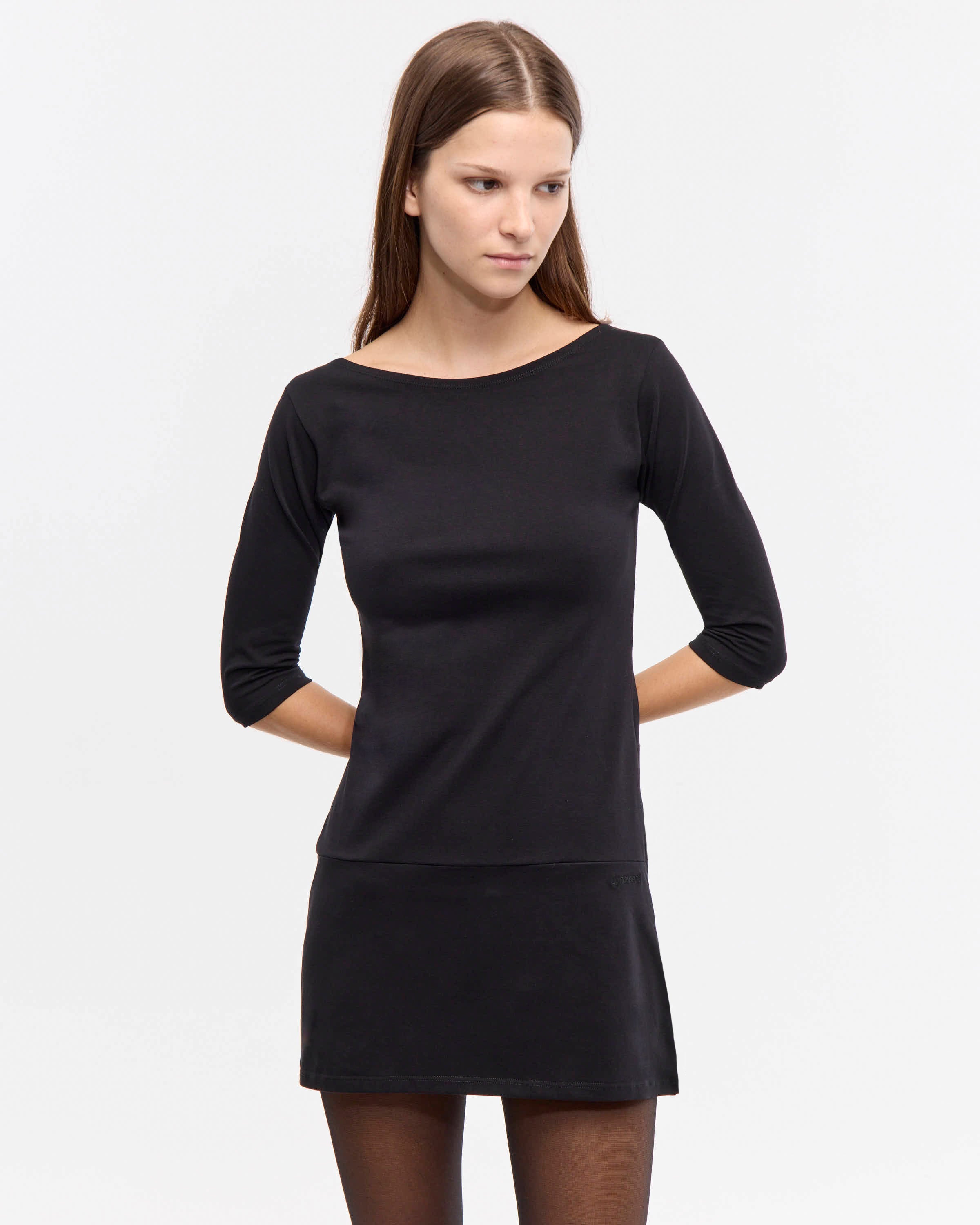 Vestido corto de cuello bote y mangas 3/4. Posee recorte en la cintura con logo bordado de marca. Confeccionado en algodón con elastano. De calce regular fit.
