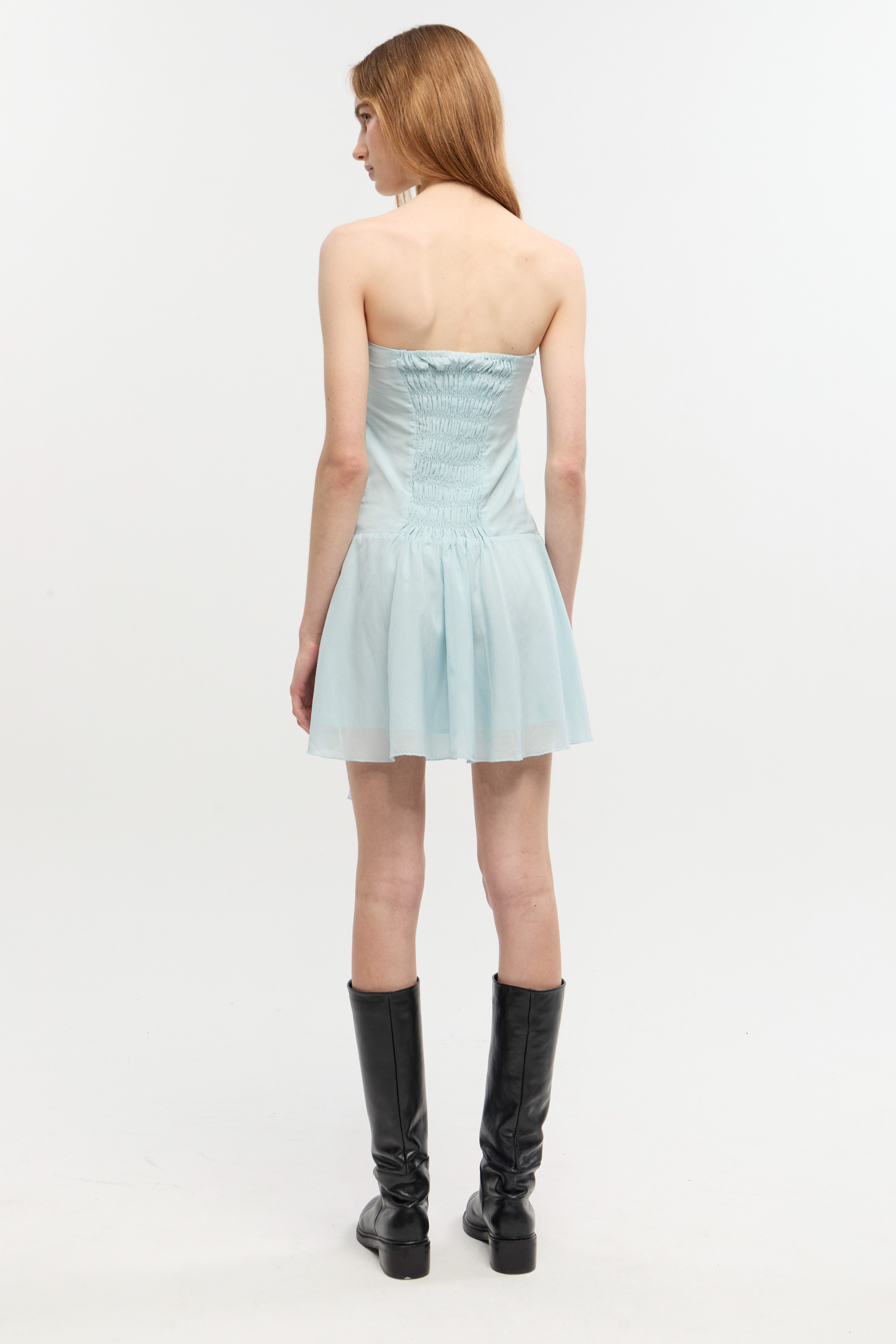 Vestido corto strapless confeccionado en tela de plano de algodón con viscosa. De calce fitted, con recorte de punto smock en la espalda. Con elástico embutido en el escote, recorte en la cadera y falda irregular terminada con roulotté.