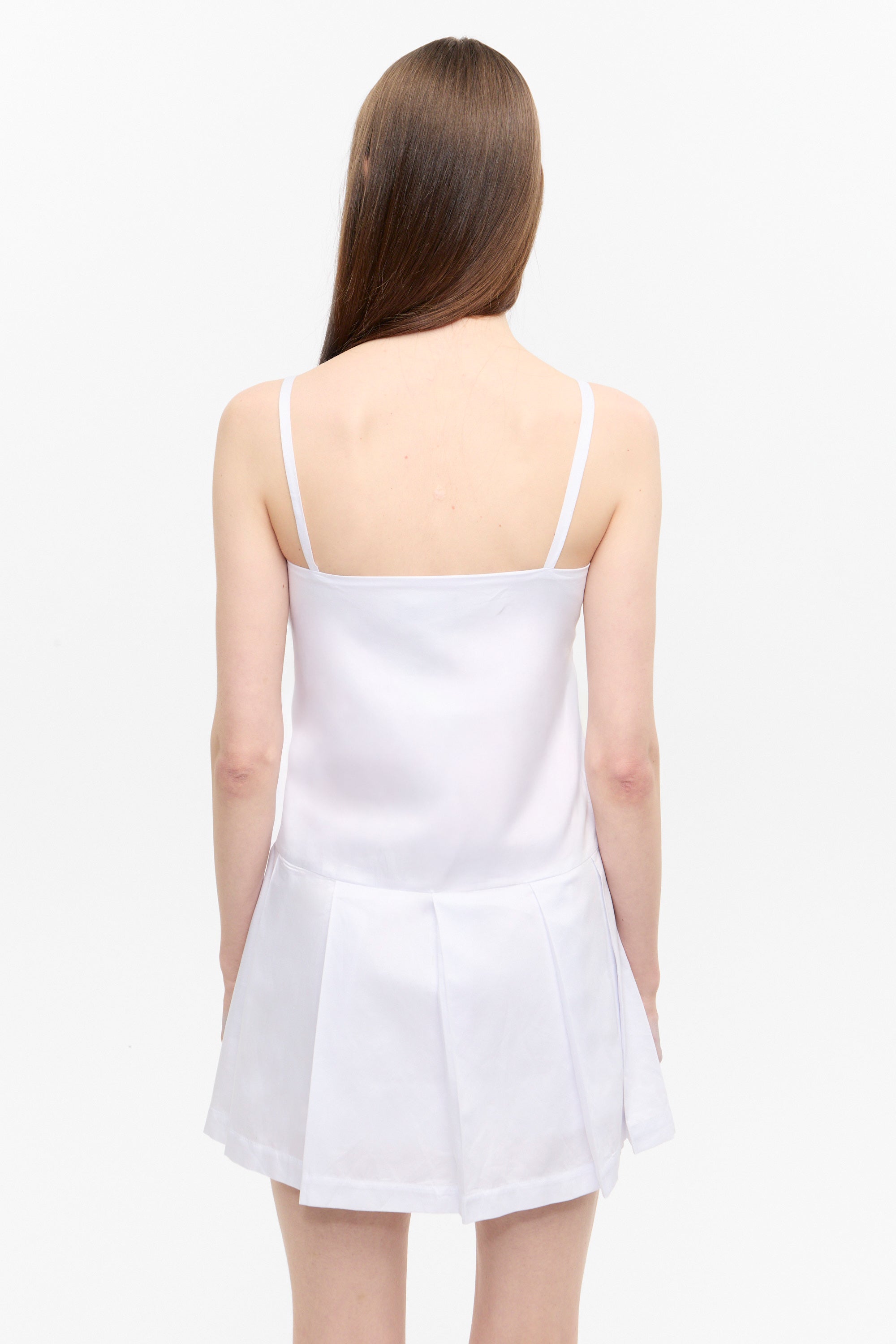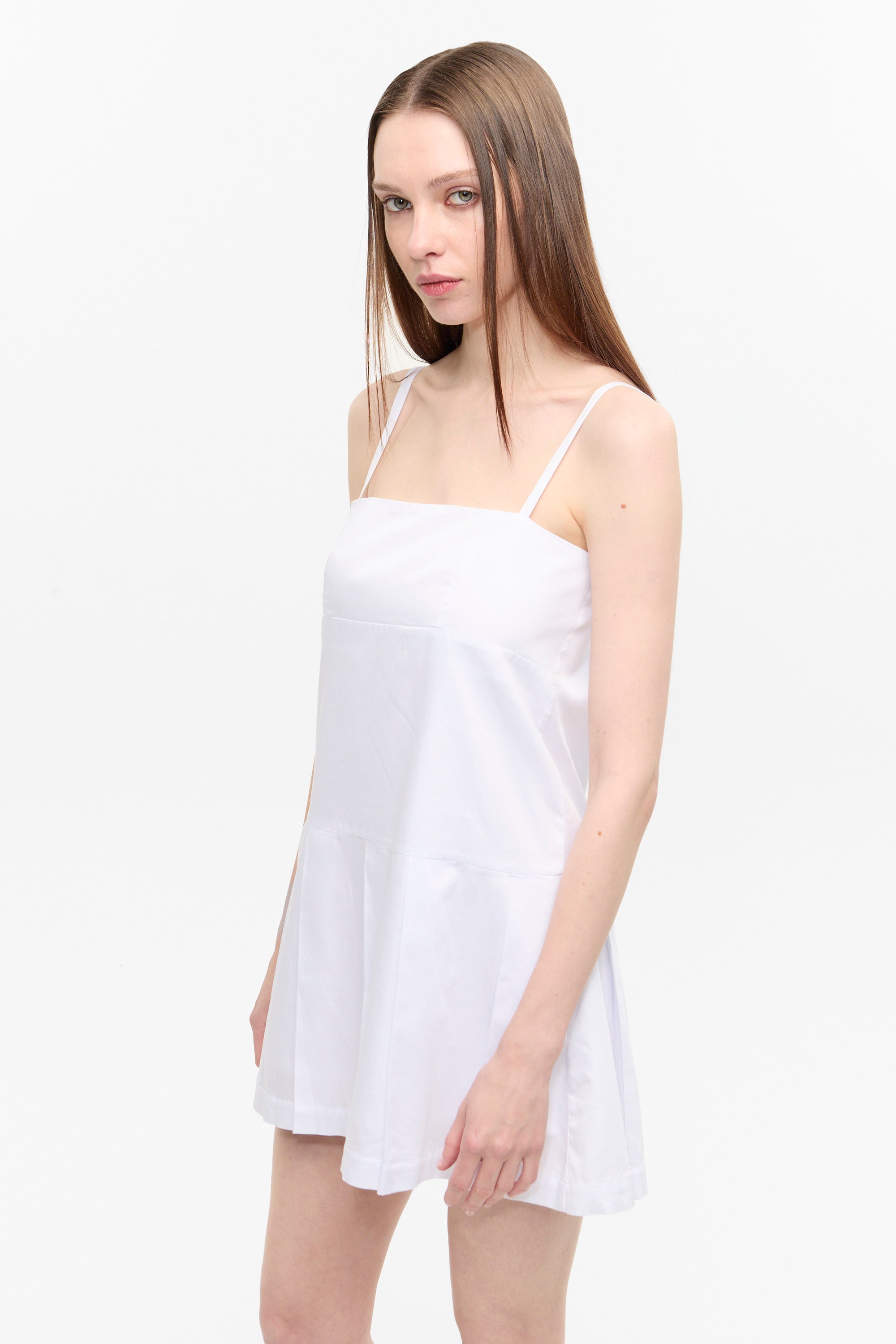 Vestido corto confeccionado en poplín. De escote recto, con breteles, falda tableada y acceso lateral a través de cierre invisible.
